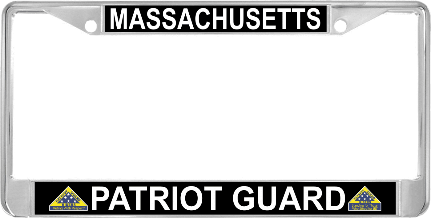 This Massachusetts Patriot Guard Automobile License Plate Frame is proudly produced at our facility in Scottsboro, Alabama. Each Chrome Dipped Alloy Frame has Poly Coated Aluminum Inserts which allow our production team to provide you with High Quality Designs. Unfortunately, this frame is not offered as a Motorcycle Frame.Please check with your state and local regulations regarding suitability for displaying this Automobile License Plate Frame on your vehicle since these regulations may have changed in your state. Various weather and road conditions may impact the life span of your frame e.g. salted roads, long exposure to direct sunlight etc.