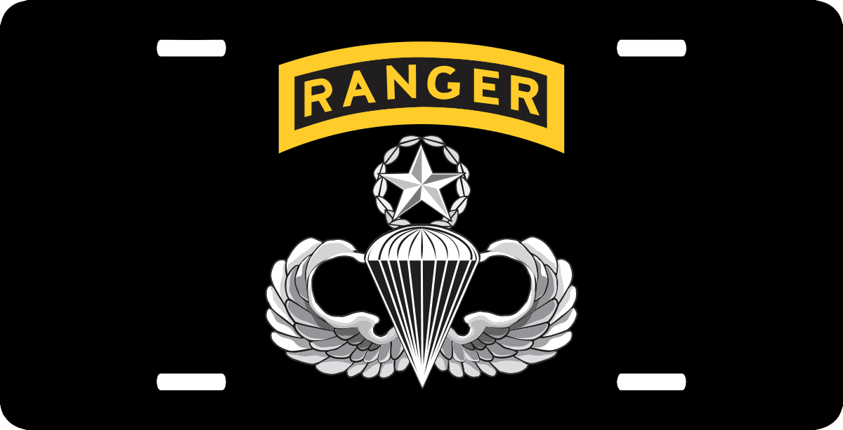 This Master Parachutist with Ranger Tab License Plate is made from heavy gauge aluminum and has a baked enamel finish to last for many years of use. Each plate measures 5 15/16" x 11 15/16". This license plate would make a wonderful addition to your collection or a great gift.
