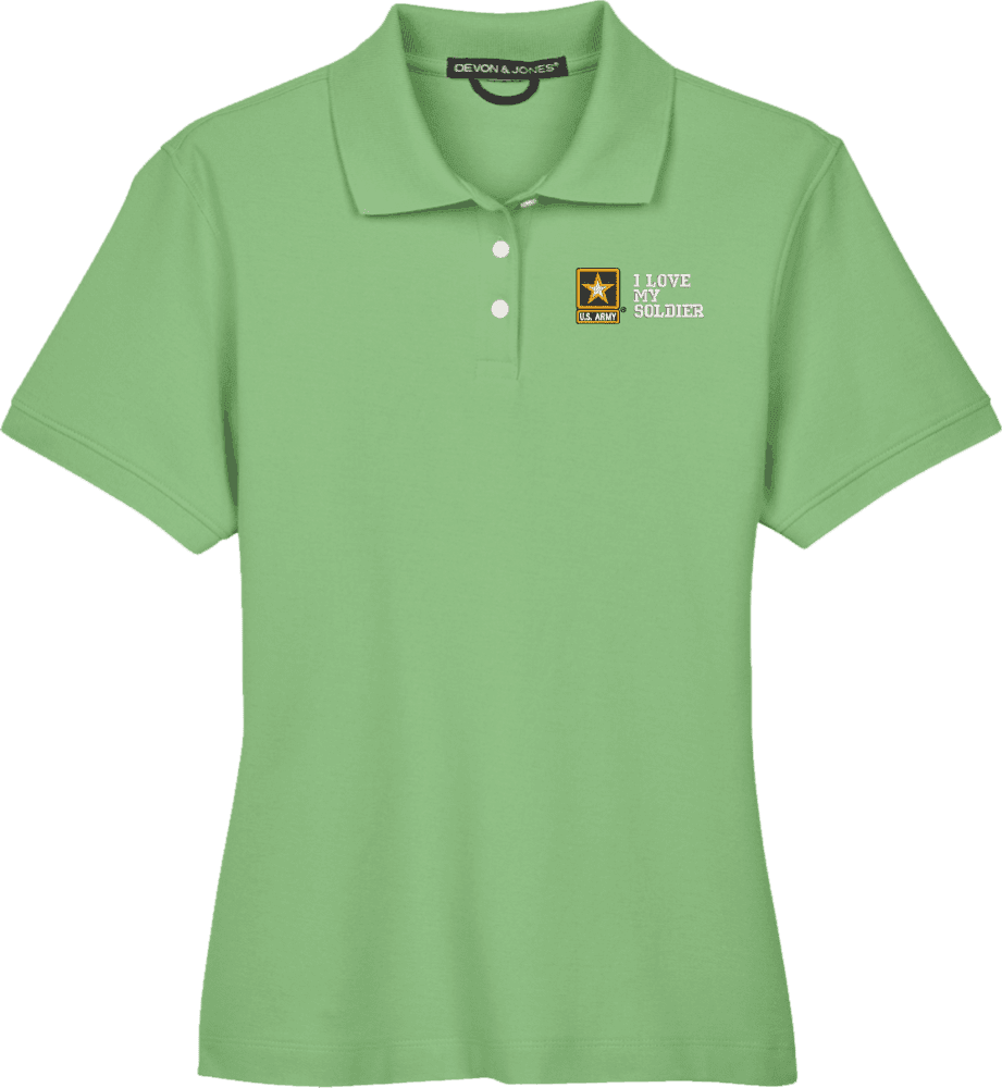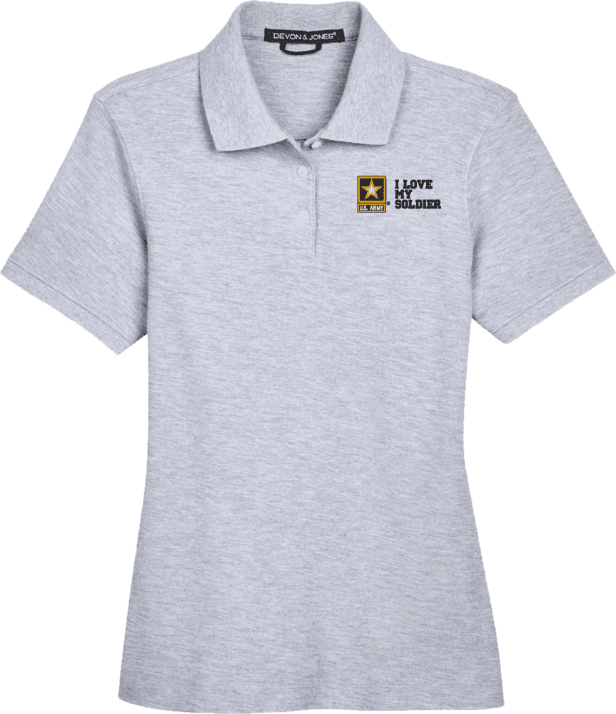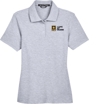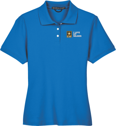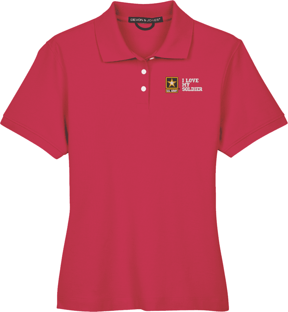 Note: Some of the Color Options pictured may not be available. Available Color Options are listed on the drop down menu above.MilitaryBest is proud to offer this U.S. Army Star I Love My Soldier Women's Devon & Jones Polo. This Ladies Polo features Rib knit cuffs, Dura-Pearl Buttons, and a Three-Button Placket. These Polos are made with 6.8 oz., 100% Peruvian Pima Cotton and are proudly embroidered at our facilities in Scottsboro, AL.