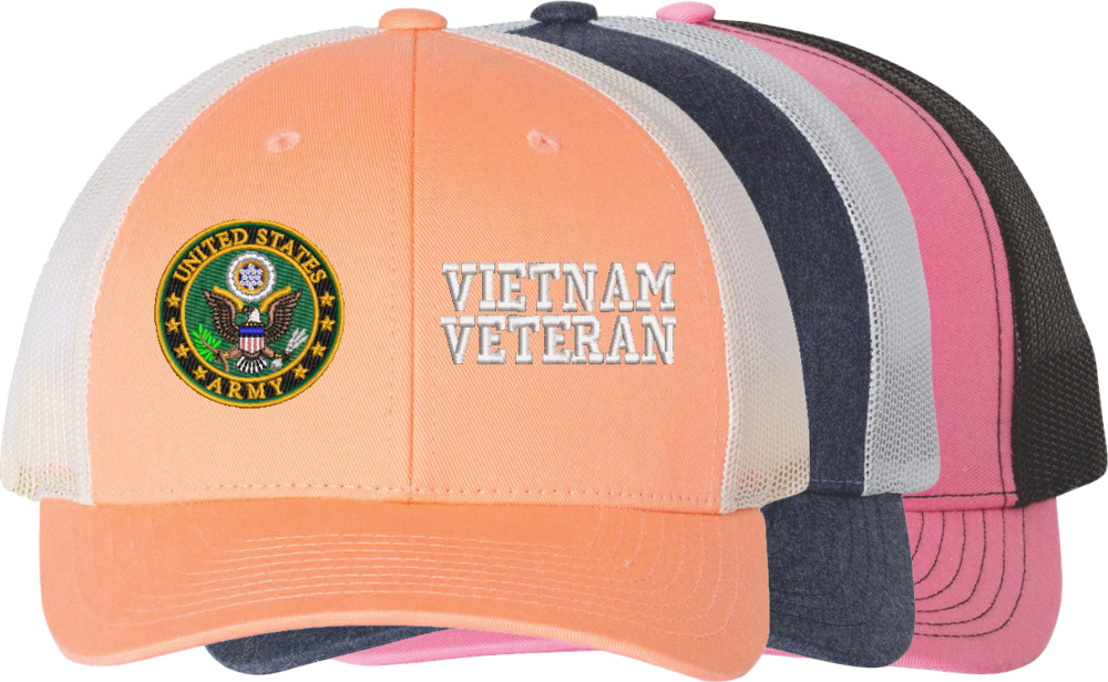 MilitaryBest is proud to offer this Mesh Back Army Seal Vietnam Veteran Women's Split-Cap. The design is embroidered onto a 6x panel mid/low profile mesh back cap and is crisp, clean, and sure to be loved by all! As with all MilitaryBest caps and apparel your satisfaction is guaranteed!Caps ordered with embroidered back text requires an additional 1 to 2 days of production time. All personalized caps will be embroidered in ALL CAPITAL LETTERS. Caps personalized with back text are not returnable unless there is a material defect in the cap.