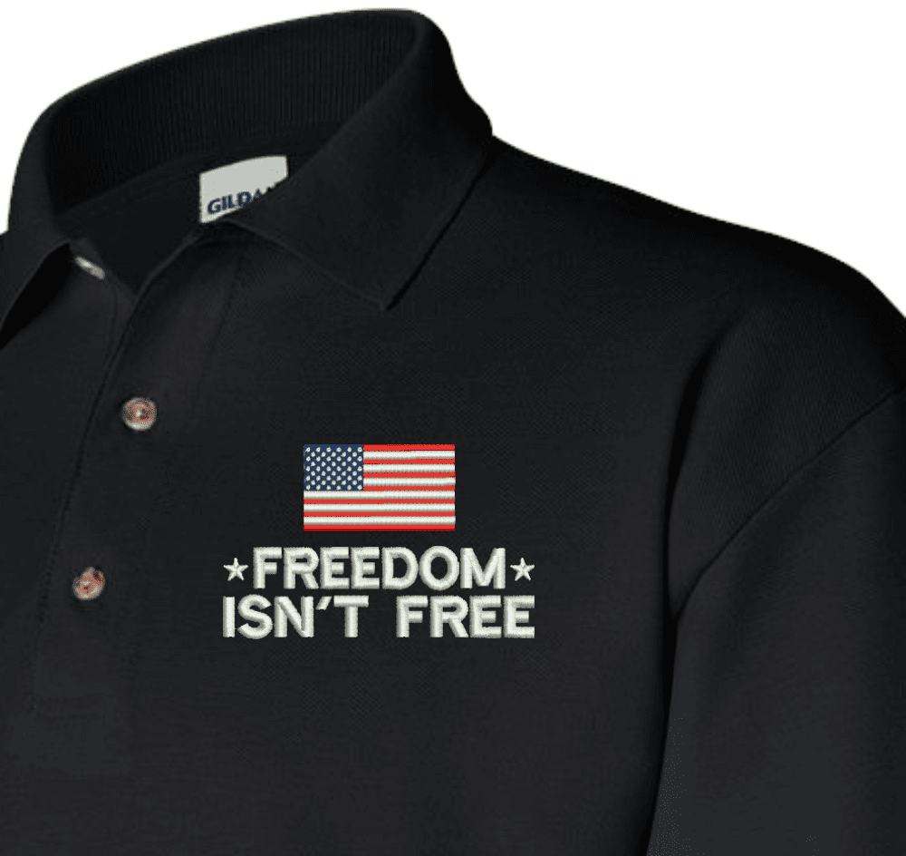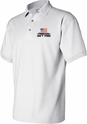 Note: Some of the Color Options pictured may not be available. Available Color Options are listed on the drop down menu above.MilitaryBest is proud to offer this quality Freedom Isn't Free with Flag Polo. Each Polo is available in either 100% Ringspun cotton pique or a 50/50 cotton/polyester blend. These quality Military Polos are proudly embroidered at our facilities in Scottsboro, AL. Support the Army MWR program by purchasing only from Licensed Vendors.