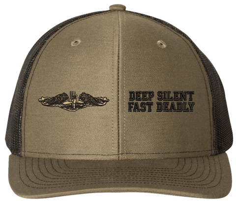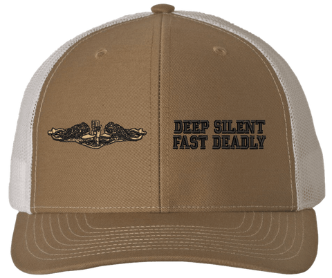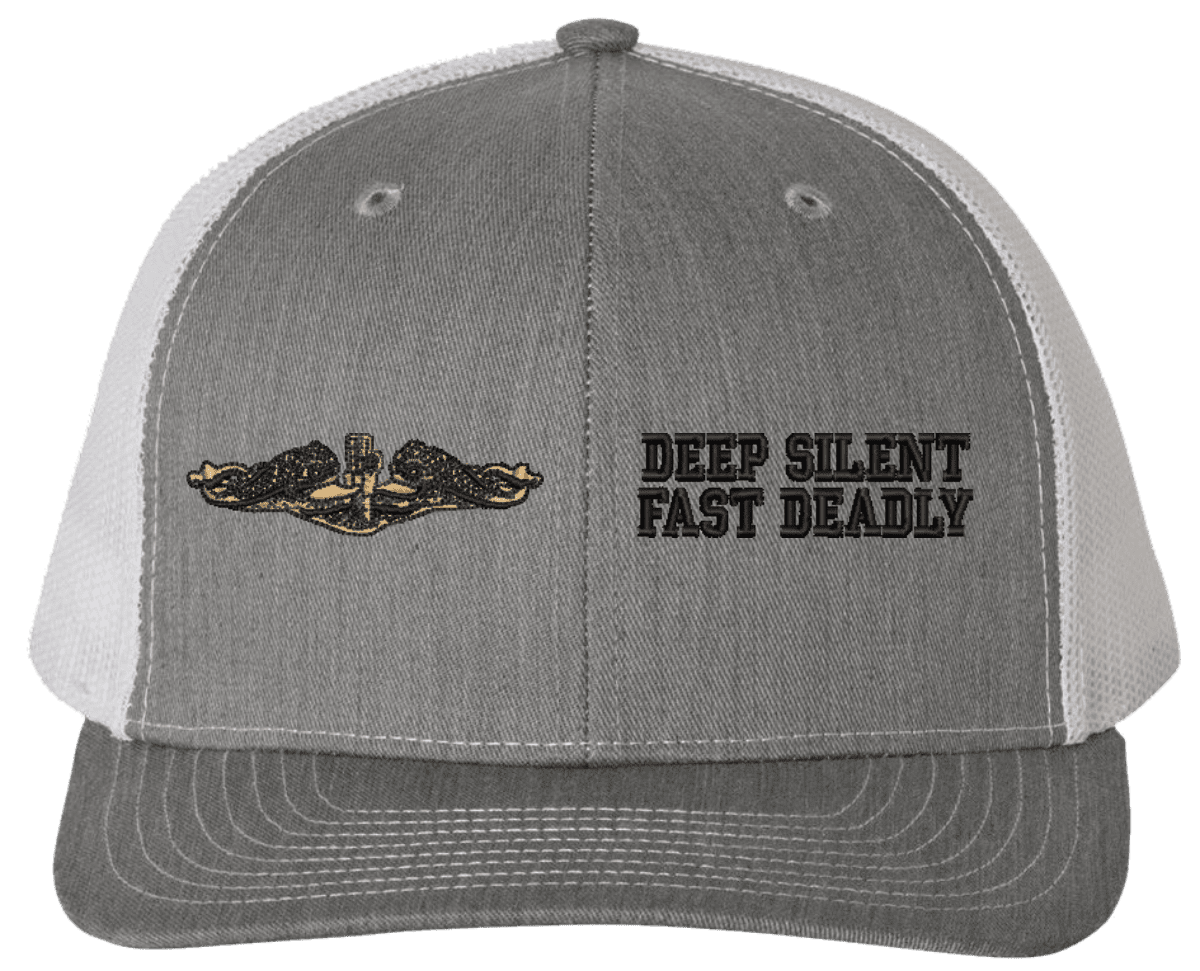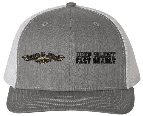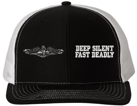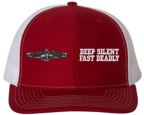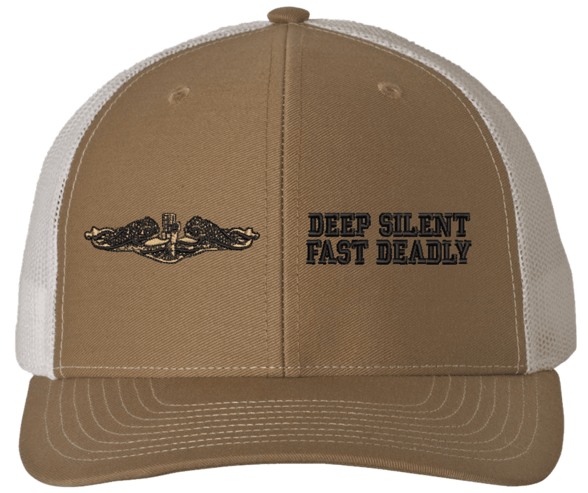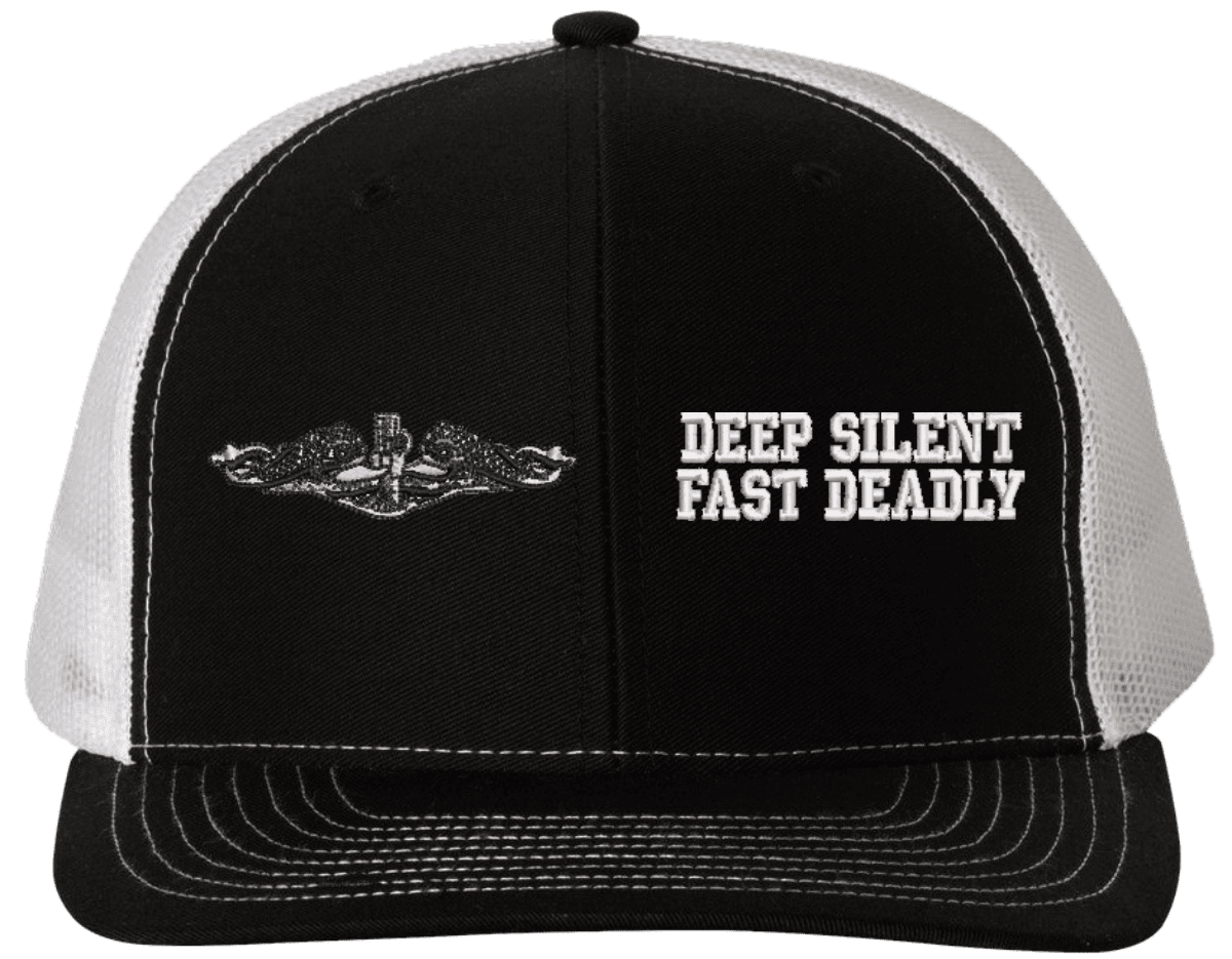 MilitaryBest is proud to offer this Mesh Back U.S. Navy Deep Silent Fast Deadly Dolphin Split Cap. The design of this Cap is crisp, clean, and sure to be loved by people of all ages! This Mesh Back Cap Design is crafted by our skilled embroidery technicians at our facilities in Scottsboro, Alabama. As with all MilitaryBest items, your satisfaction is guaranteed!Caps ordered with embroidered back text requires an additional 1 to 2 days of production time. All personalized caps will be embroidered in ALL CAPITAL LETTERS. Caps personalized with back text are not returnable unless there is a material defect in the cap.