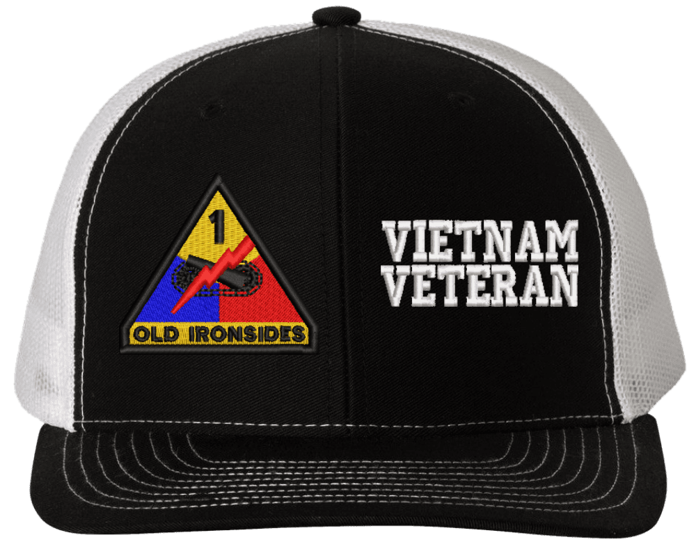 MilitaryBest is proud to offer this Mesh Back 1st Armored Vietnam Veteran Split Cap. The 1st Armored Division Insignia is embroidered onto a 6x panel mid/low profile mesh back cap and is crisp, clean, and sure to be loved by people of all ages! As with all MilitaryBest caps and apparel your satisfaction is guaranteed!Caps ordered with embroidered back text requires an additional 1 to 2 days of production time. All personalized caps will be embroidered in ALL CAPITAL LETTERS. Caps personalized with back text are not returnable unless there is a material defect in the cap.