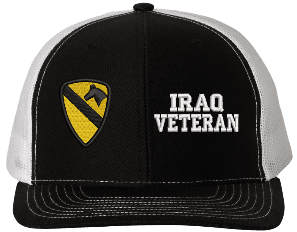 MilitaryBest is proud to offer this Mesh Back 1st Cavalry Iraq Veteran Split Cap. The 1st Cavalry Division Insignia is embroidered onto a 6x panel mid/low profile mesh back cap and is crisp, clean, and sure to be loved by people of all ages! As with all MilitaryBest caps and apparel your satisfaction is guaranteed!Caps ordered with embroidered back text requires an additional 1 to 2 days of production time. All personalized caps will be embroidered in ALL CAPITAL LETTERS. Caps personalized with back text are not returnable unless there is a material defect in the cap.