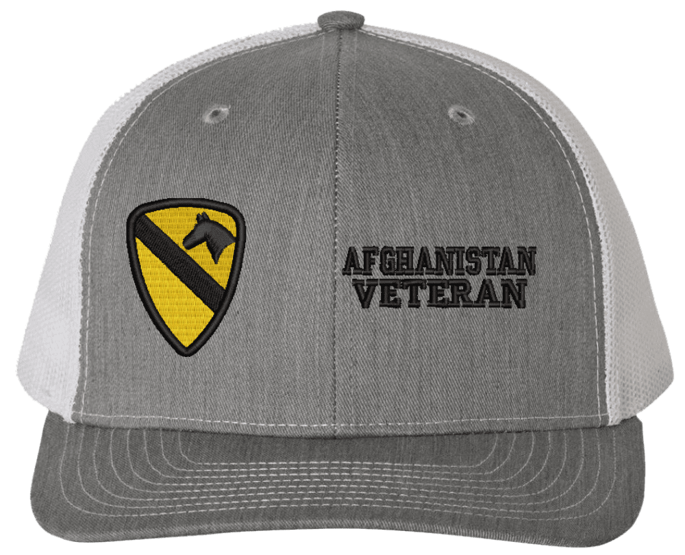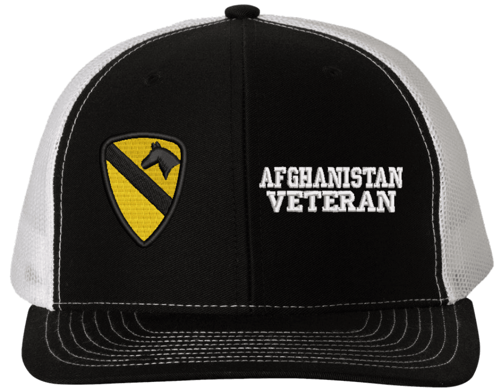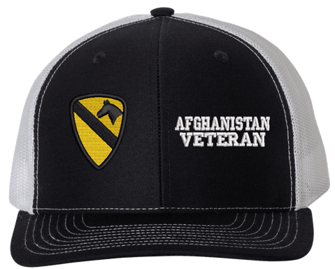 MilitaryBest is proud to offer this Mesh Back 1st Cavalry Afghanistan Veteran Split Cap. The 1st Cavalry Division Insignia is embroidered onto a 6x panel mid/low profile mesh back cap and is crisp, clean, and sure to be loved by people of all ages! As with all MilitaryBest caps and apparel your satisfaction is guaranteed!Caps ordered with embroidered back text requires an additional 1 to 2 days of production time. All personalized caps will be embroidered in ALL CAPITAL LETTERS. Caps personalized with back text are not returnable unless there is a material defect in the cap.