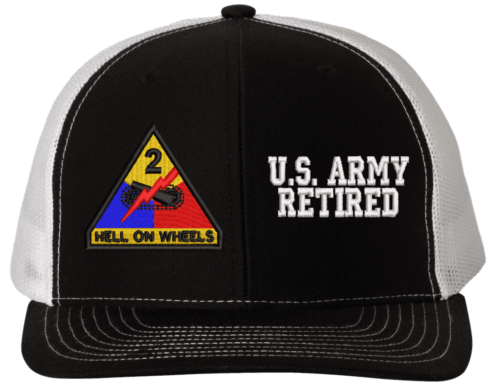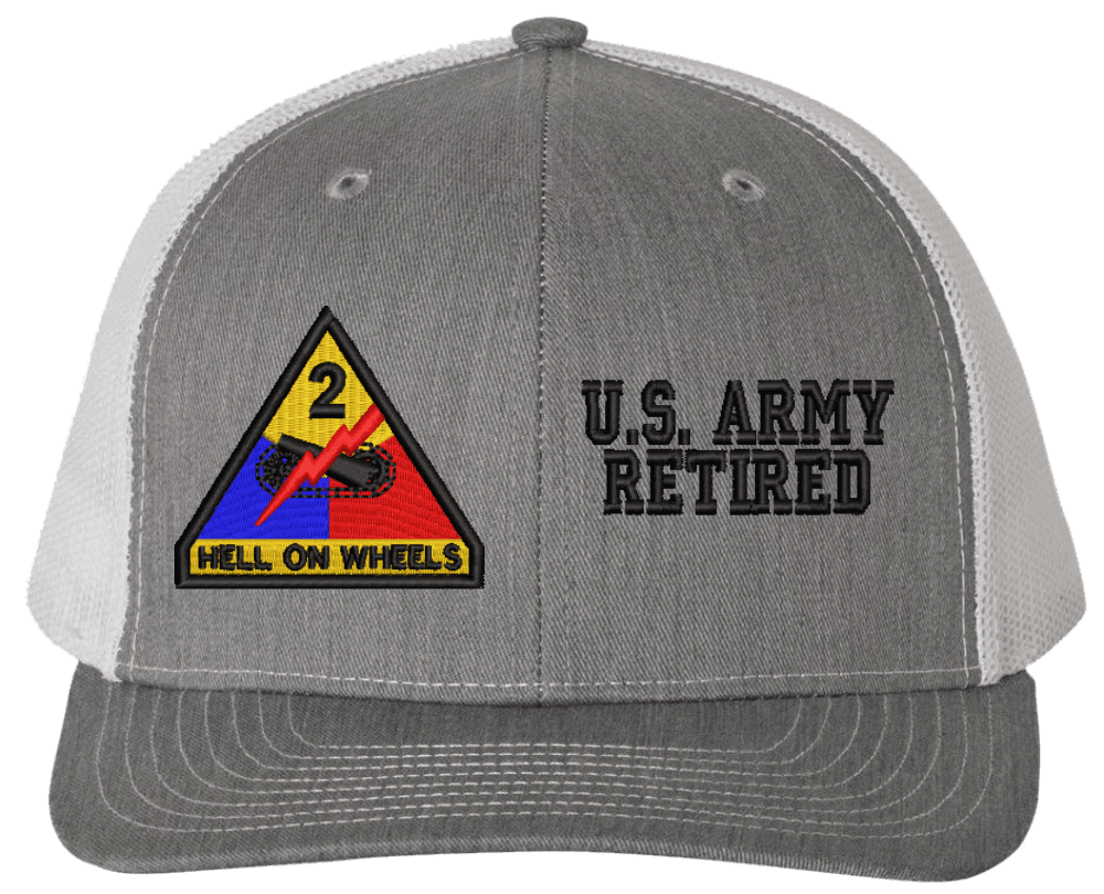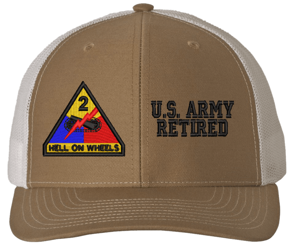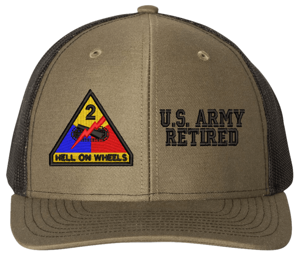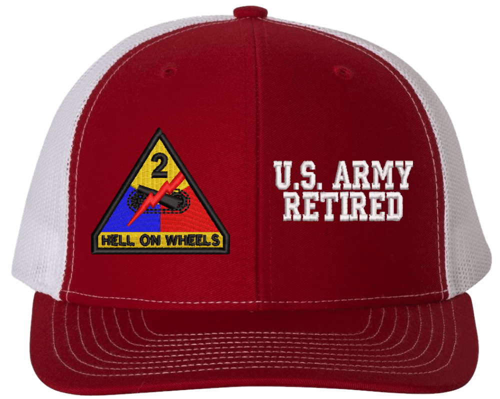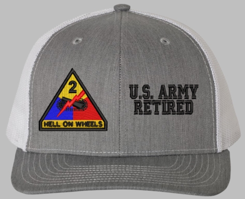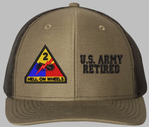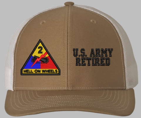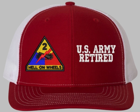 MilitaryBest is proud to offer this Mesh Back 2nd Armored U.S. Army Retired Split Cap. The 2nd Armored Division Insignia is embroidered onto a 6x panel mid/low profile mesh back cap and is crisp, clean, and sure to be loved by people of all ages! As with all MilitaryBest caps and apparel your satisfaction is guaranteed!Caps ordered with embroidered back text requires an additional 1 to 2 days of production time. All personalized caps will be embroidered in ALL CAPITAL LETTERS. Caps personalized with back text are not returnable unless there is a material defect in the cap.
