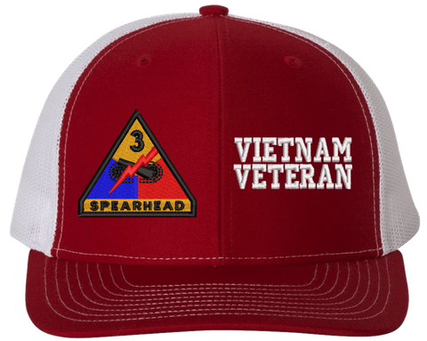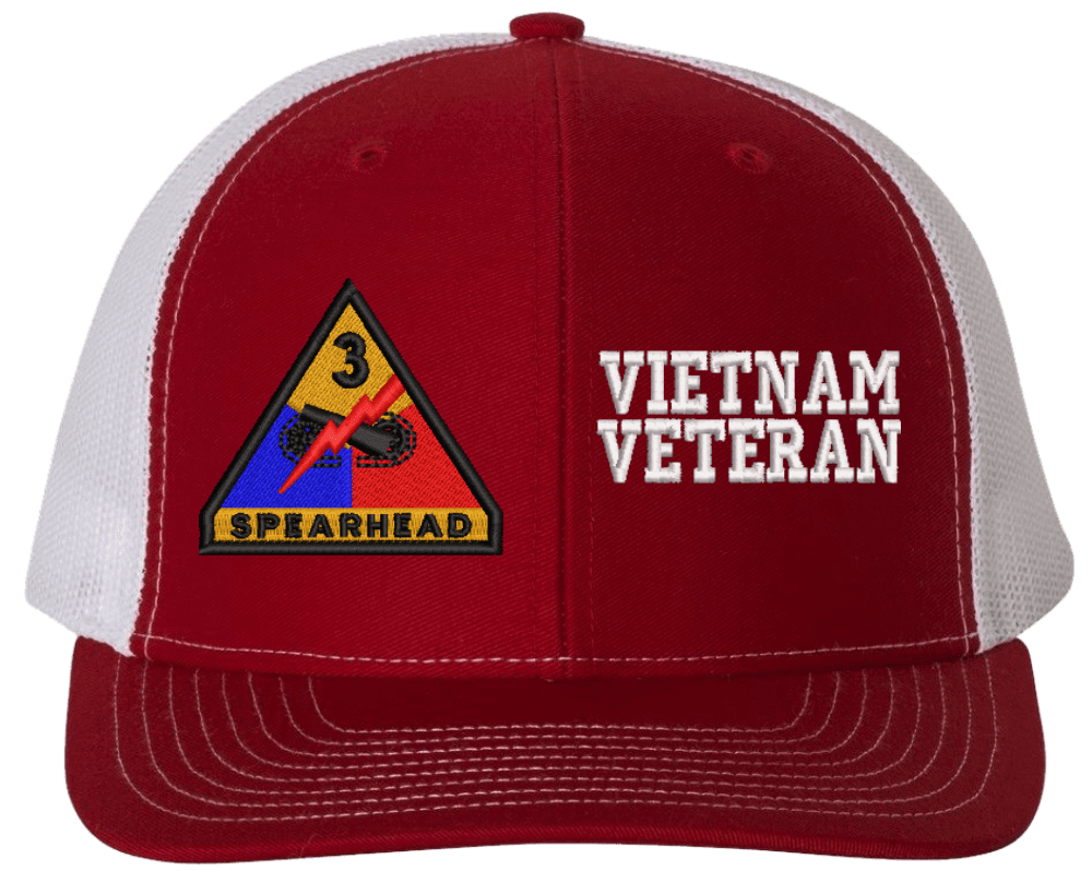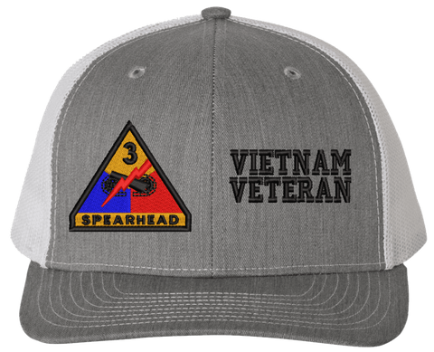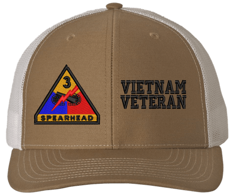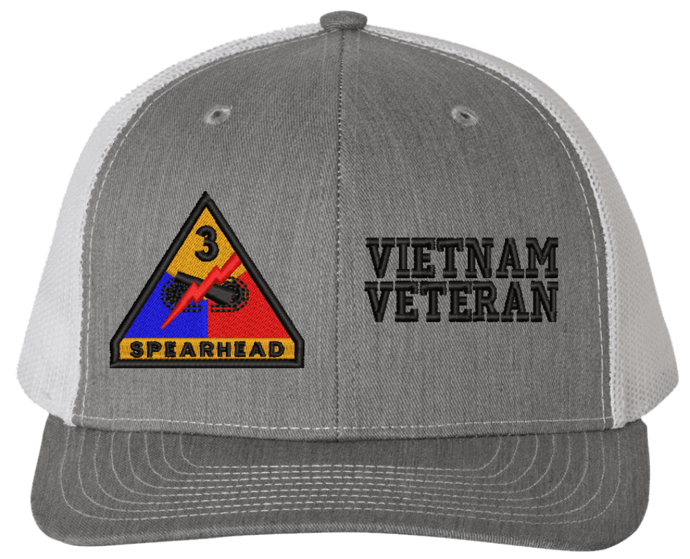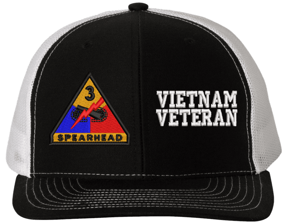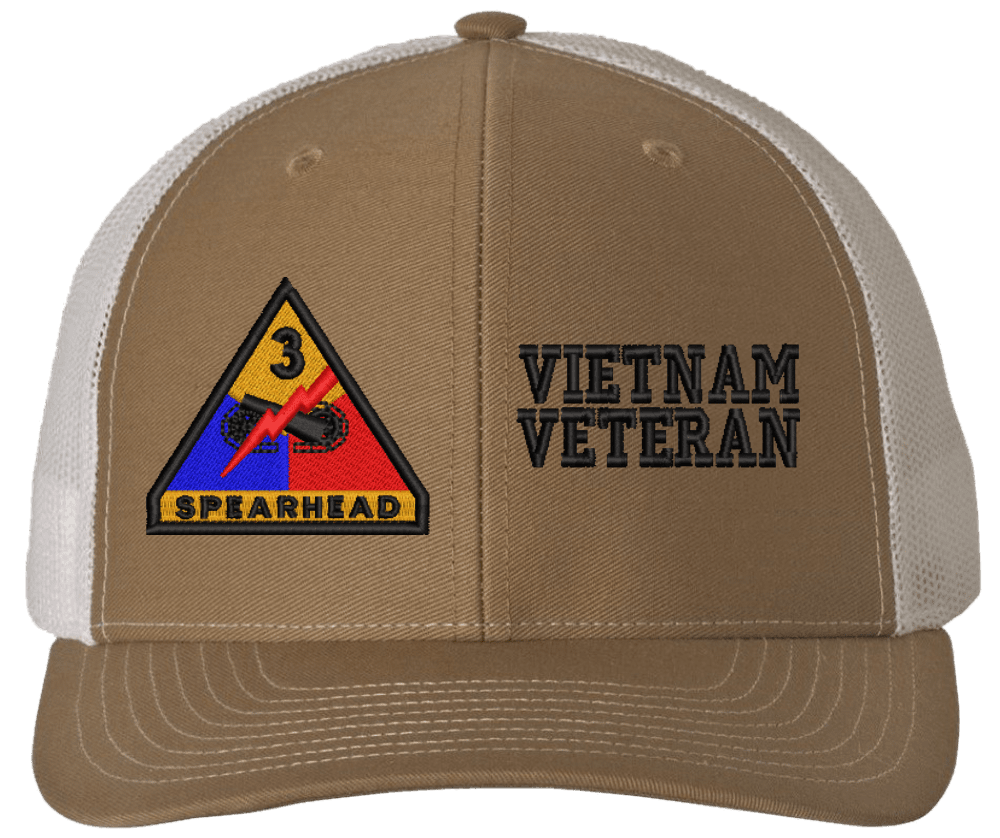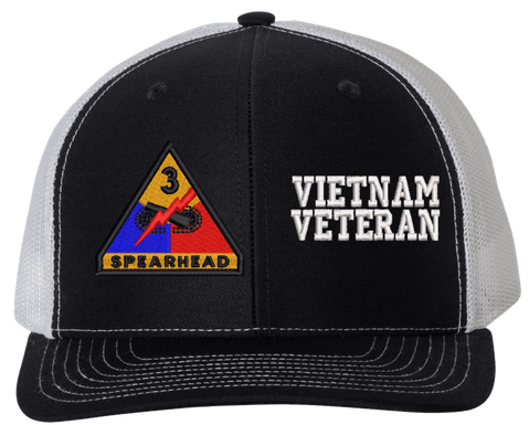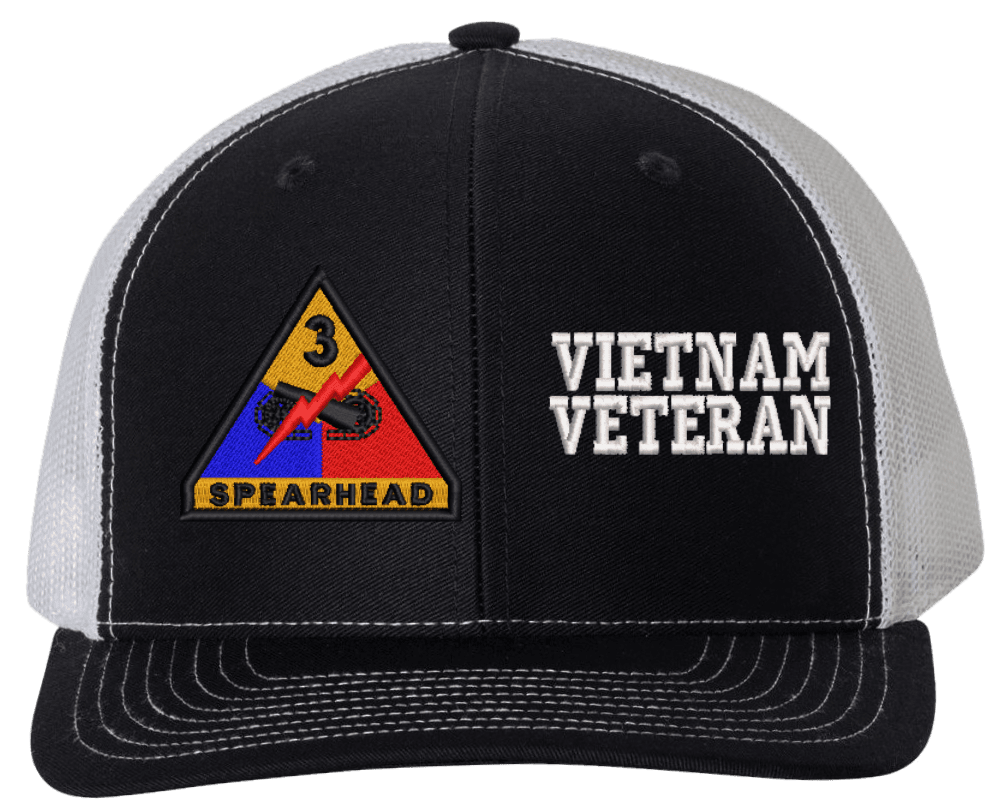 MilitaryBest is proud to offer this Mesh Back 3rd Armored Vietnam Veteran Split Cap. The 3rd Armored Division Insignia is embroidered onto a 6x panel mid/low profile mesh back cap and is crisp, clean, and sure to be loved by people of all ages! As with all MilitaryBest caps and apparel your satisfaction is guaranteed!Caps ordered with embroidered back text requires an additional 1 to 2 days of production time. All personalized caps will be embroidered in ALL CAPITAL LETTERS. Caps personalized with back text are not returnable unless there is a material defect in the cap.