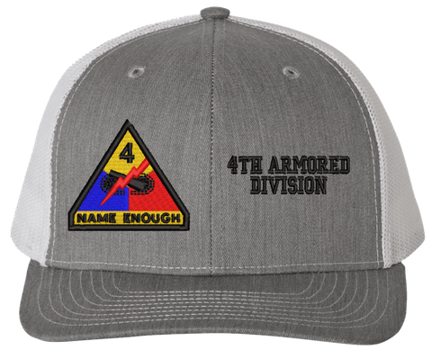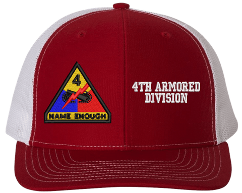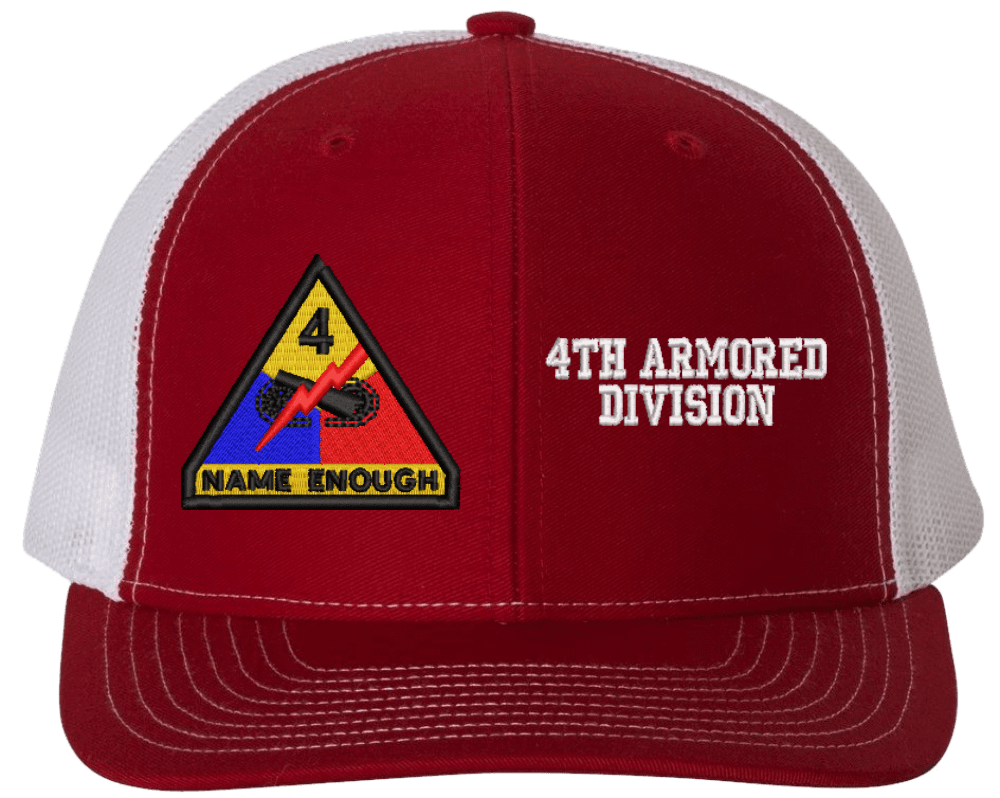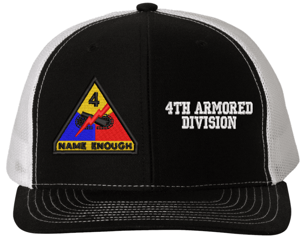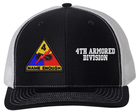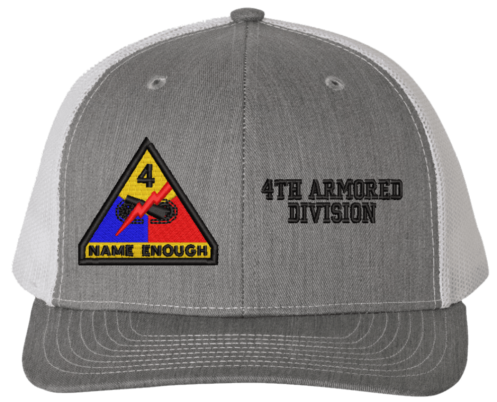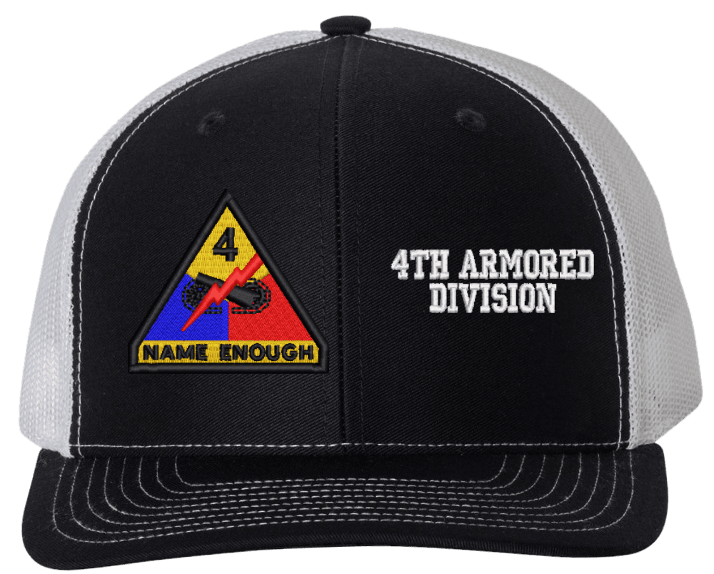 MilitaryBest is proud to offer this Mesh Back 4th Armored Division Split Cap. The 4th Armored Division Insignia is embroidered onto a 6x panel mid/low profile mesh back cap and is crisp, clean, and sure to be loved by people of all ages! As with all MilitaryBest caps and apparel your satisfaction is guaranteed!Caps ordered with embroidered back text requires an additional 1 to 2 days of production time. All personalized caps will be embroidered in ALL CAPITAL LETTERS. Caps personalized with back text are not returnable unless there is a material defect in the cap.
