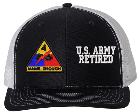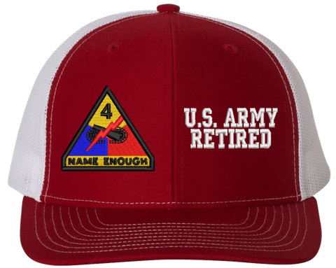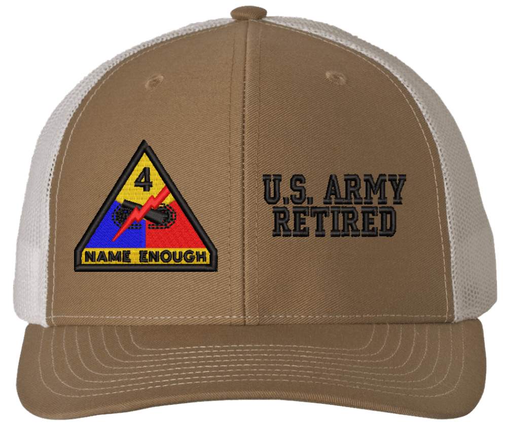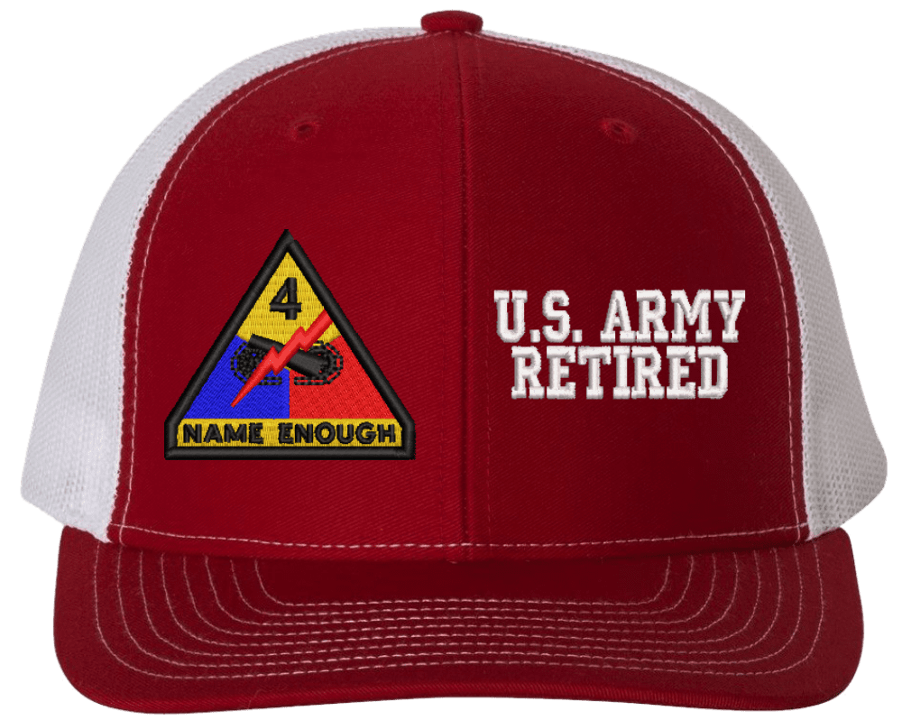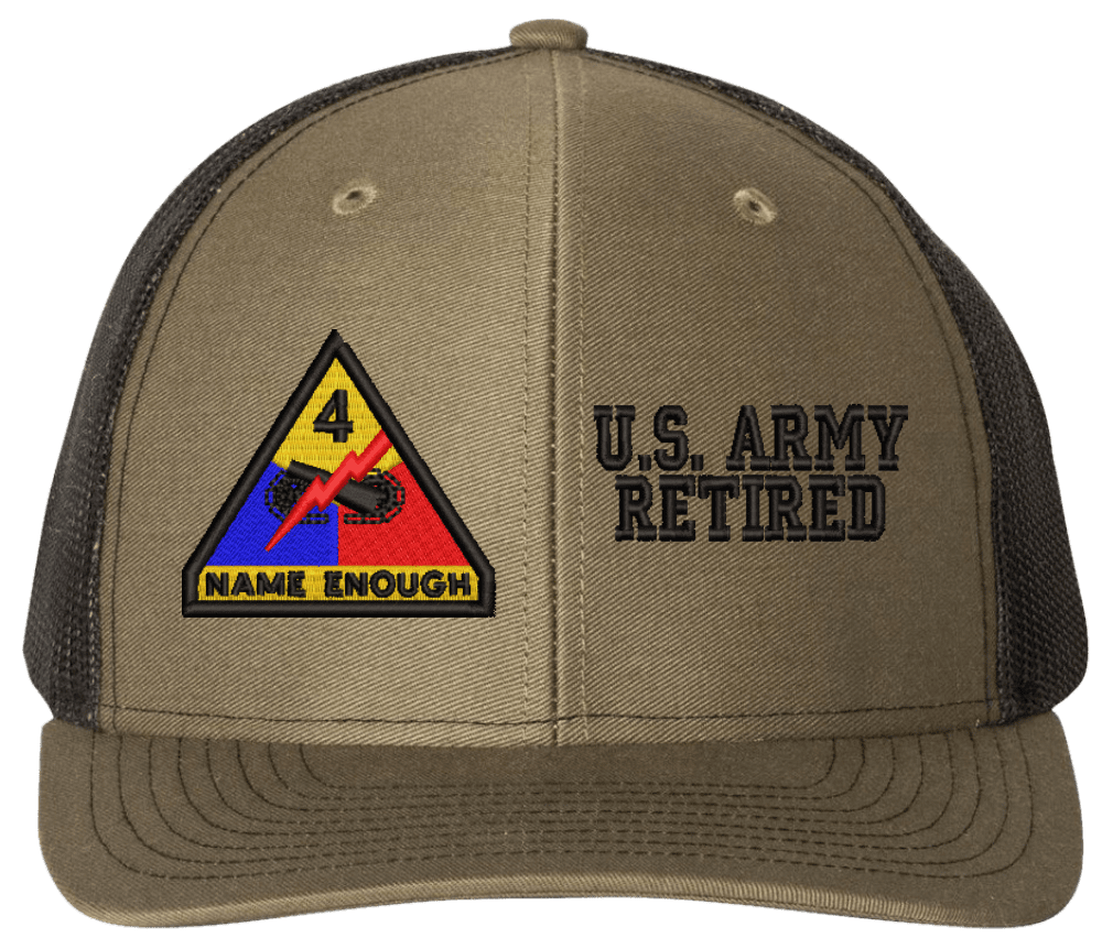 MilitaryBest is proud to offer this Mesh Back 4th Armored U.S. Army Retired Split Cap. The 4th Armored Division Insignia is embroidered onto a 6x panel mid/low profile mesh back cap and is crisp, clean, and sure to be loved by people of all ages! As with all MilitaryBest caps and apparel your satisfaction is guaranteed!Caps ordered with embroidered back text requires an additional 1 to 2 days of production time. All personalized caps will be embroidered in ALL CAPITAL LETTERS. Caps personalized with back text are not returnable unless there is a material defect in the cap.