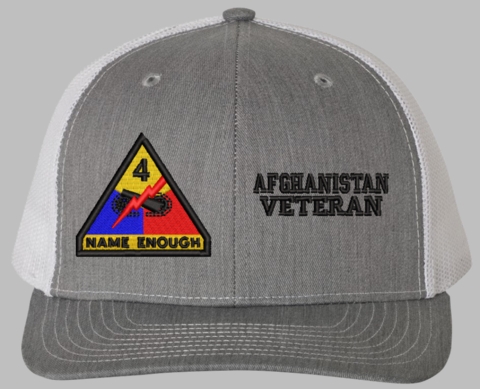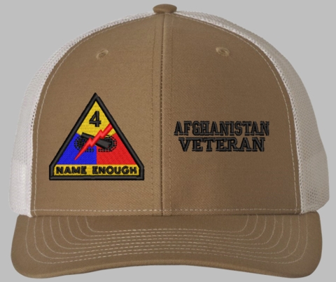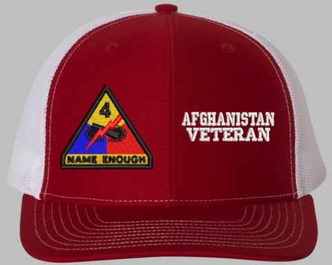 MilitaryBest is proud to offer this Mesh Back 4th Armored Afghanistan Veteran Split Cap. The 4th Armored Division Insignia is embroidered onto a 6x panel mid/low profile mesh back cap and is crisp, clean, and sure to be loved by people of all ages! As with all MilitaryBest caps and apparel your satisfaction is guaranteed!Caps ordered with embroidered back text requires an additional 1 to 2 days of production time. All personalized caps will be embroidered in ALL CAPITAL LETTERS. Caps personalized with back text are not returnable unless there is a material defect in the cap.