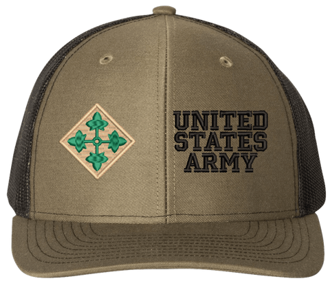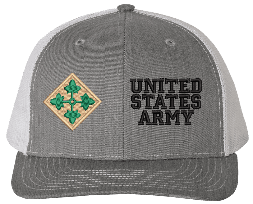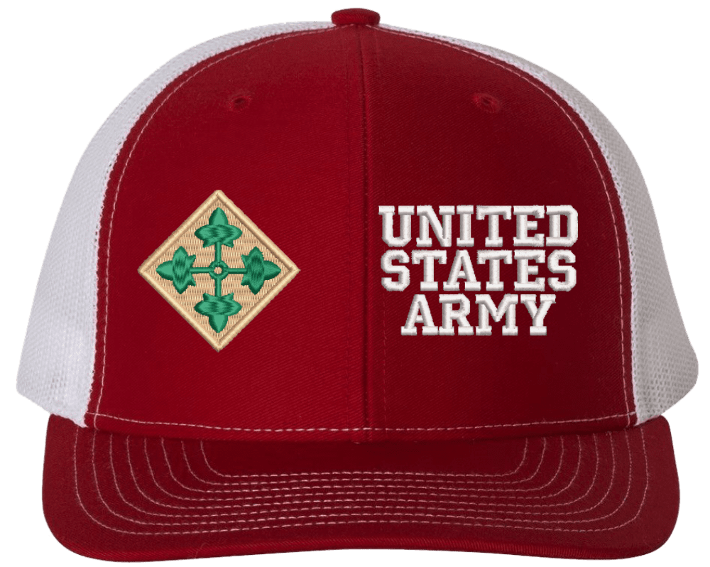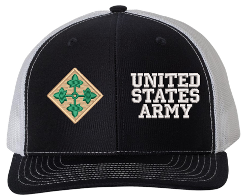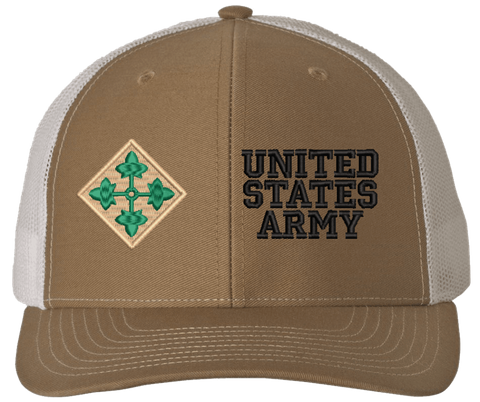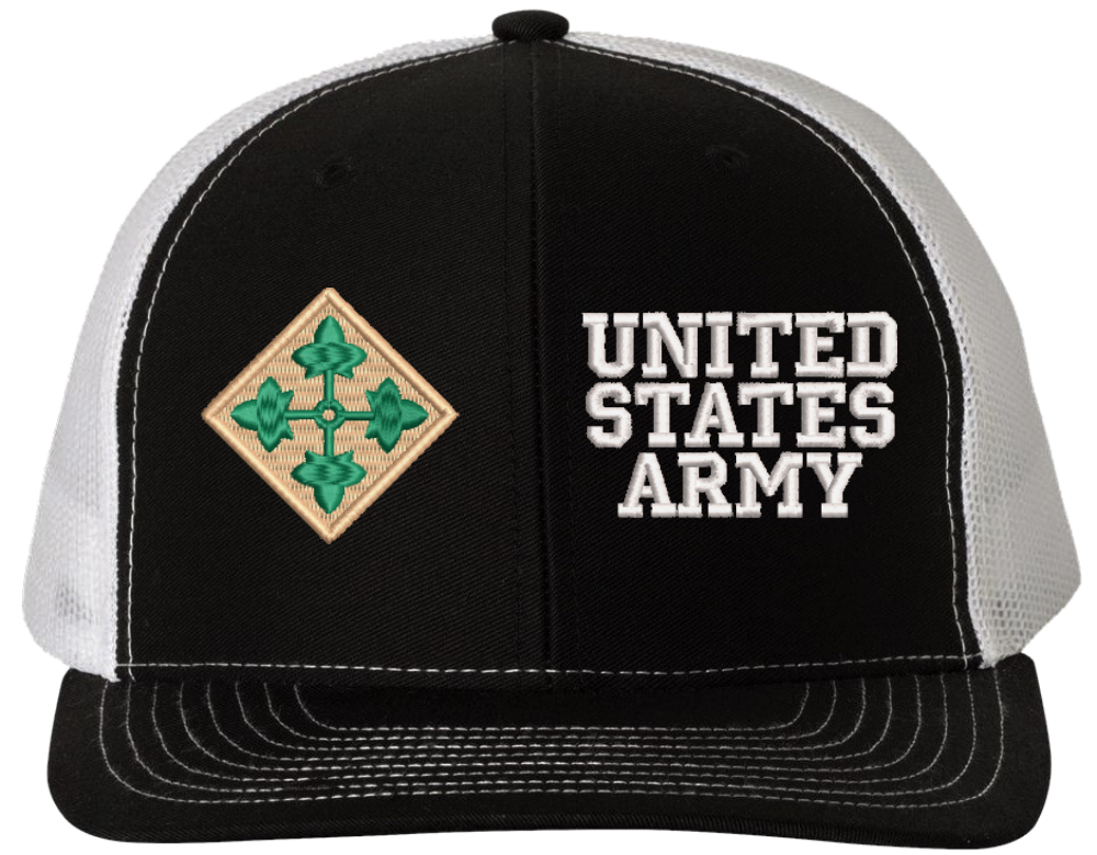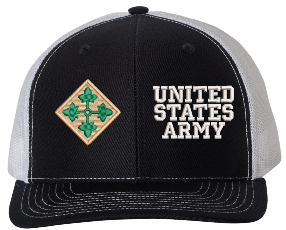 MilitaryBest is proud to offer this Mesh Back 4th Infantry United States Army Split Cap. The 4th Infantry Division Insignia is embroidered onto a 6x panel mid/low profile mesh back cap and is crisp, clean, and sure to be loved by people of all ages! As with all MilitaryBest caps and apparel your satisfaction is guaranteed!Caps ordered with embroidered back text requires an additional 1 to 2 days of production time. All personalized caps will be embroidered in ALL CAPITAL LETTERS. Caps personalized with back text are not returnable unless there is a material defect in the cap.