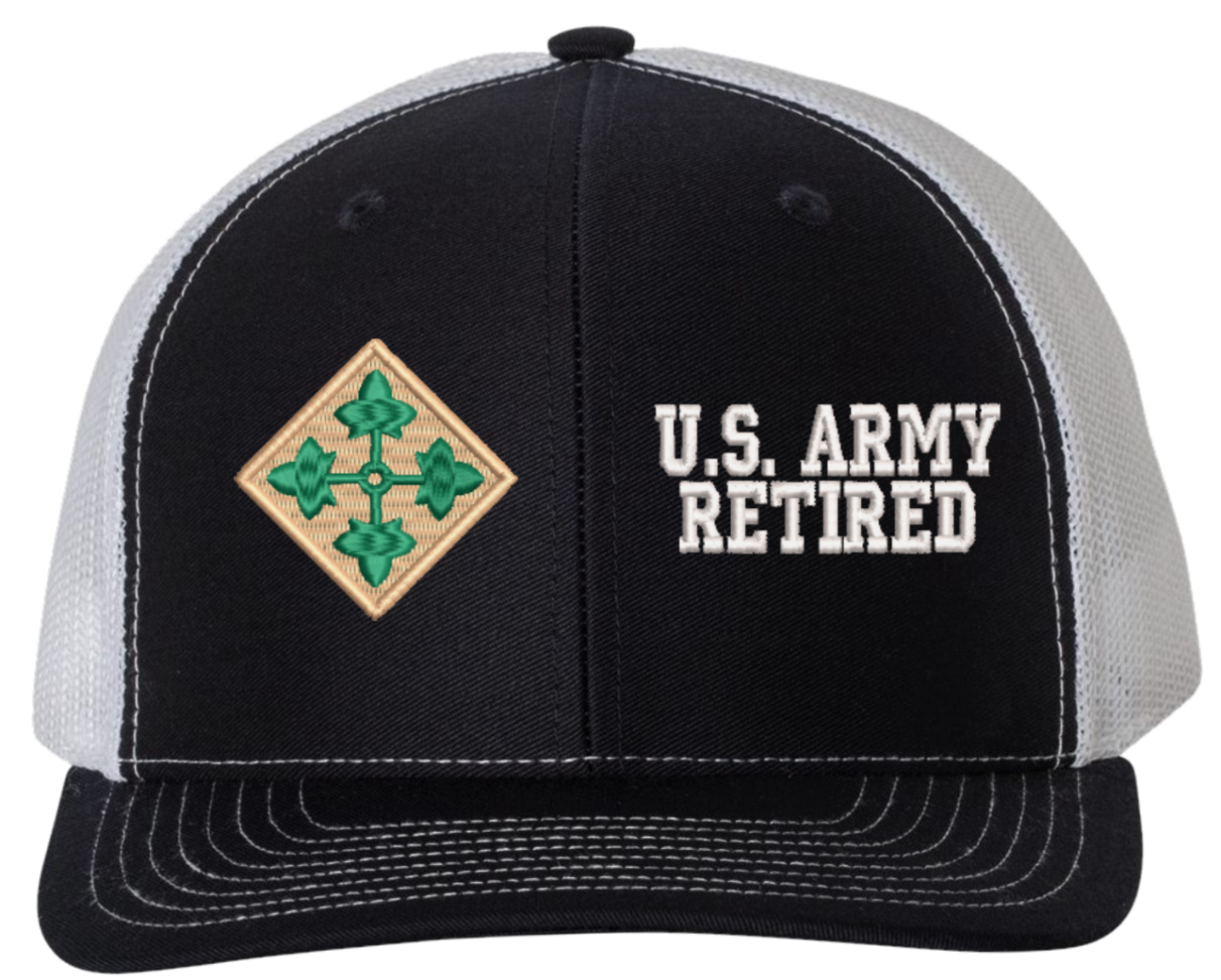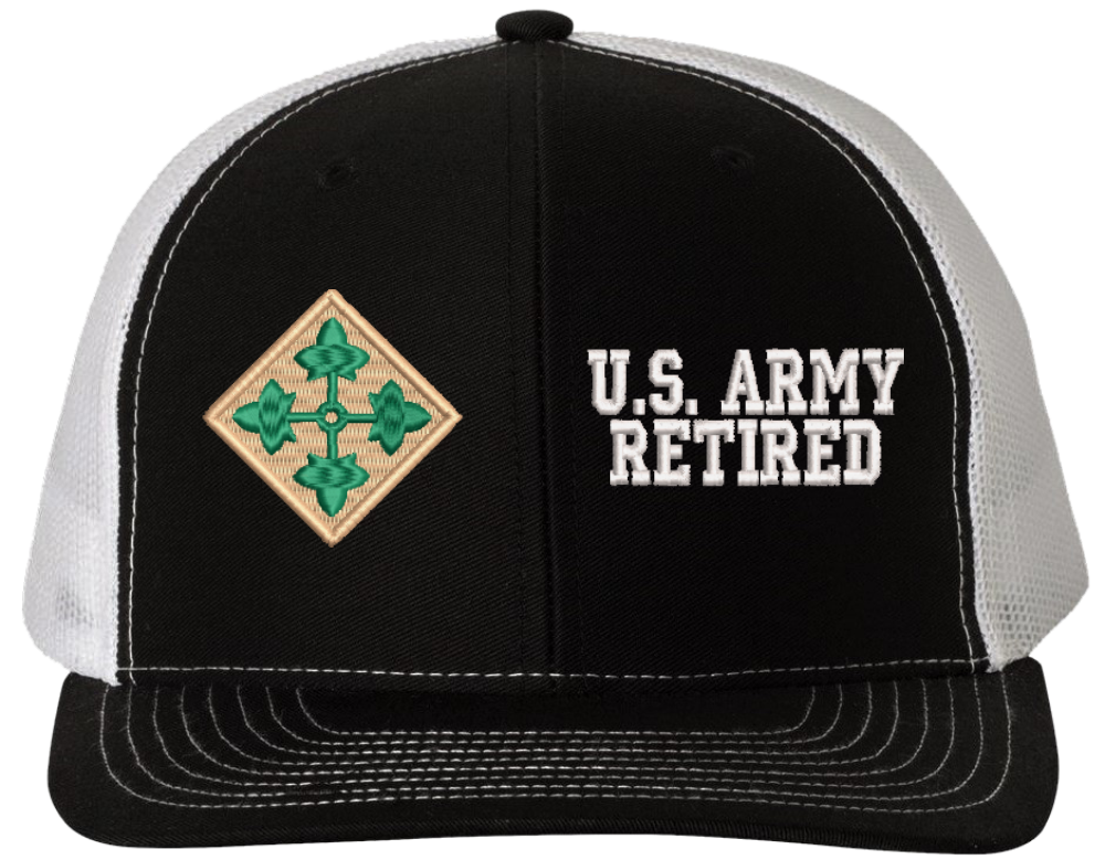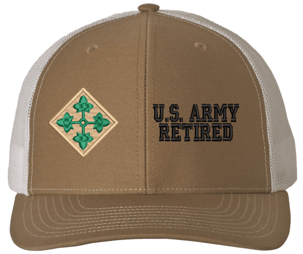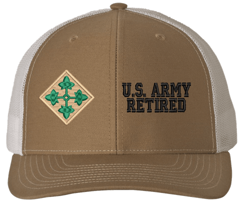 MilitaryBest is proud to offer this Mesh Back 4th Infantry U.S. Army Retired Split Cap. The 4th Infantry Division Insignia is embroidered onto a 6x panel mid/low profile mesh back cap and is crisp, clean, and sure to be loved by people of all ages! As with all MilitaryBest caps and apparel your satisfaction is guaranteed!Caps ordered with embroidered back text requires an additional 1 to 2 days of production time. All personalized caps will be embroidered in ALL CAPITAL LETTERS. Caps personalized with back text are not returnable unless there is a material defect in the cap.