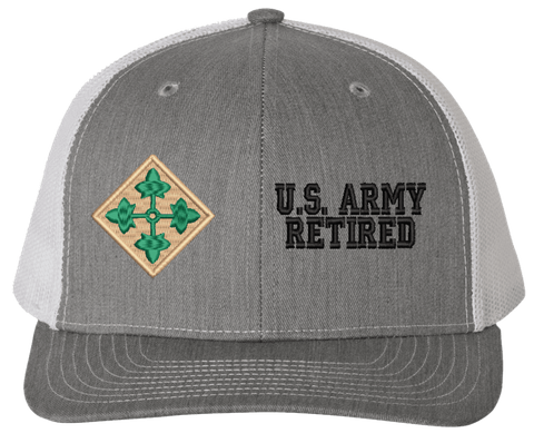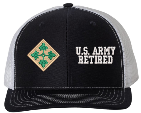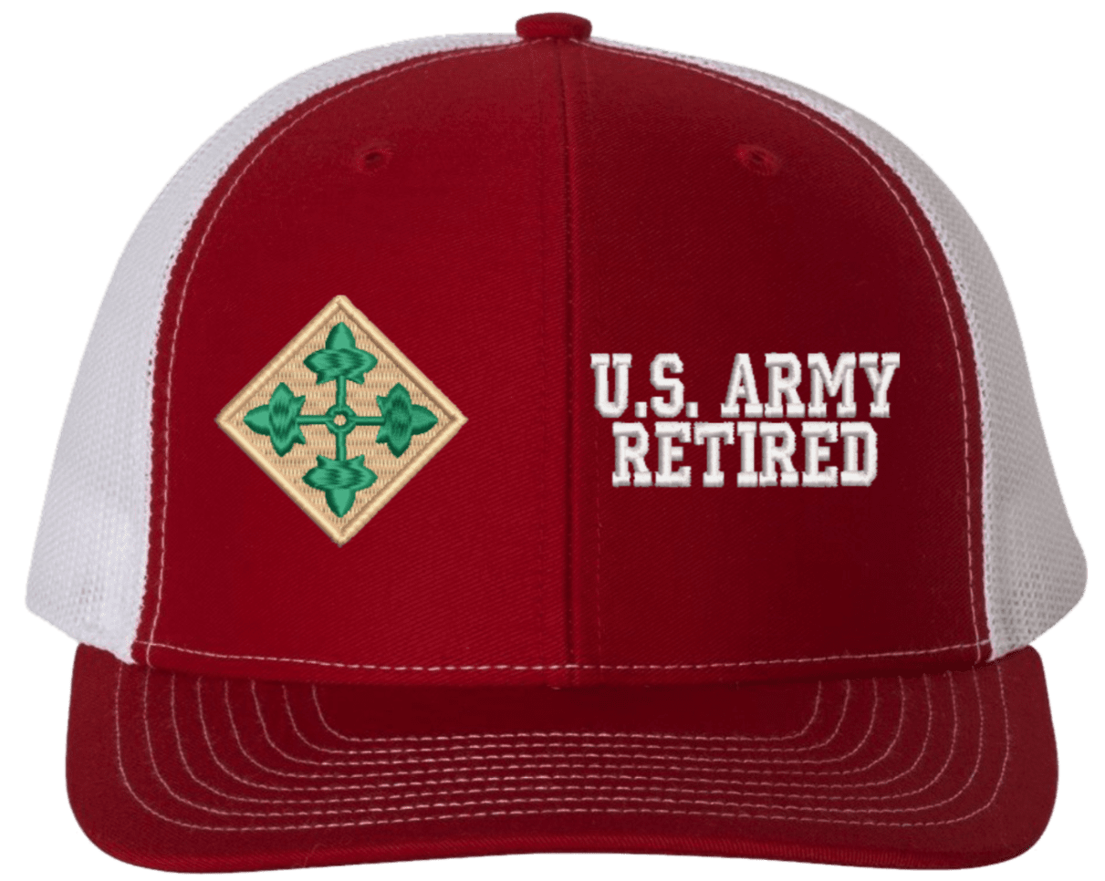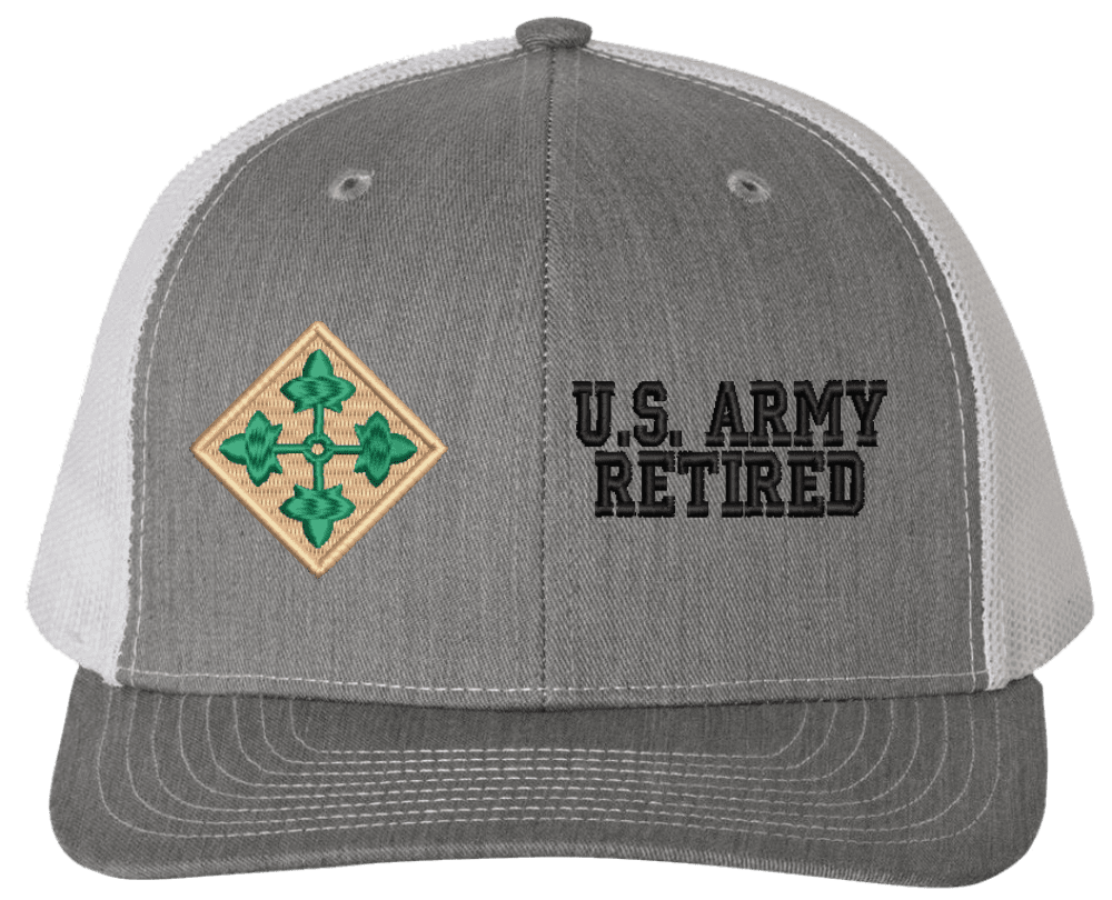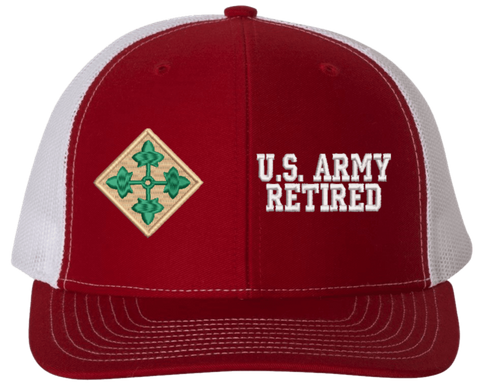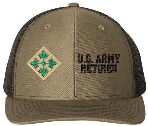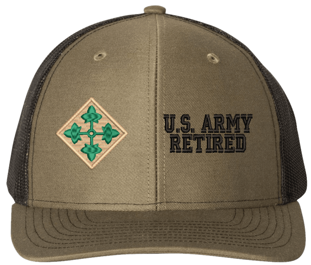 MilitaryBest is proud to offer this Mesh Back 4th Infantry U.S. Army Retired Split Cap. The 4th Infantry Division Insignia is embroidered onto a 6x panel mid/low profile mesh back cap and is crisp, clean, and sure to be loved by people of all ages! As with all MilitaryBest caps and apparel your satisfaction is guaranteed!Caps ordered with embroidered back text requires an additional 1 to 2 days of production time. All personalized caps will be embroidered in ALL CAPITAL LETTERS. Caps personalized with back text are not returnable unless there is a material defect in the cap.