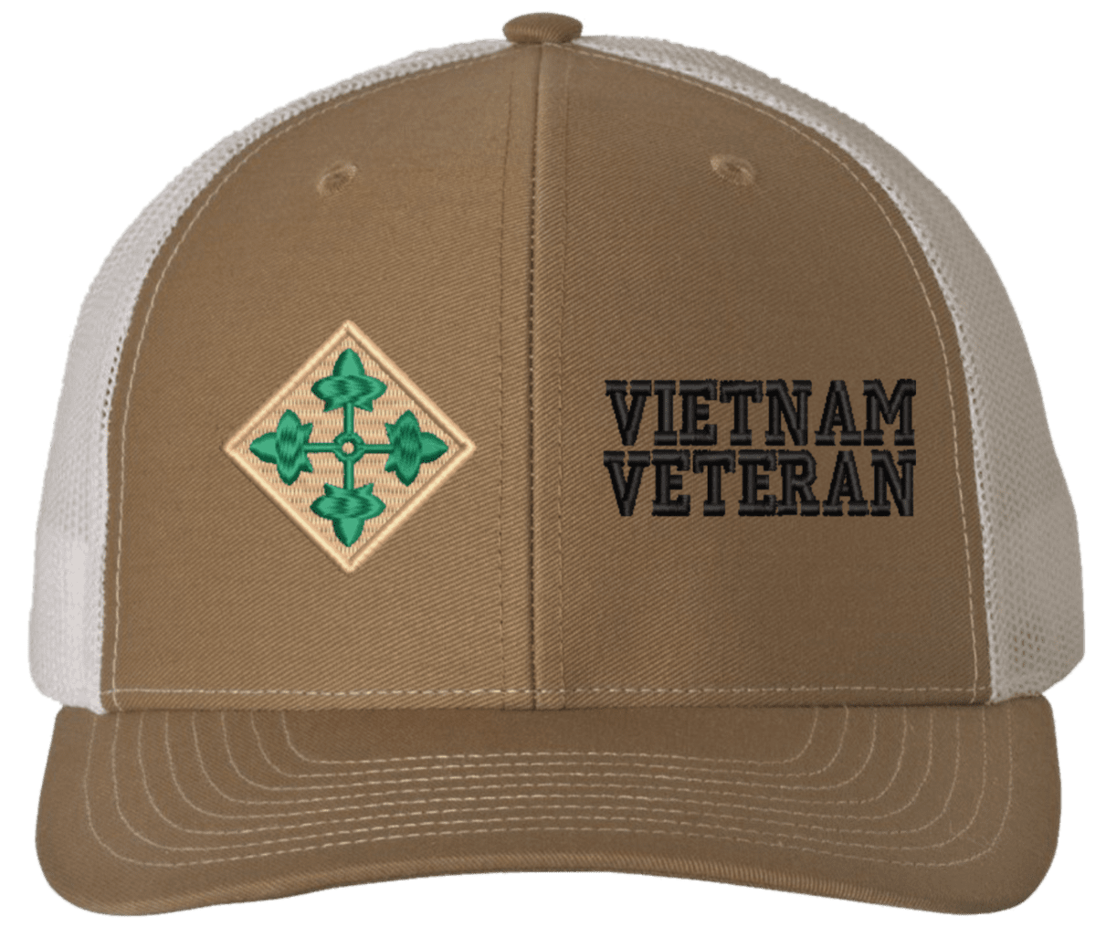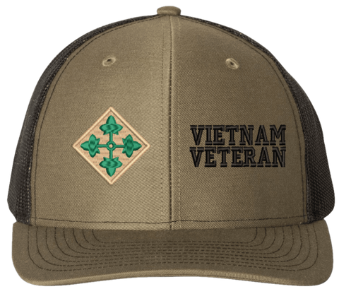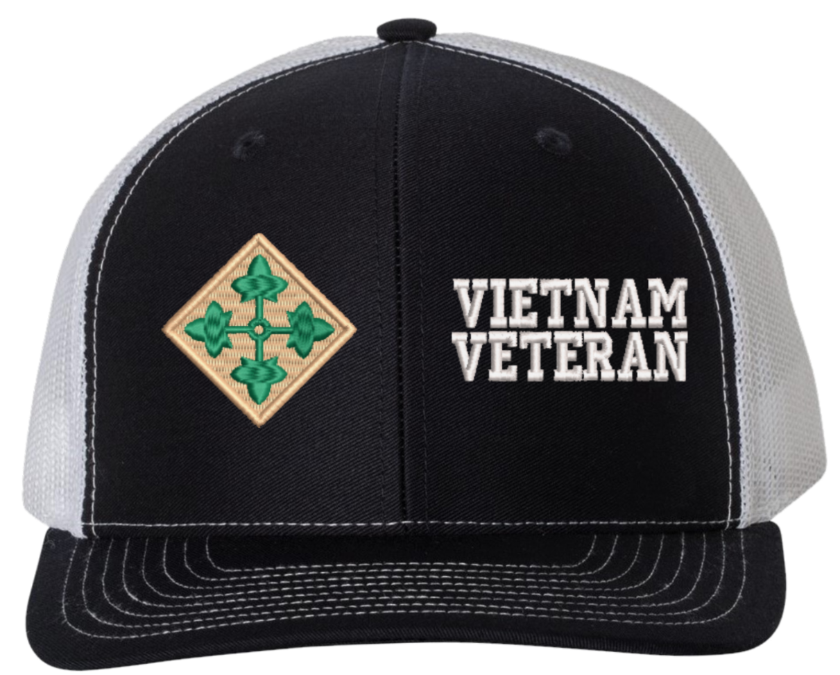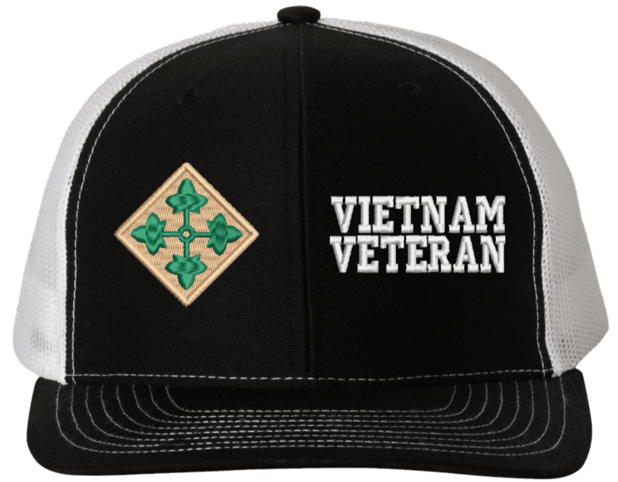 MilitaryBest is proud to offer this Mesh Back 4th Infantry Vietnam Veteran Split Cap. The 4th Infantry Division Insignia is embroidered onto a 6x panel mid/low profile mesh back cap and is crisp, clean, and sure to be loved by people of all ages! As with all MilitaryBest caps and apparel your satisfaction is guaranteed!Caps ordered with embroidered back text requires an additional 1 to 2 days of production time. All personalized caps will be embroidered in ALL CAPITAL LETTERS. Caps personalized with back text are not returnable unless there is a material defect in the cap.