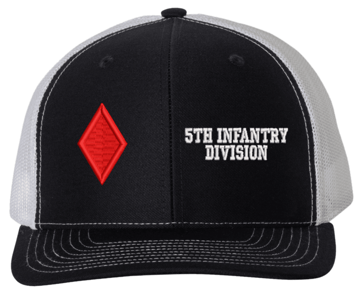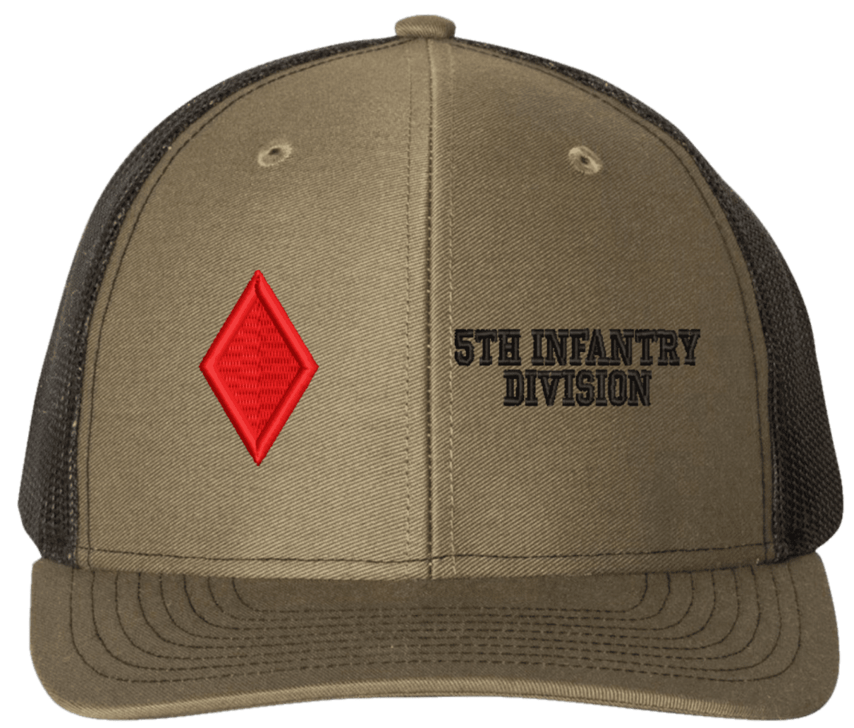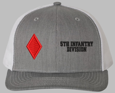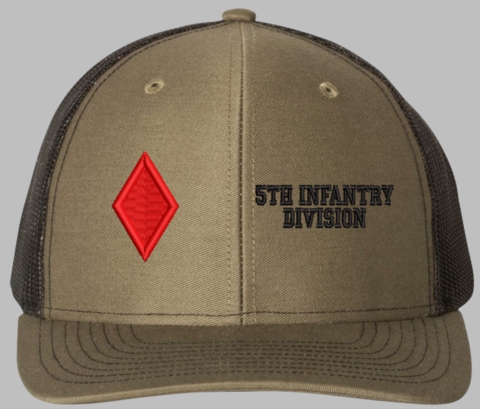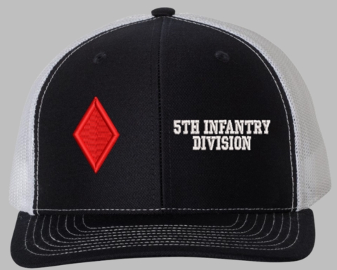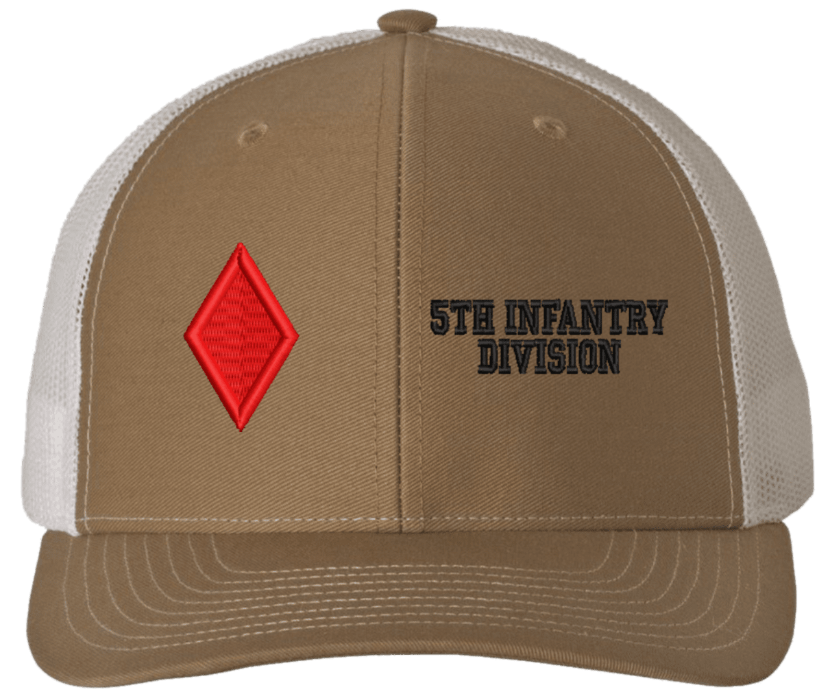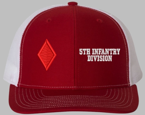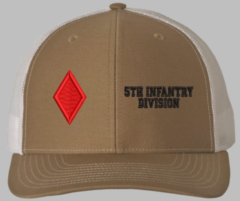 MilitaryBest is proud to offer this Mesh Back 5th Infantry Division Split Cap. The 5th Infantry Division Insignia is embroidered onto a 6x panel mid/low profile mesh back cap and is crisp, clean, and sure to be loved by people of all ages! As with all MilitaryBest caps and apparel your satisfaction is guaranteed!Caps ordered with embroidered back text requires an additional 1 to 2 days of production time. All personalized caps will be embroidered in ALL CAPITAL LETTERS. Caps personalized with back text are not returnable unless there is a material defect in the cap.