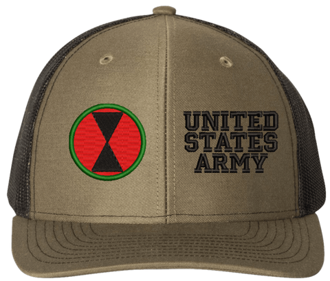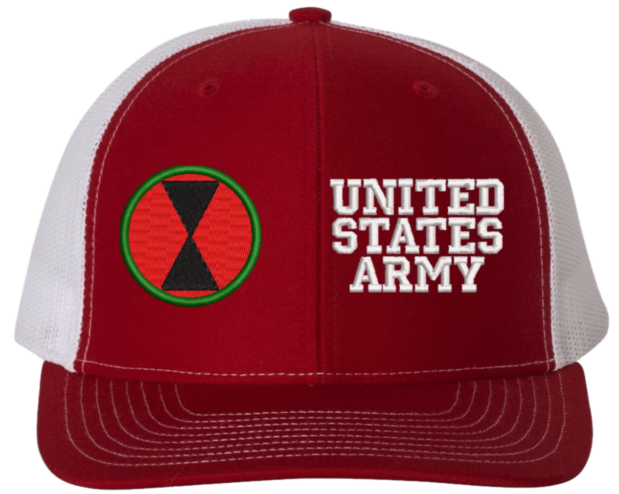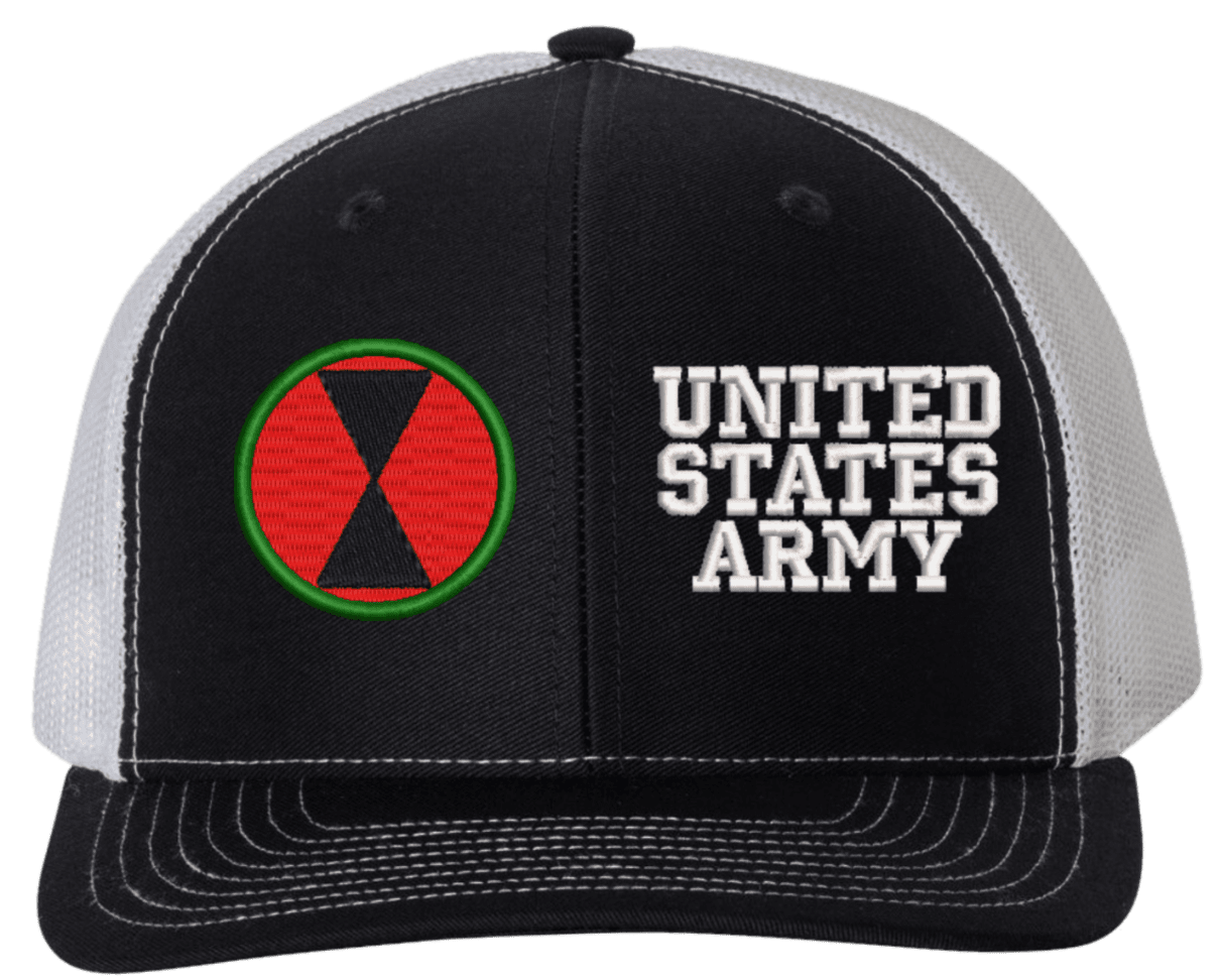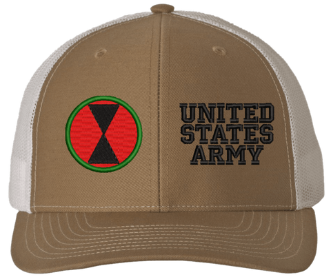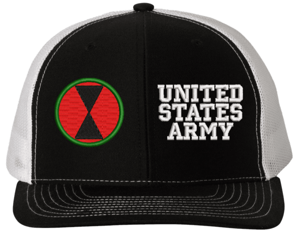 MilitaryBest is proud to offer this Mesh Back 7th Infantry United States Army Split Cap. The 7th Infantry Division Insignia is embroidered onto a 6x panel mid/low profile mesh back cap and is crisp, clean, and sure to be loved by people of all ages! As with all MilitaryBest caps and apparel your satisfaction is guaranteed!Caps ordered with embroidered back text requires an additional 1 to 2 days of production time. All personalized caps will be embroidered in ALL CAPITAL LETTERS. Caps personalized with back text are not returnable unless there is a material defect in the cap.