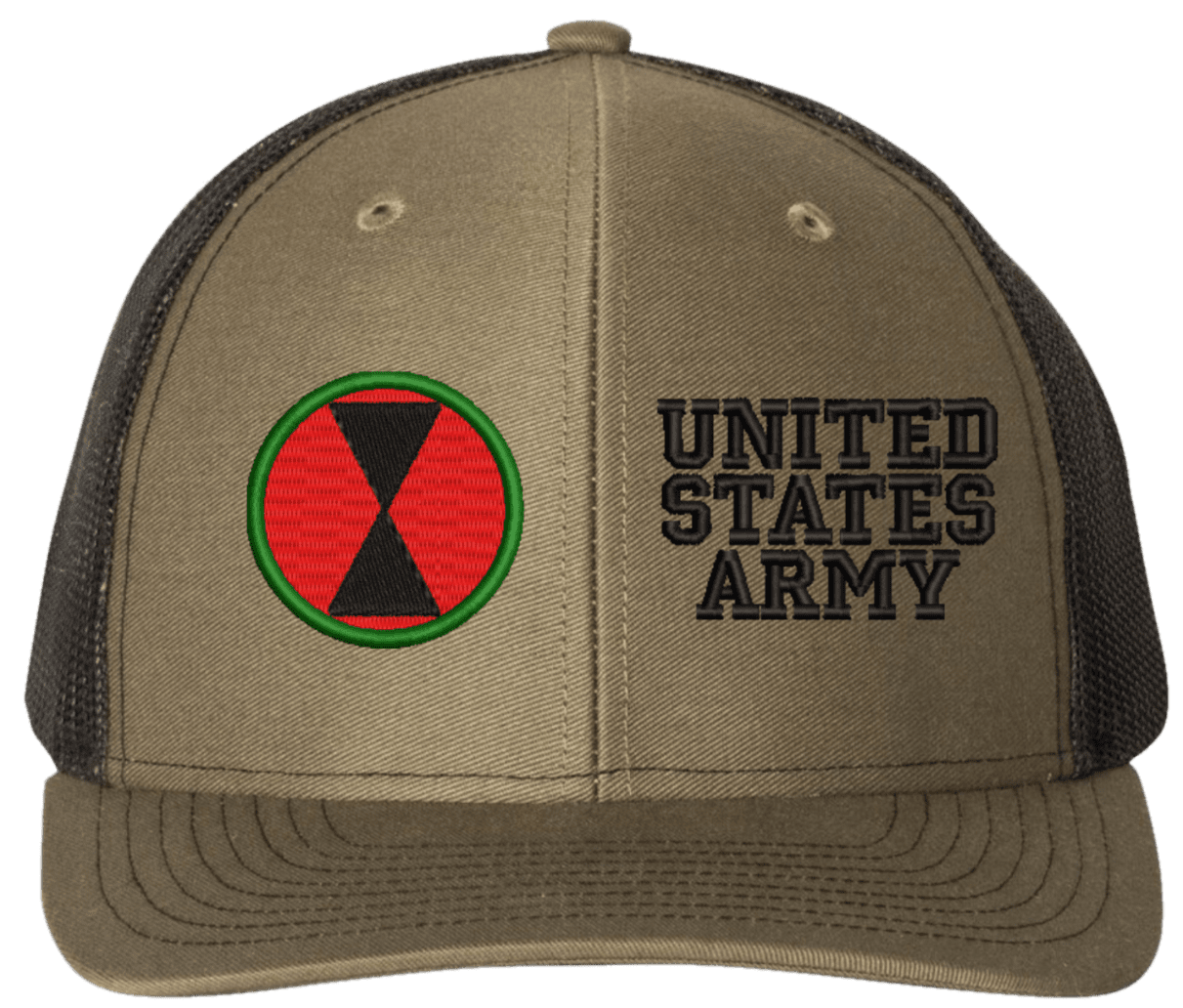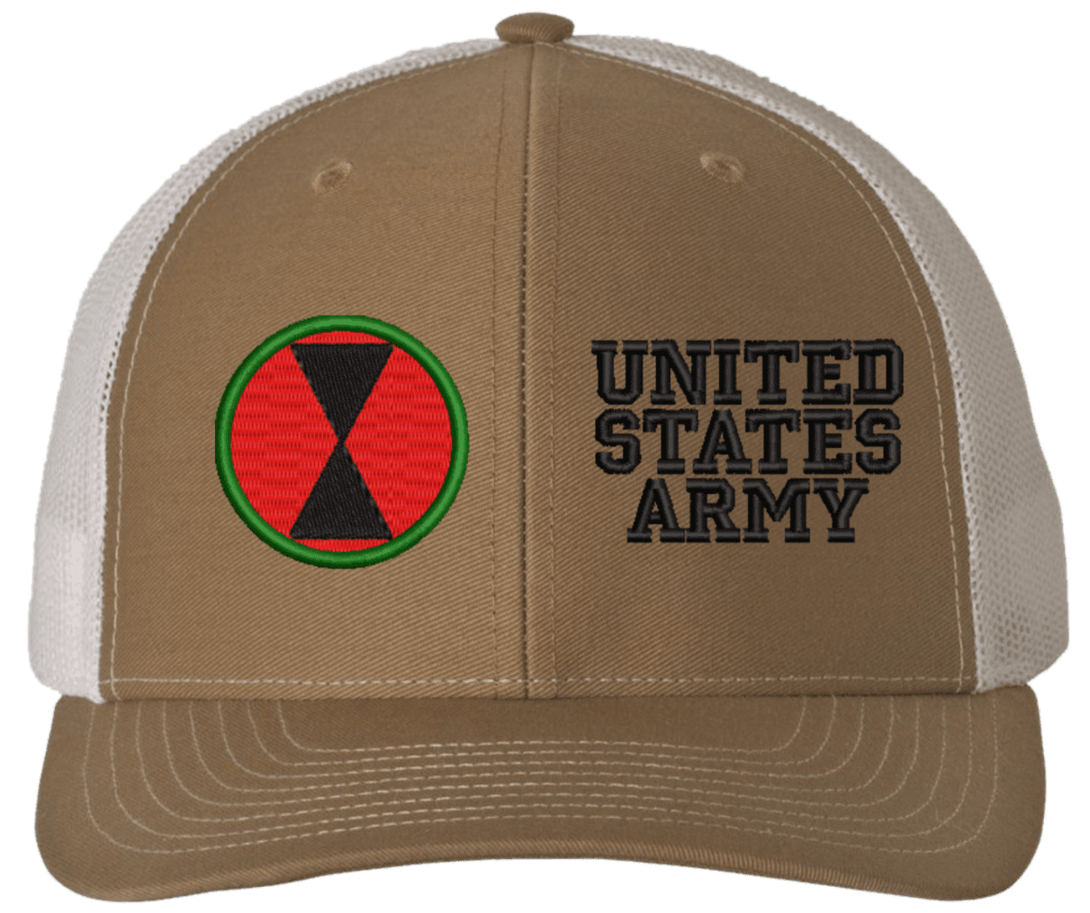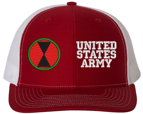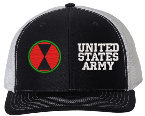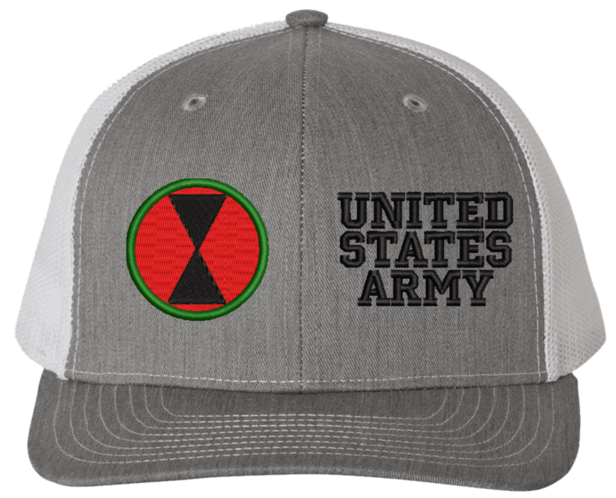 MilitaryBest is proud to offer this Mesh Back 7th Infantry United States Army Split Cap. The 7th Infantry Division Insignia is embroidered onto a 6x panel mid/low profile mesh back cap and is crisp, clean, and sure to be loved by people of all ages! As with all MilitaryBest caps and apparel your satisfaction is guaranteed!Caps ordered with embroidered back text requires an additional 1 to 2 days of production time. All personalized caps will be embroidered in ALL CAPITAL LETTERS. Caps personalized with back text are not returnable unless there is a material defect in the cap.
