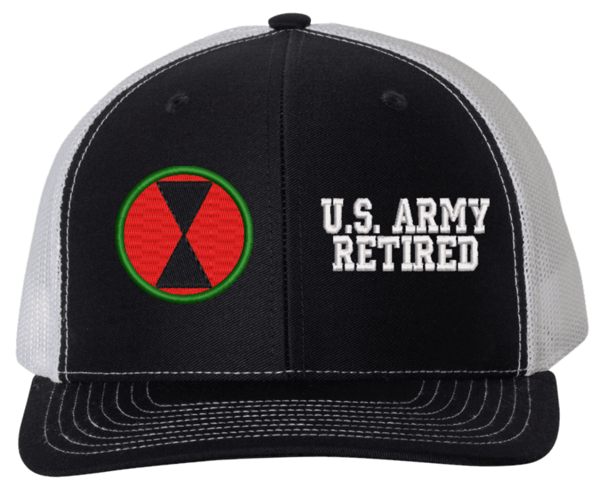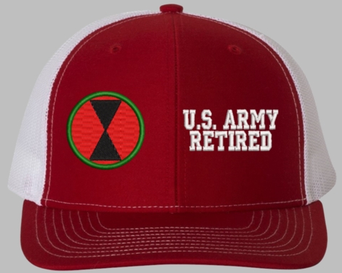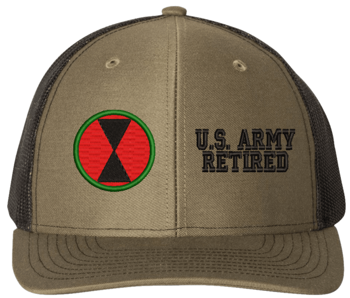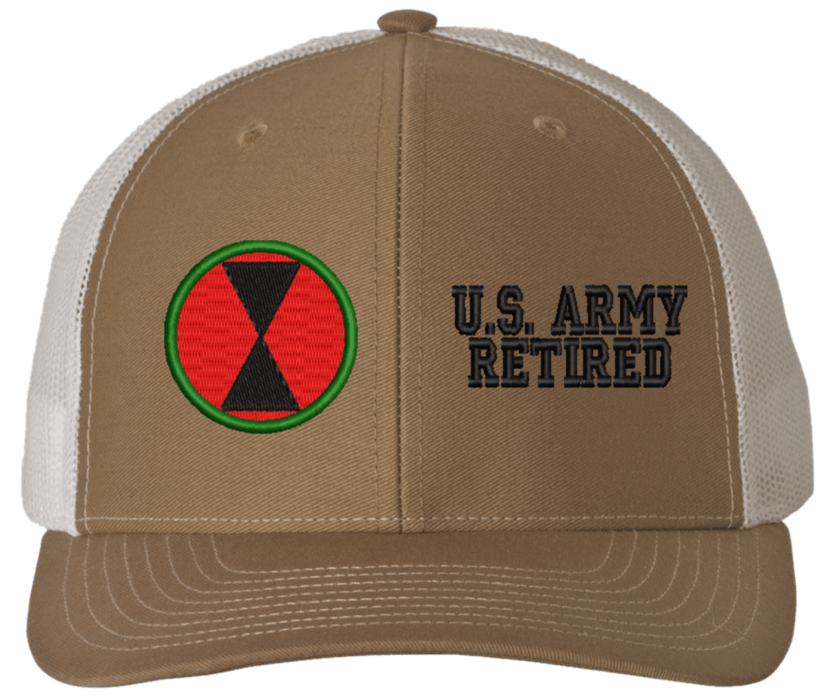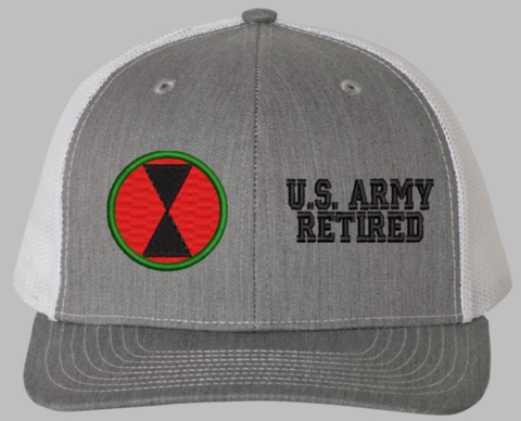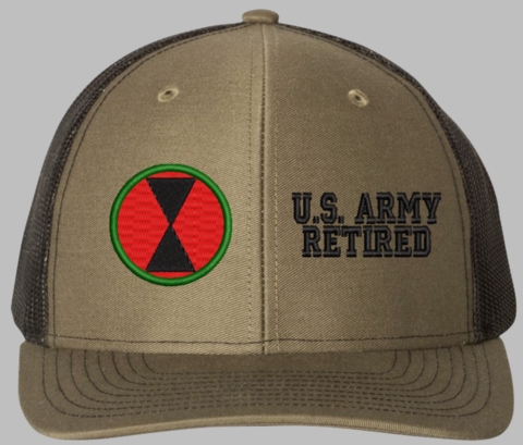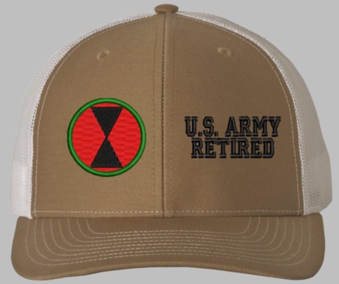 MilitaryBest is proud to offer this Mesh Back 7th Infantry U.S. Army Retired Split Cap. The 7th Infantry Division Insignia is embroidered onto a 6x panel mid/low profile mesh back cap and is crisp, clean, and sure to be loved by people of all ages! As with all MilitaryBest caps and apparel your satisfaction is guaranteed!Caps ordered with embroidered back text requires an additional 1 to 2 days of production time. All personalized caps will be embroidered in ALL CAPITAL LETTERS. Caps personalized with back text are not returnable unless there is a material defect in the cap.