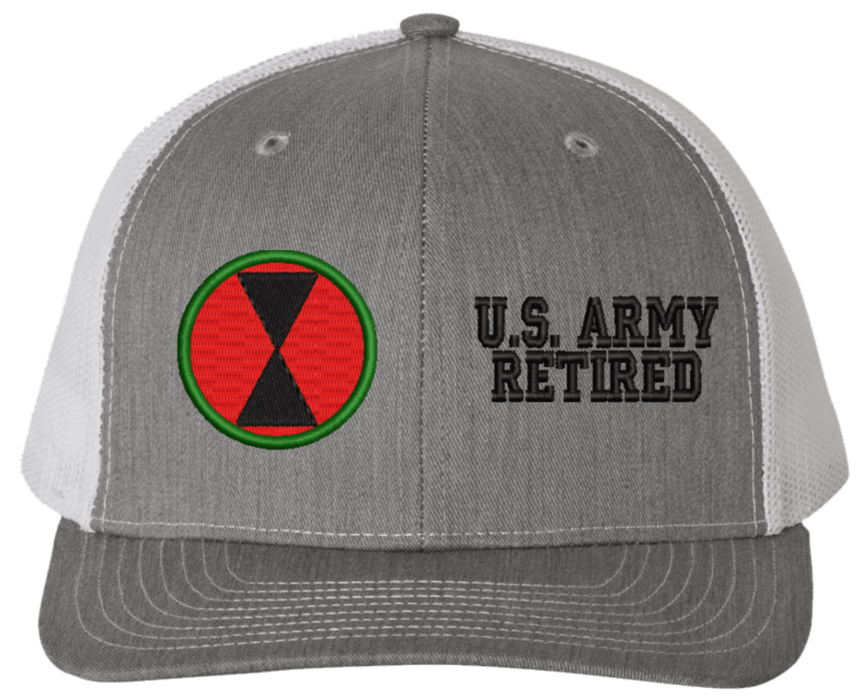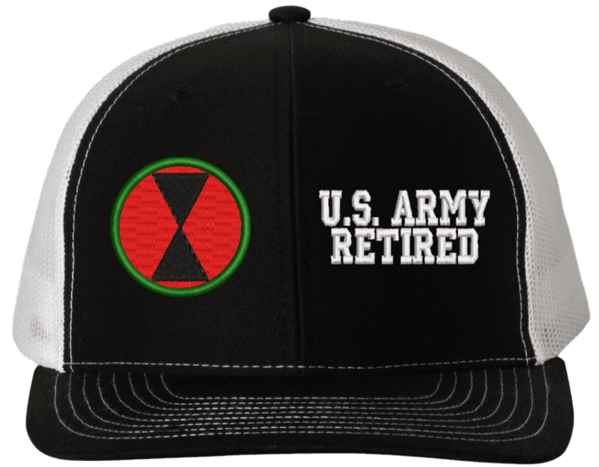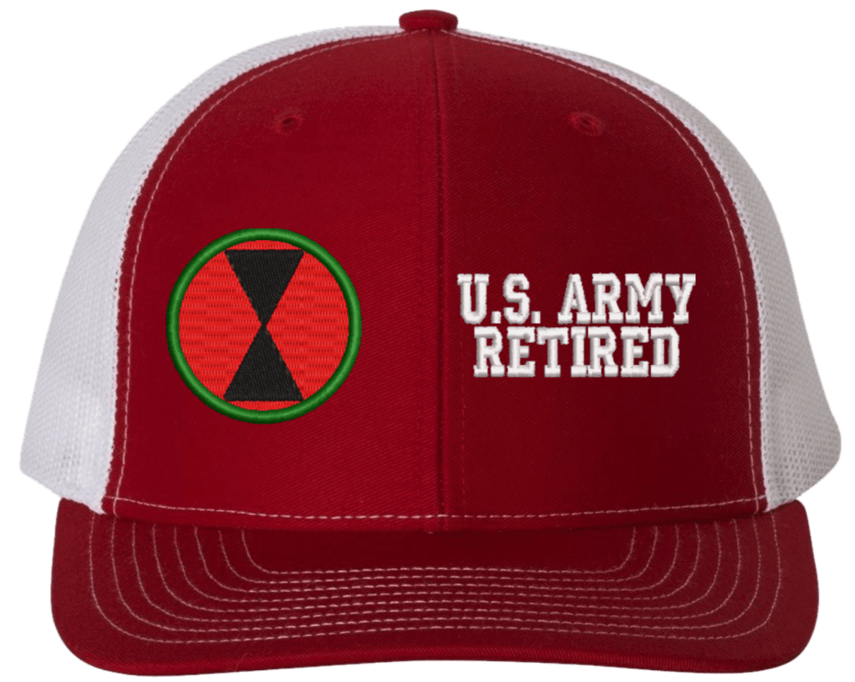 MilitaryBest is proud to offer this Mesh Back 7th Infantry U.S. Army Retired Split Cap. The 7th Infantry Division Insignia is embroidered onto a 6x panel mid/low profile mesh back cap and is crisp, clean, and sure to be loved by people of all ages! As with all MilitaryBest caps and apparel your satisfaction is guaranteed!Caps ordered with embroidered back text requires an additional 1 to 2 days of production time. All personalized caps will be embroidered in ALL CAPITAL LETTERS. Caps personalized with back text are not returnable unless there is a material defect in the cap.