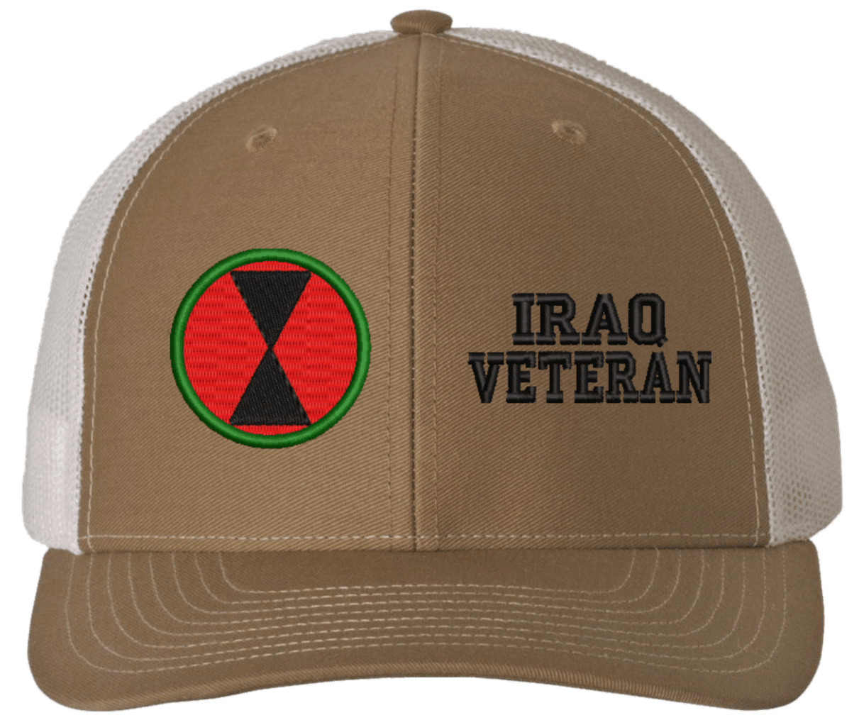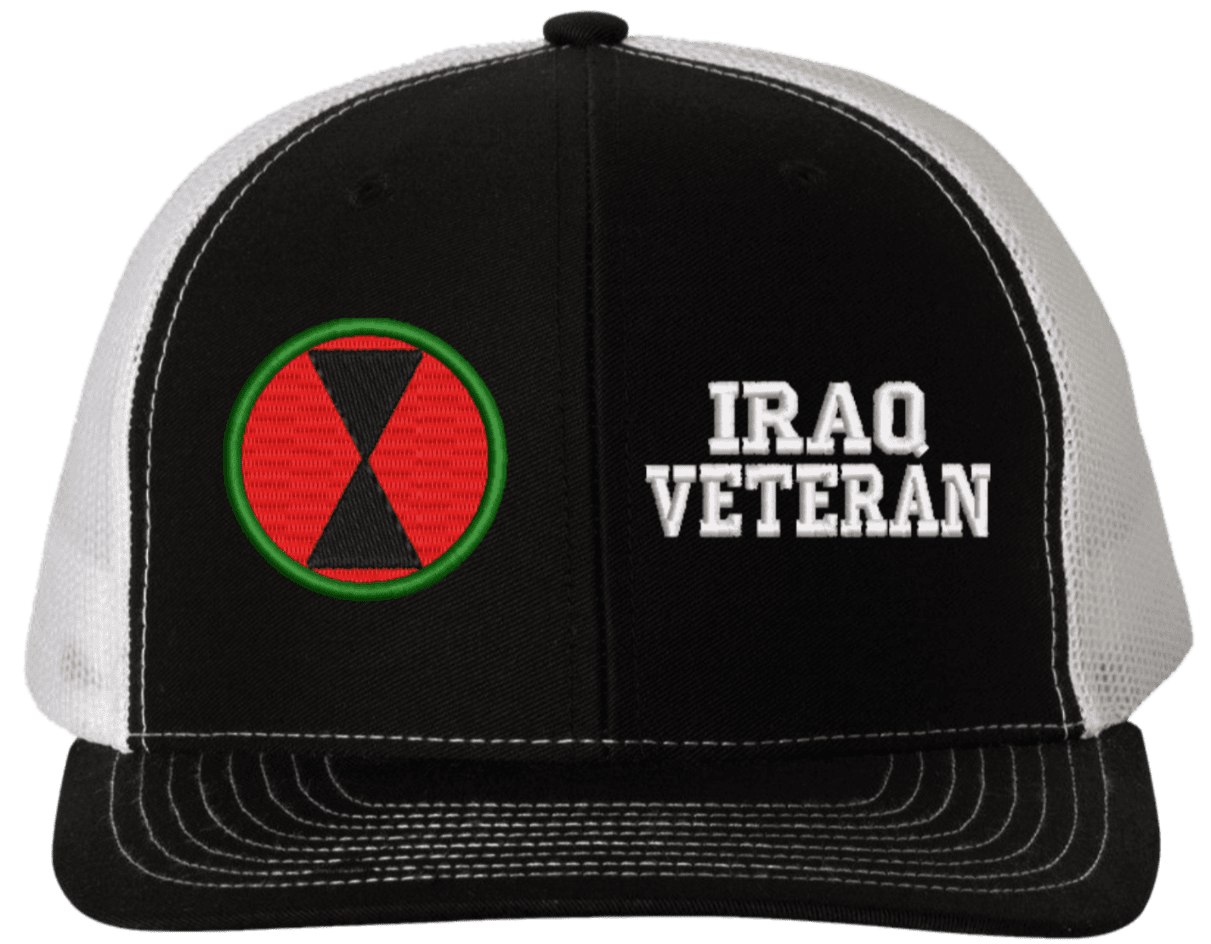 MilitaryBest is proud to offer this Mesh Back 7th Infantry Iraq Veteran Split Cap. The 7th Infantry Division Insignia is embroidered onto a 6x panel mid/low profile mesh back cap and is crisp, clean, and sure to be loved by people of all ages! As with all MilitaryBest caps and apparel your satisfaction is guaranteed!Caps ordered with embroidered back text requires an additional 1 to 2 days of production time. All personalized caps will be embroidered in ALL CAPITAL LETTERS. Caps personalized with back text are not returnable unless there is a material defect in the cap.