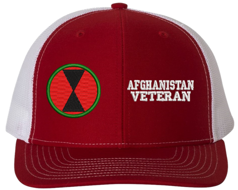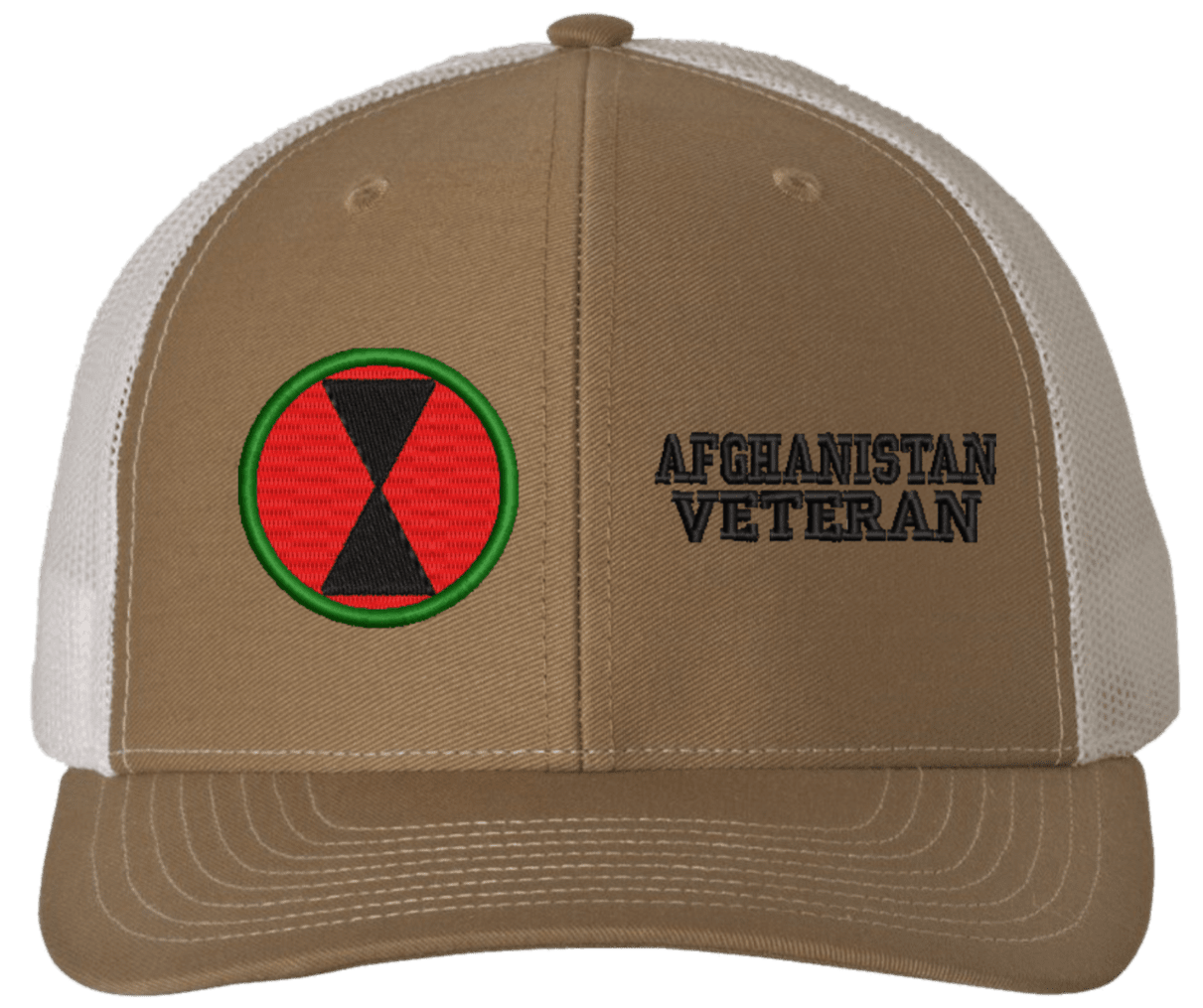 MilitaryBest is proud to offer this Mesh Back 7th Infantry Afghanistan Veteran Split Cap. The 7th Infantry Division Insignia is embroidered onto a 6x panel mid/low profile mesh back cap and is crisp, clean, and sure to be loved by people of all ages! As with all MilitaryBest caps and apparel your satisfaction is guaranteed!Caps ordered with embroidered back text requires an additional 1 to 2 days of production time. All personalized caps will be embroidered in ALL CAPITAL LETTERS. Caps personalized with back text are not returnable unless there is a material defect in the cap.