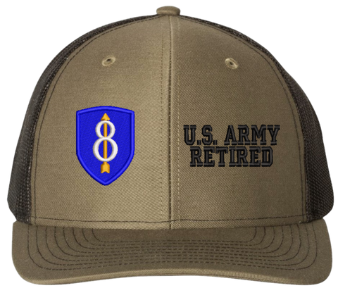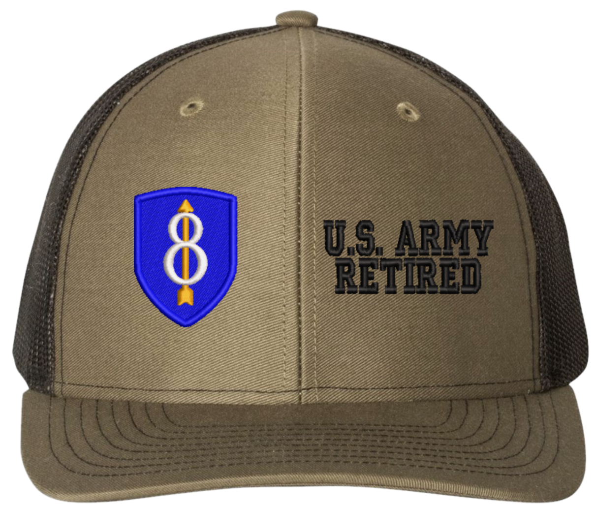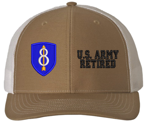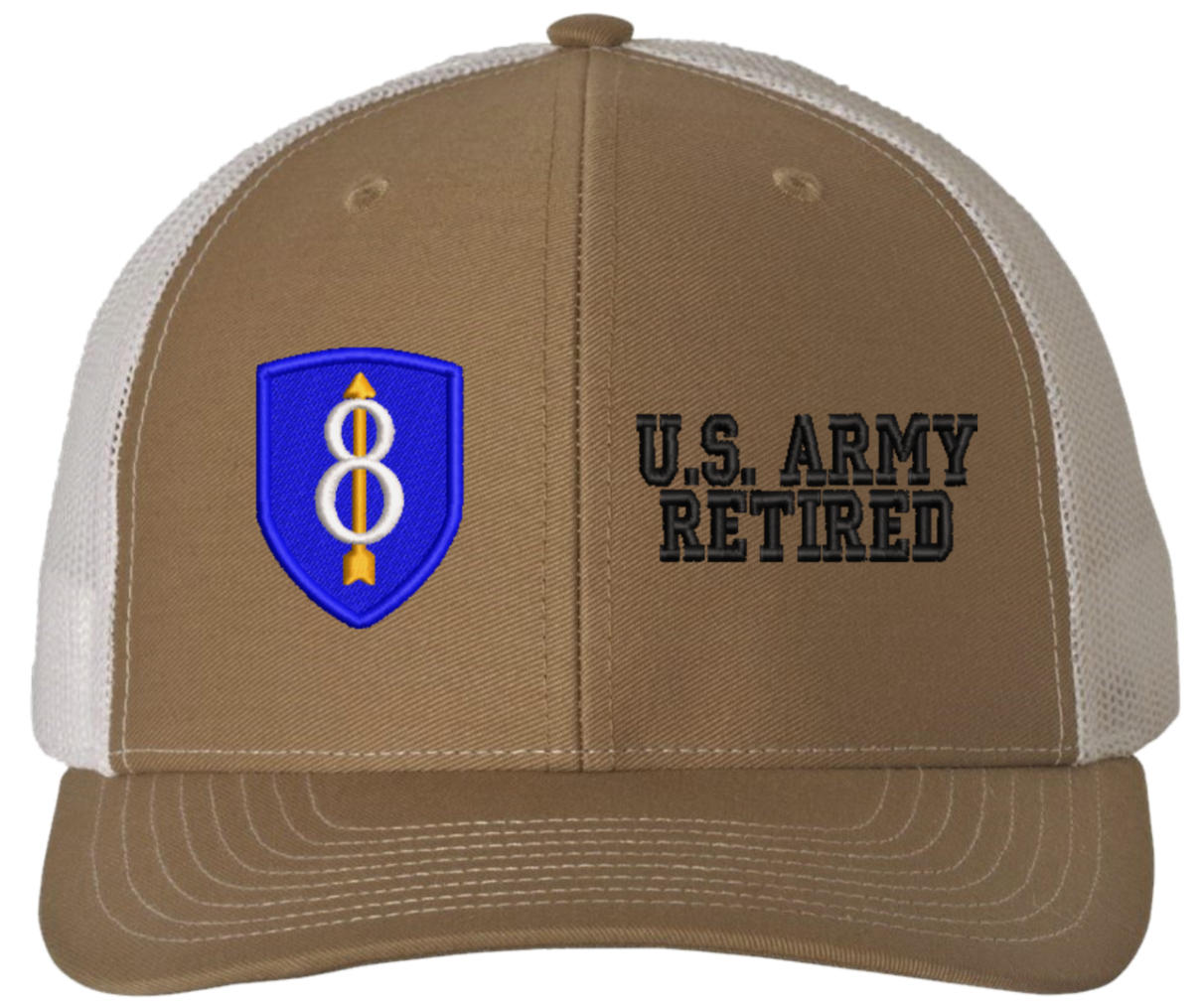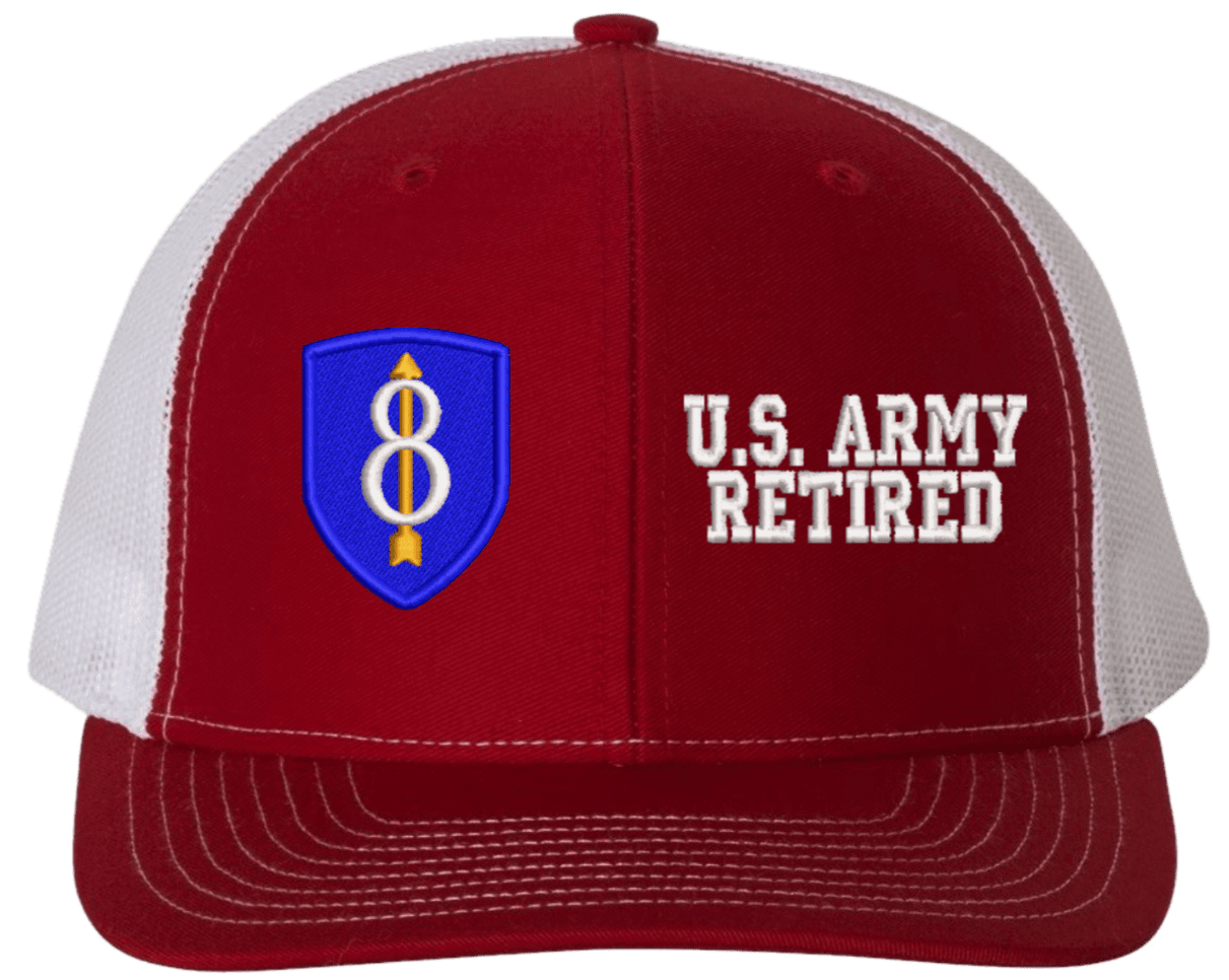 MilitaryBest is proud to offer this Mesh Back 8th Infantry U.S. Army Retired Split Cap. The 8th Infantry Division Insignia is embroidered onto a 6x panel mid/low profile mesh back cap and is crisp, clean, and sure to be loved by people of all ages! As with all MilitaryBest caps and apparel your satisfaction is guaranteed!Caps ordered with embroidered back text requires an additional 1 to 2 days of production time. All personalized caps will be embroidered in ALL CAPITAL LETTERS. Caps personalized with back text are not returnable unless there is a material defect in the cap.