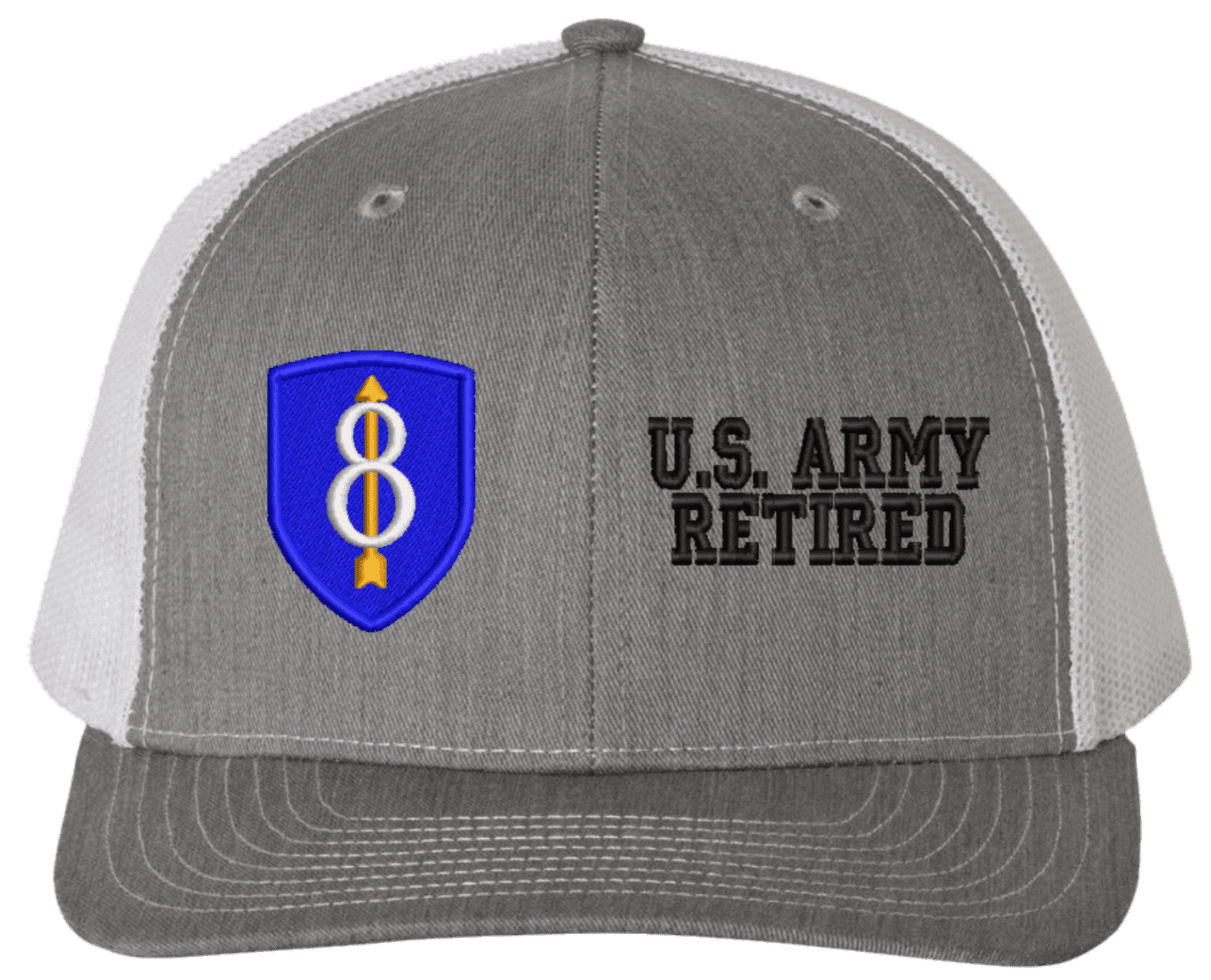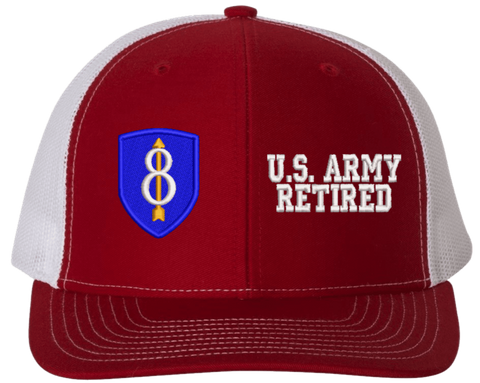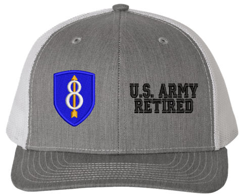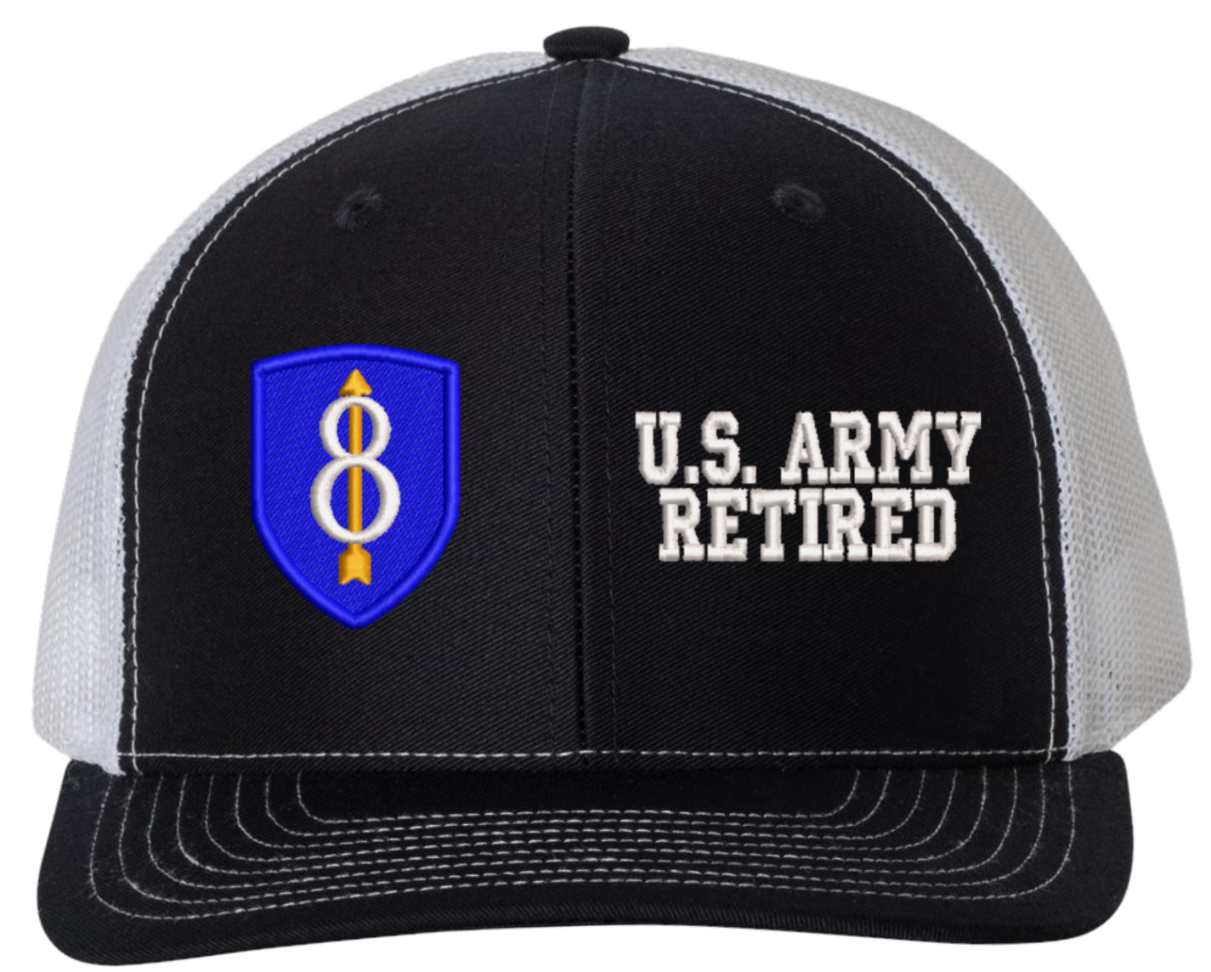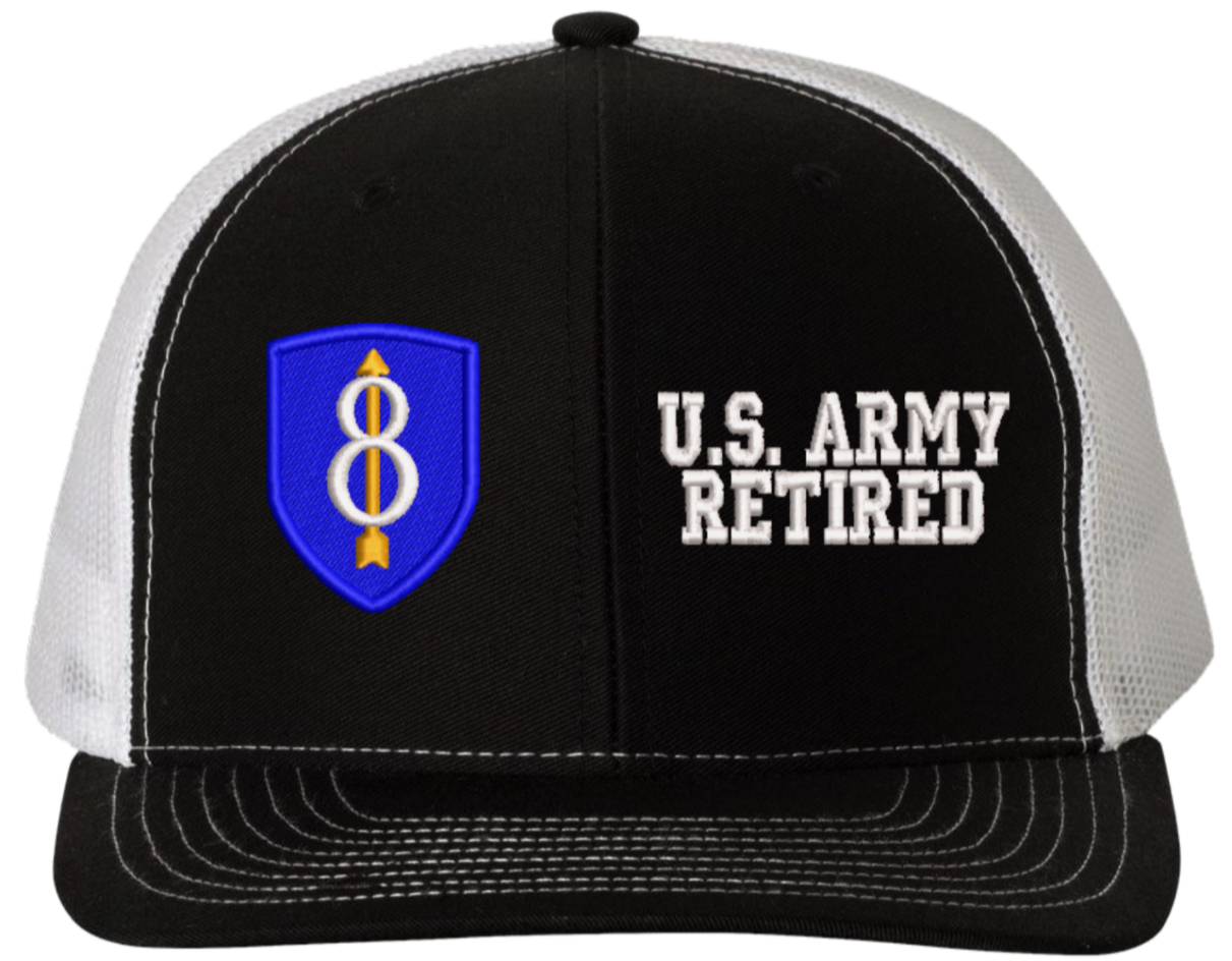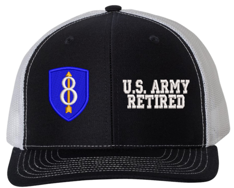 MilitaryBest is proud to offer this Mesh Back 8th Infantry U.S. Army Retired Split Cap. The 8th Infantry Division Insignia is embroidered onto a 6x panel mid/low profile mesh back cap and is crisp, clean, and sure to be loved by people of all ages! As with all MilitaryBest caps and apparel your satisfaction is guaranteed!Caps ordered with embroidered back text requires an additional 1 to 2 days of production time. All personalized caps will be embroidered in ALL CAPITAL LETTERS. Caps personalized with back text are not returnable unless there is a material defect in the cap.
