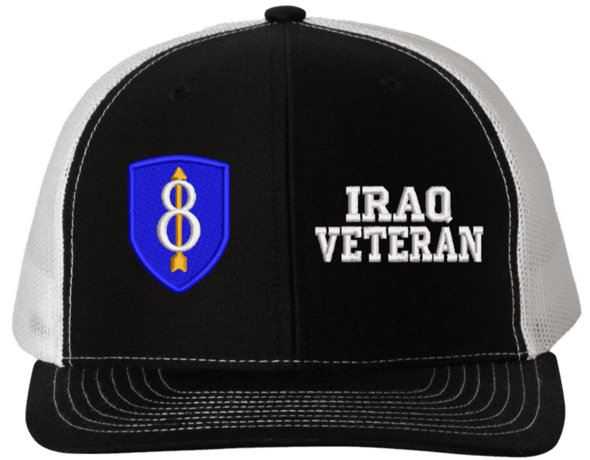 MilitaryBest is proud to offer this Mesh Back 8th Infantry Iraq Veteran Split Cap. The 8th Infantry Division Insignia is embroidered onto a 6x panel mid/low profile mesh back cap and is crisp, clean, and sure to be loved by people of all ages! As with all MilitaryBest caps and apparel your satisfaction is guaranteed!Caps ordered with embroidered back text requires an additional 1 to 2 days of production time. All personalized caps will be embroidered in ALL CAPITAL LETTERS. Caps personalized with back text are not returnable unless there is a material defect in the cap.