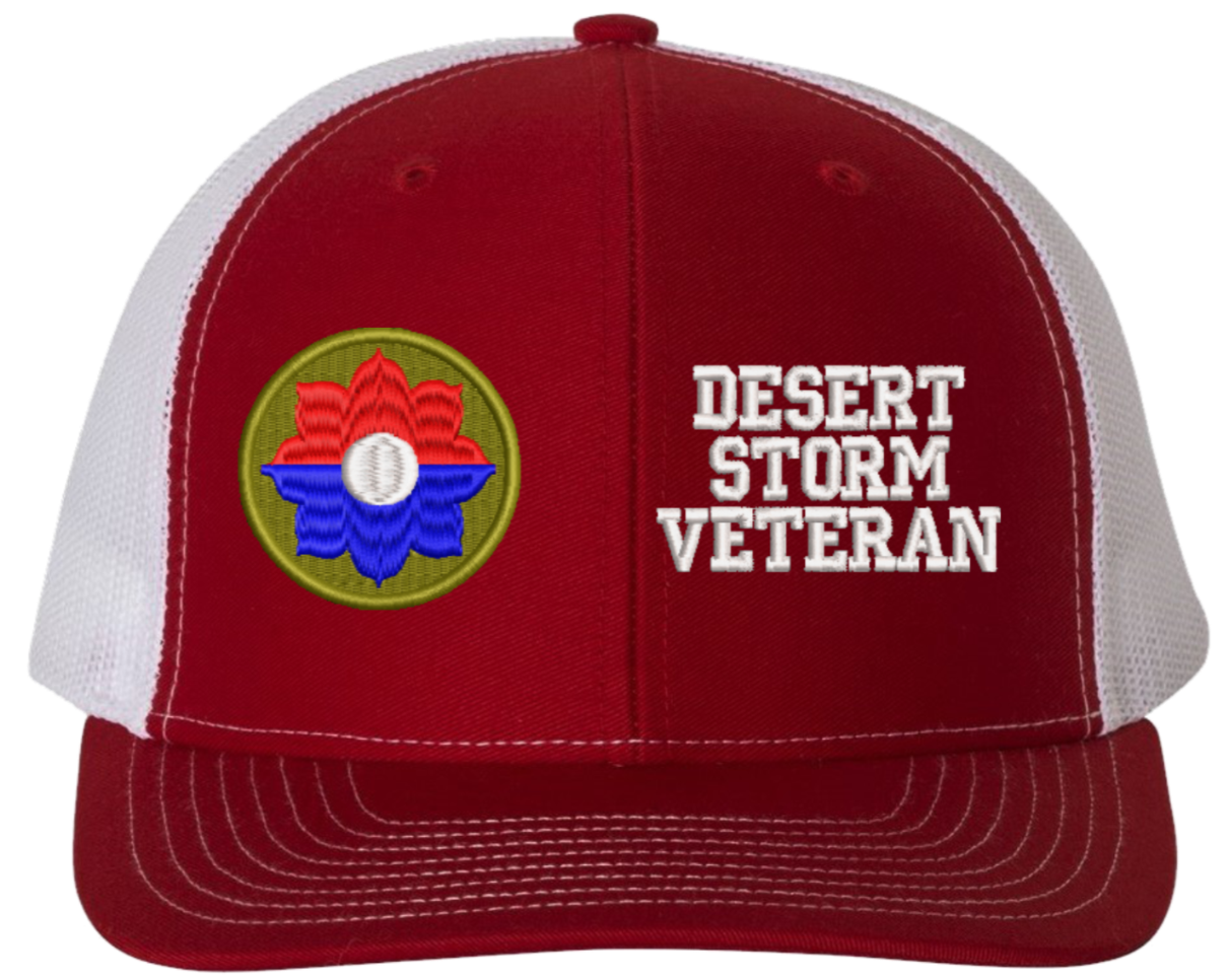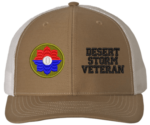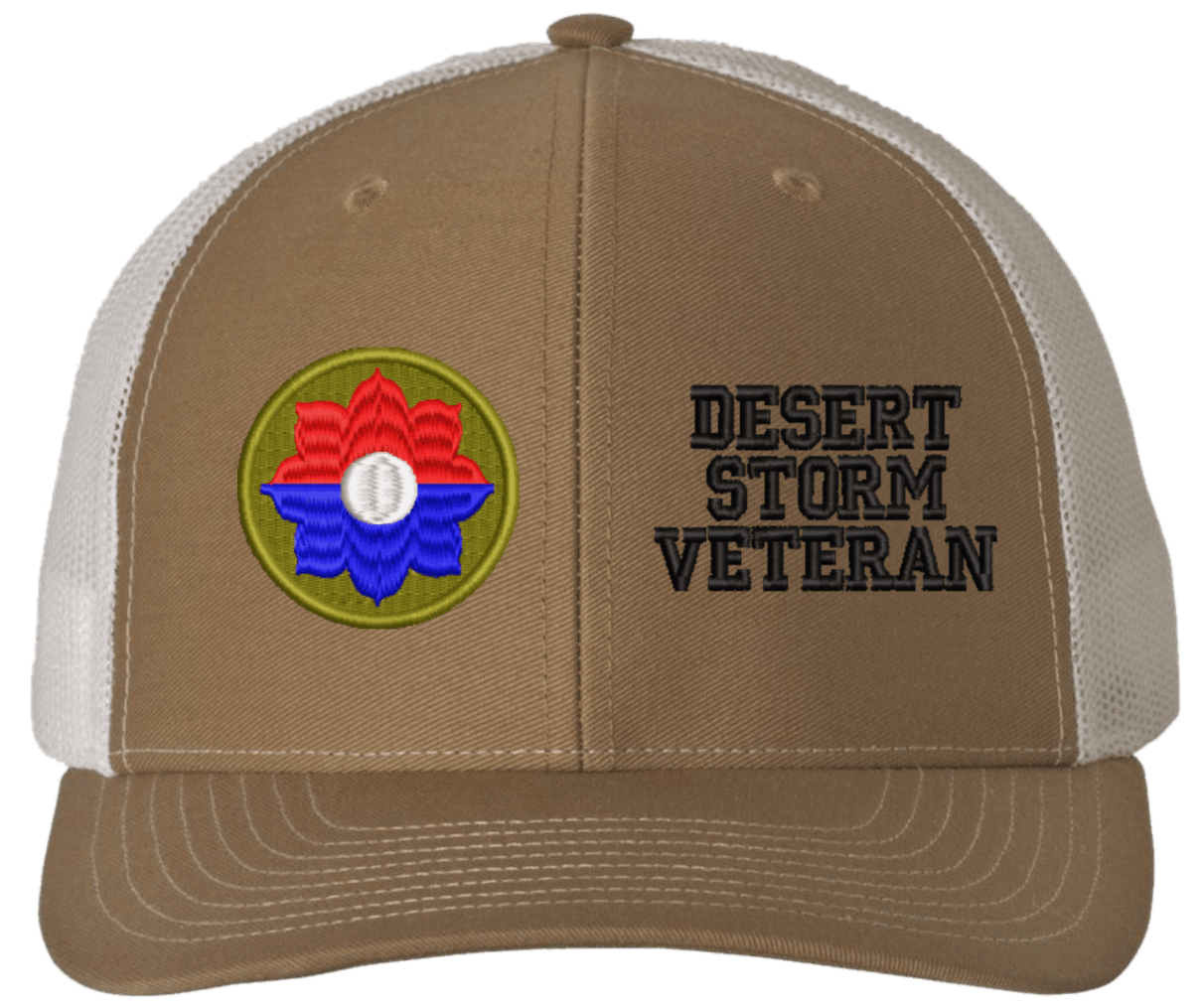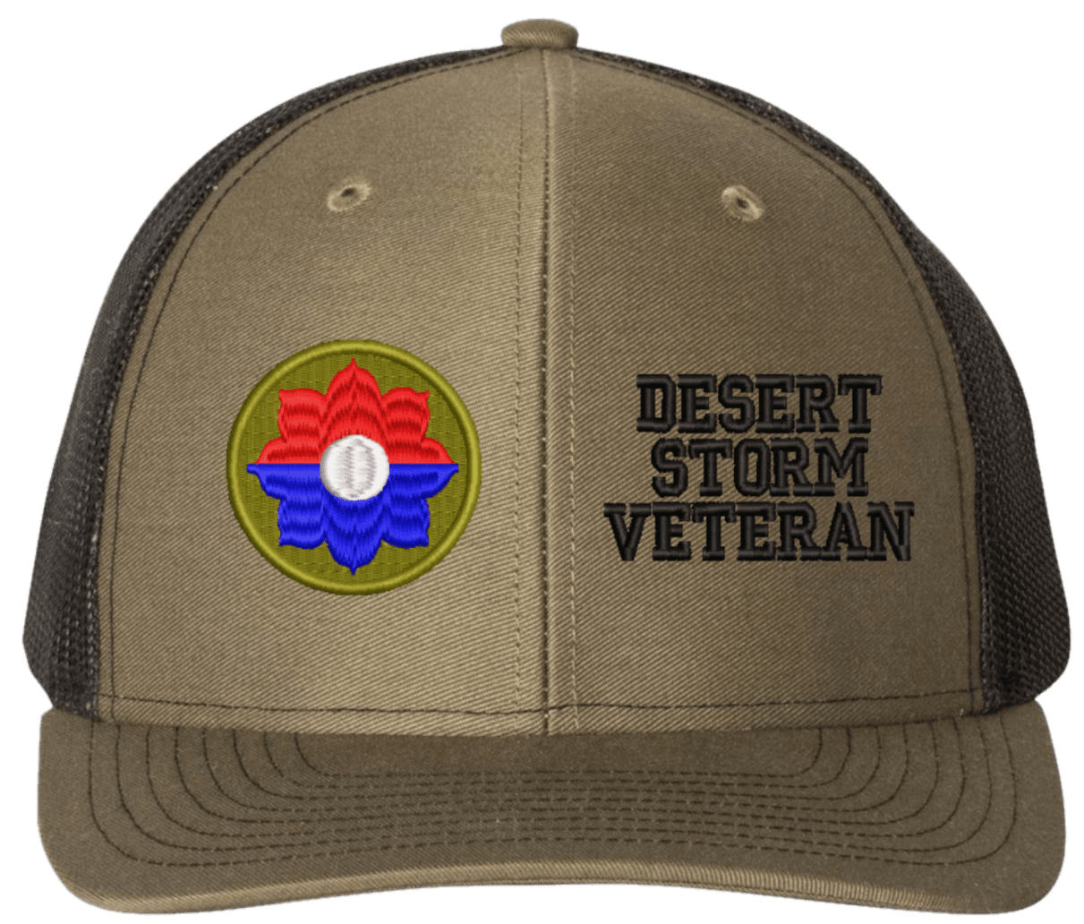 MilitaryBest is proud to offer this Mesh Back 9th Infantry Desert Storm Veteran Split Cap. The 9th Infantry Division Insignia is embroidered onto a 6x panel mid/low profile mesh back cap and is crisp, clean, and sure to be loved by people of all ages! As with all MilitaryBest caps and apparel your satisfaction is guaranteed!Caps ordered with embroidered back text requires an additional 1 to 2 days of production time. All personalized caps will be embroidered in ALL CAPITAL LETTERS. Caps personalized with back text are not returnable unless there is a material defect in the cap.