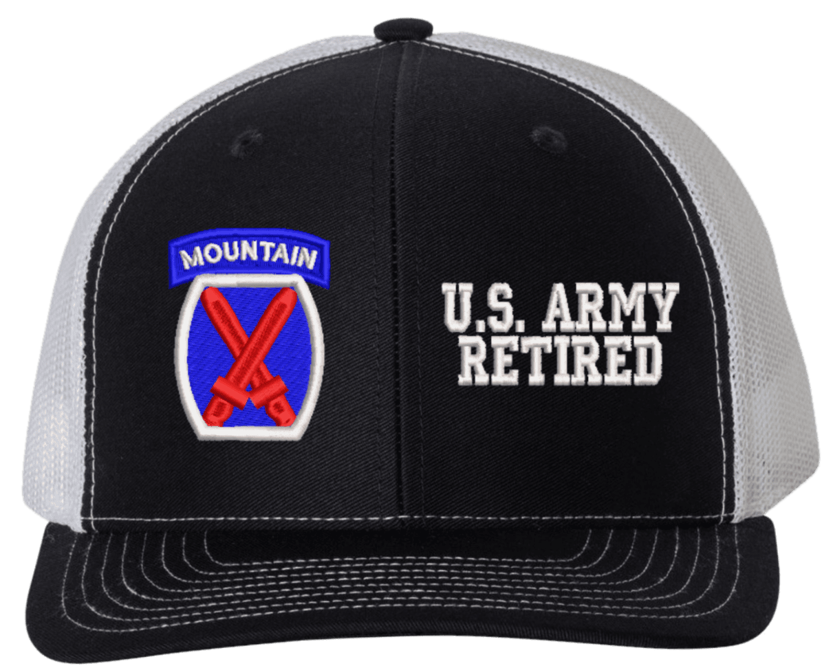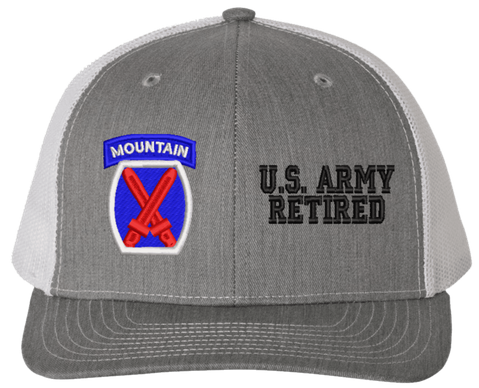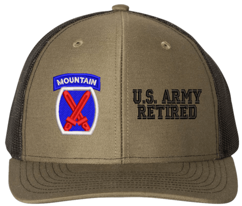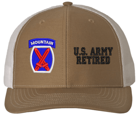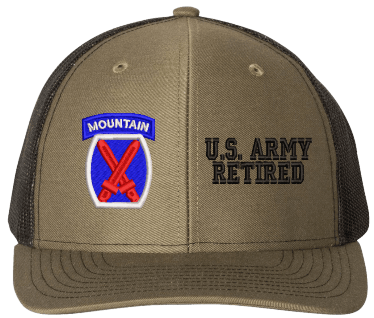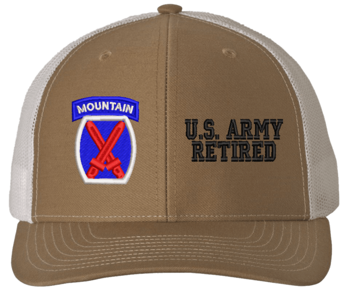 MilitaryBest is proud to offer this Mesh Back 10th Mountain U.S. Army Retired Split Cap. The 10th Mountain Division Insignia is embroidered onto a 6x panel mid/low profile mesh back cap and is crisp, clean, and sure to be loved by people of all ages! As with all MilitaryBest caps and apparel your satisfaction is guaranteed!Caps ordered with embroidered back text requires an additional 1 to 2 days of production time. All personalized caps will be embroidered in ALL CAPITAL LETTERS. Caps personalized with back text are not returnable unless there is a material defect in the cap.