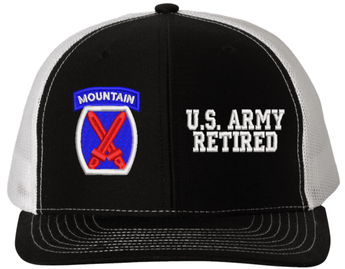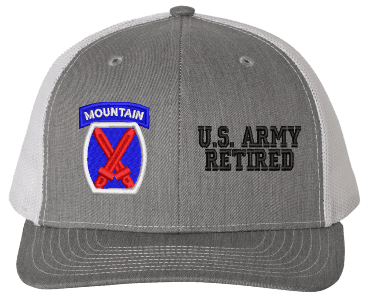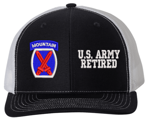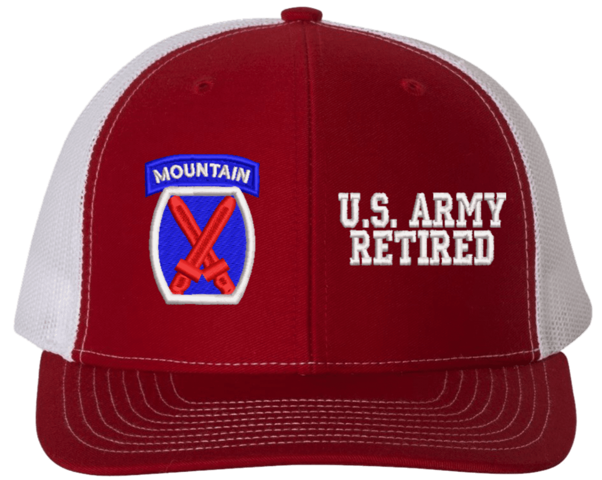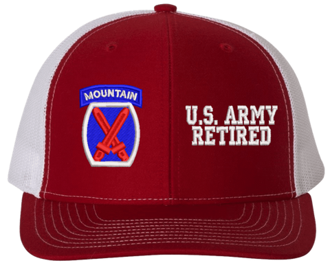 MilitaryBest is proud to offer this Mesh Back 10th Mountain U.S. Army Retired Split Cap. The 10th Mountain Division Insignia is embroidered onto a 6x panel mid/low profile mesh back cap and is crisp, clean, and sure to be loved by people of all ages! As with all MilitaryBest caps and apparel your satisfaction is guaranteed!Caps ordered with embroidered back text requires an additional 1 to 2 days of production time. All personalized caps will be embroidered in ALL CAPITAL LETTERS. Caps personalized with back text are not returnable unless there is a material defect in the cap.
