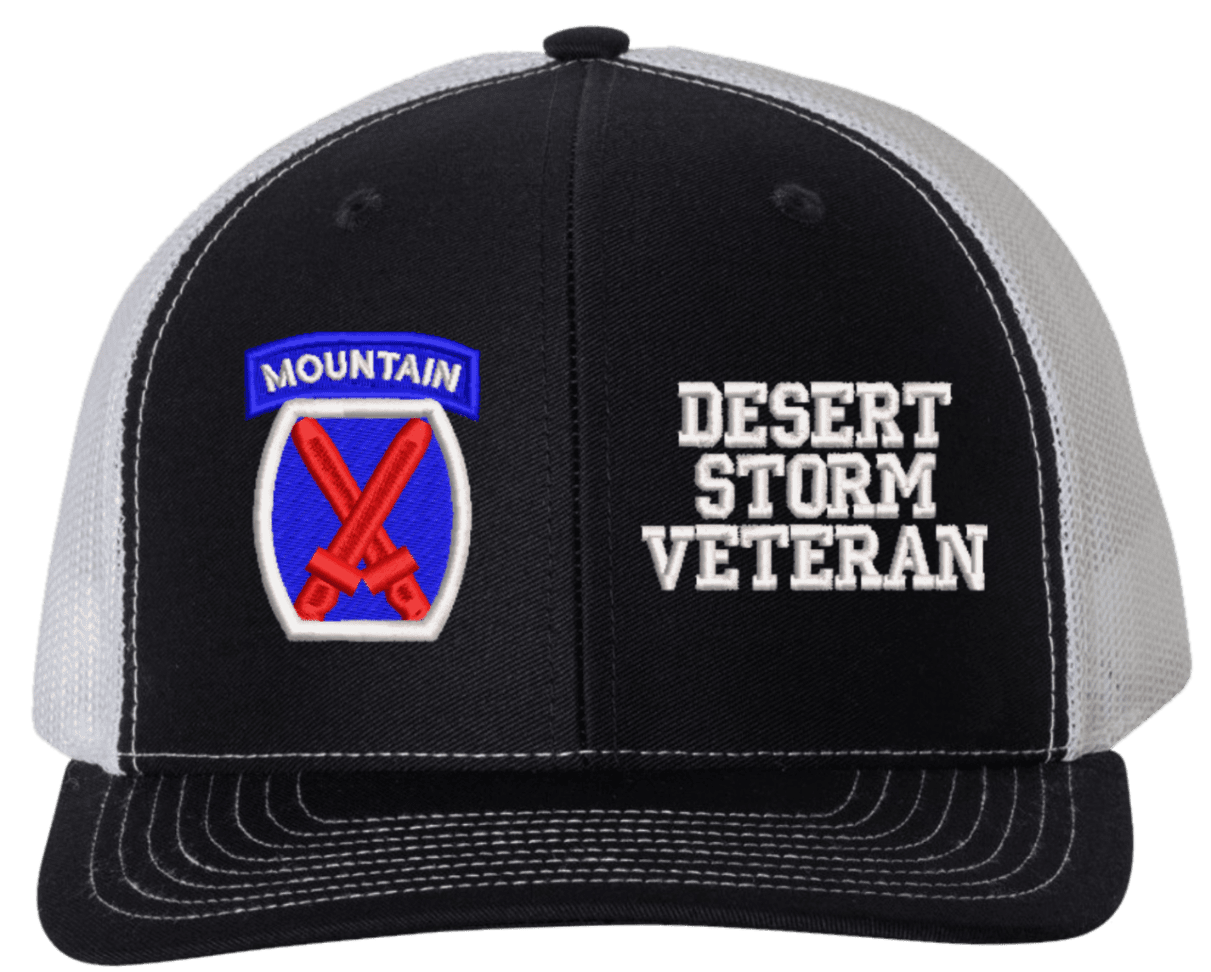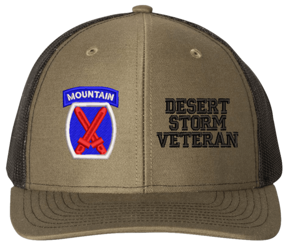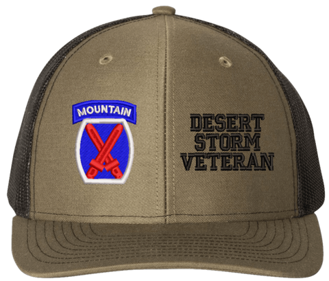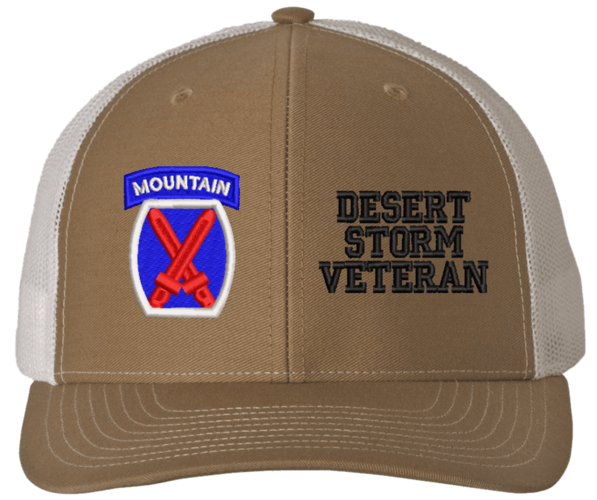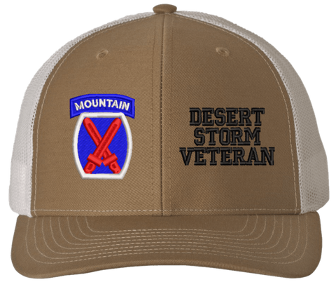 MilitaryBest is proud to offer this Mesh Back 10th Mountain Desert Storm Veteran Split Cap. The 10th Mountain Division Insignia is embroidered onto a 6x panel mid/low profile mesh back cap and is crisp, clean, and sure to be loved by people of all ages! As with all MilitaryBest caps and apparel your satisfaction is guaranteed!Caps ordered with embroidered back text requires an additional 1 to 2 days of production time. All personalized caps will be embroidered in ALL CAPITAL LETTERS. Caps personalized with back text are not returnable unless there is a material defect in the cap.