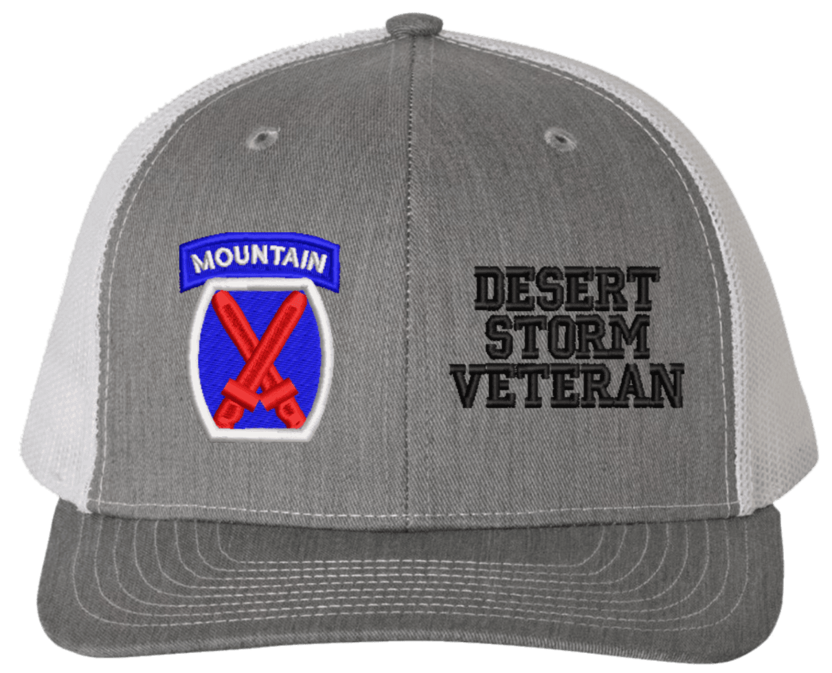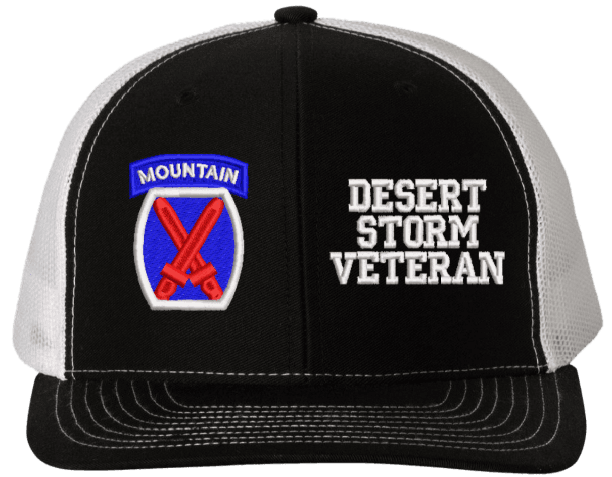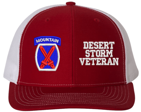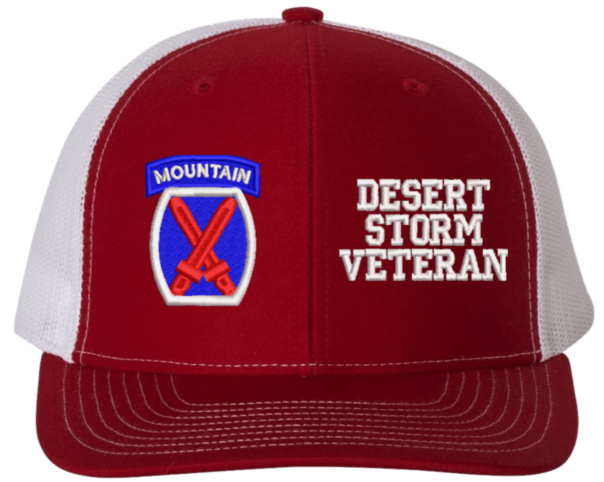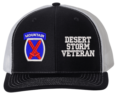 MilitaryBest is proud to offer this Mesh Back 10th Mountain Desert Storm Veteran Split Cap. The 10th Mountain Division Insignia is embroidered onto a 6x panel mid/low profile mesh back cap and is crisp, clean, and sure to be loved by people of all ages! As with all MilitaryBest caps and apparel your satisfaction is guaranteed!Caps ordered with embroidered back text requires an additional 1 to 2 days of production time. All personalized caps will be embroidered in ALL CAPITAL LETTERS. Caps personalized with back text are not returnable unless there is a material defect in the cap.
