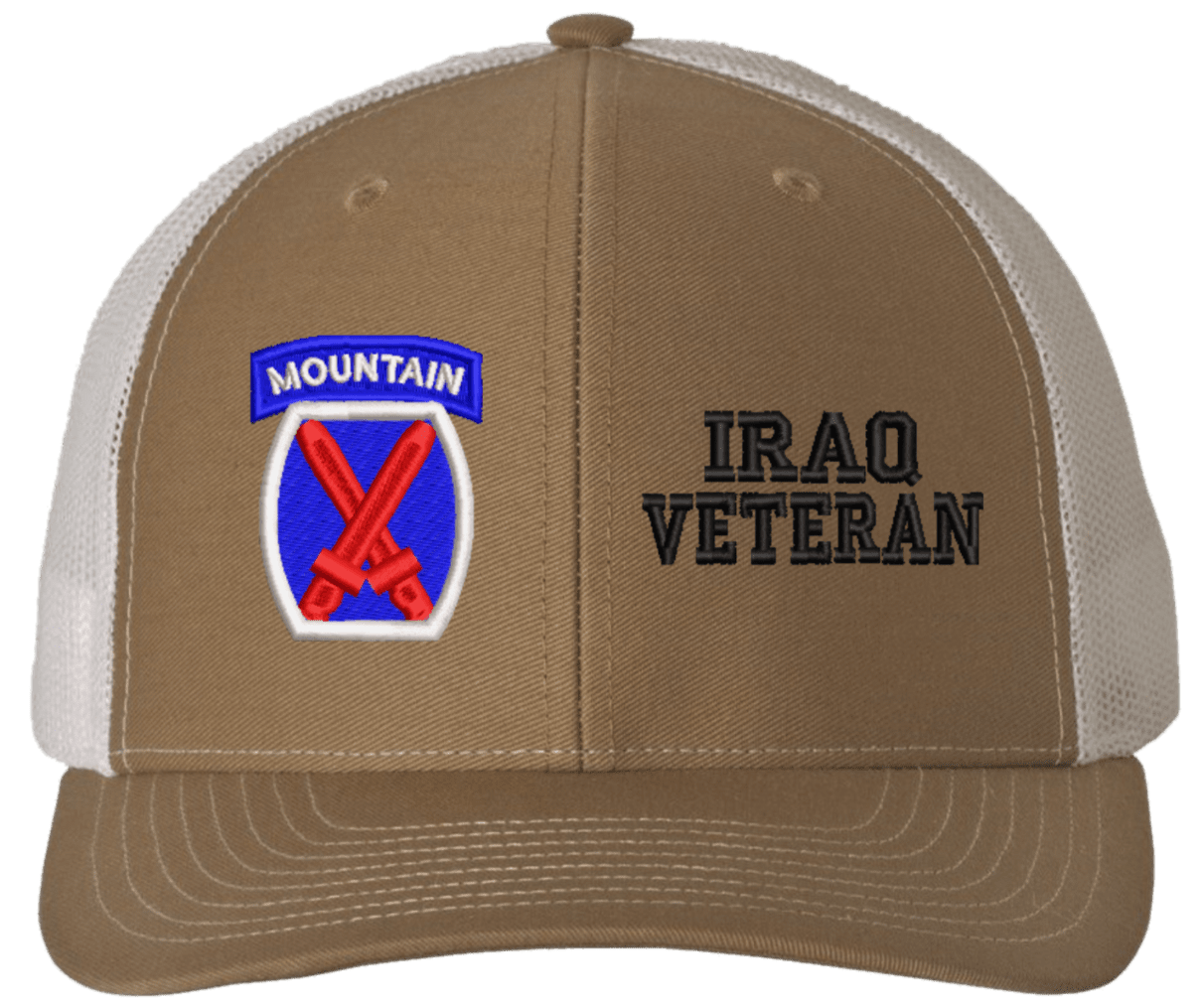 MilitaryBest is proud to offer this Mesh Back 10th Mountain Iraq Veteran Split Cap. The 10th Mountain Division Insignia is embroidered onto a 6x panel mid/low profile mesh back cap and is crisp, clean, and sure to be loved by people of all ages! As with all MilitaryBest caps and apparel your satisfaction is guaranteed!Caps ordered with embroidered back text requires an additional 1 to 2 days of production time. All personalized caps will be embroidered in ALL CAPITAL LETTERS. Caps personalized with back text are not returnable unless there is a material defect in the cap.