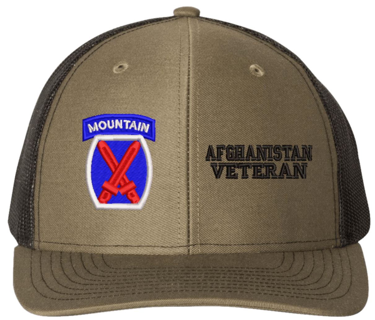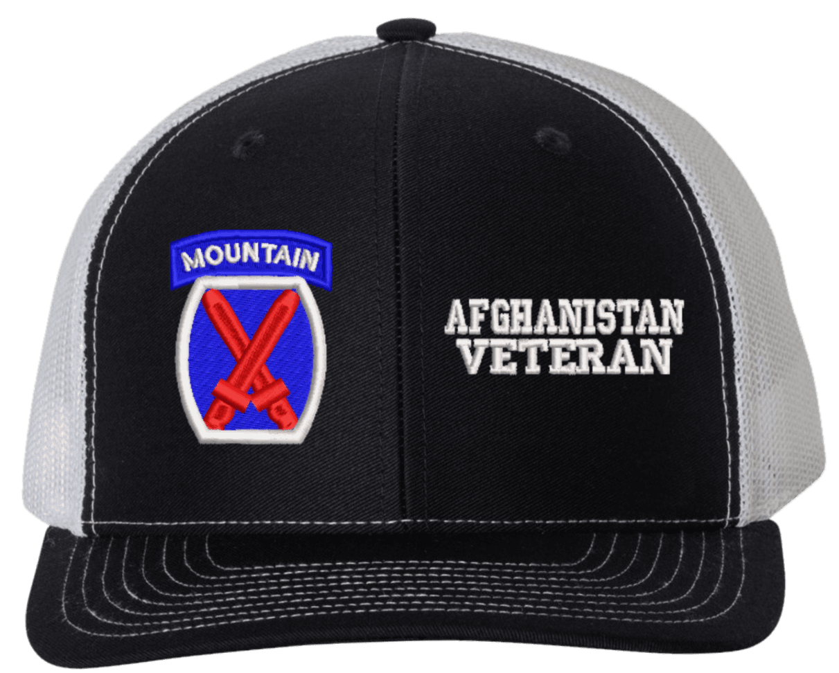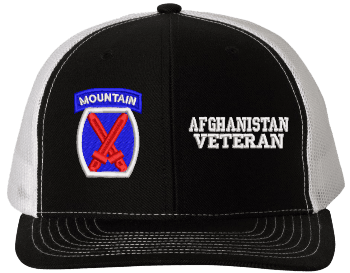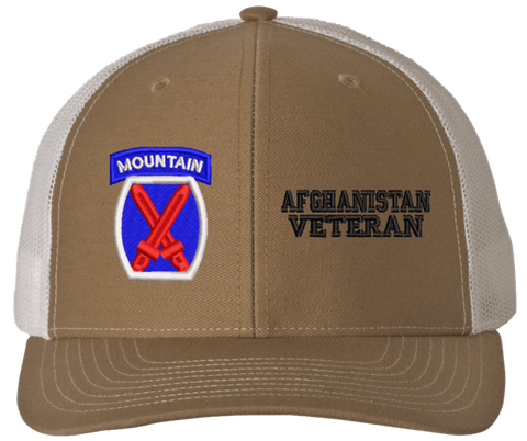 MilitaryBest is proud to offer this Mesh Back 10th Mountain Afghanistan Veteran Split Cap. The 10th Mountain Division Insignia is embroidered onto a 6x panel mid/low profile mesh back cap and is crisp, clean, and sure to be loved by people of all ages! As with all MilitaryBest caps and apparel your satisfaction is guaranteed!Caps ordered with embroidered back text requires an additional 1 to 2 days of production time. All personalized caps will be embroidered in ALL CAPITAL LETTERS. Caps personalized with back text are not returnable unless there is a material defect in the cap.