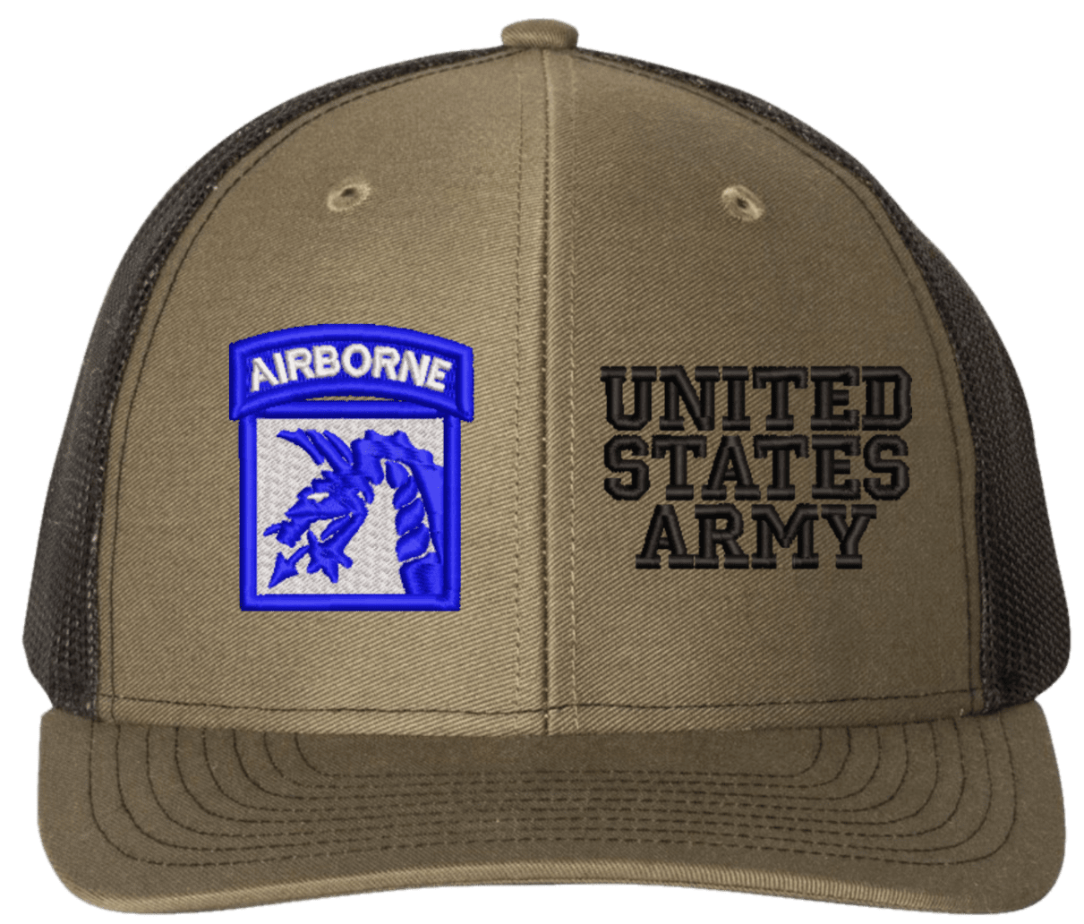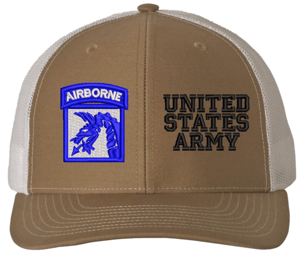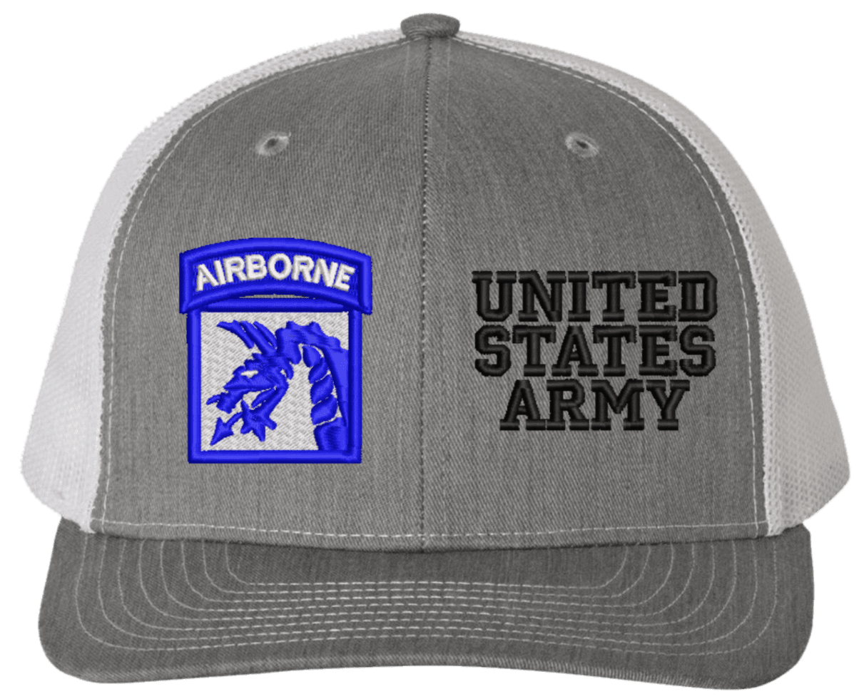 MilitaryBest is proud to offer this Mesh Back 18th Airborne United States Army Split Cap. The 18th Airborne Corps Insignia is embroidered onto a 6x panel mid/low profile mesh back cap and is crisp, clean, and sure to be loved by people of all ages! As with all MilitaryBest caps and apparel your satisfaction is guaranteed!Caps ordered with embroidered back text requires an additional 1 to 2 days of production time. All personalized caps will be embroidered in ALL CAPITAL LETTERS. Caps personalized with back text are not returnable unless there is a material defect in the cap.