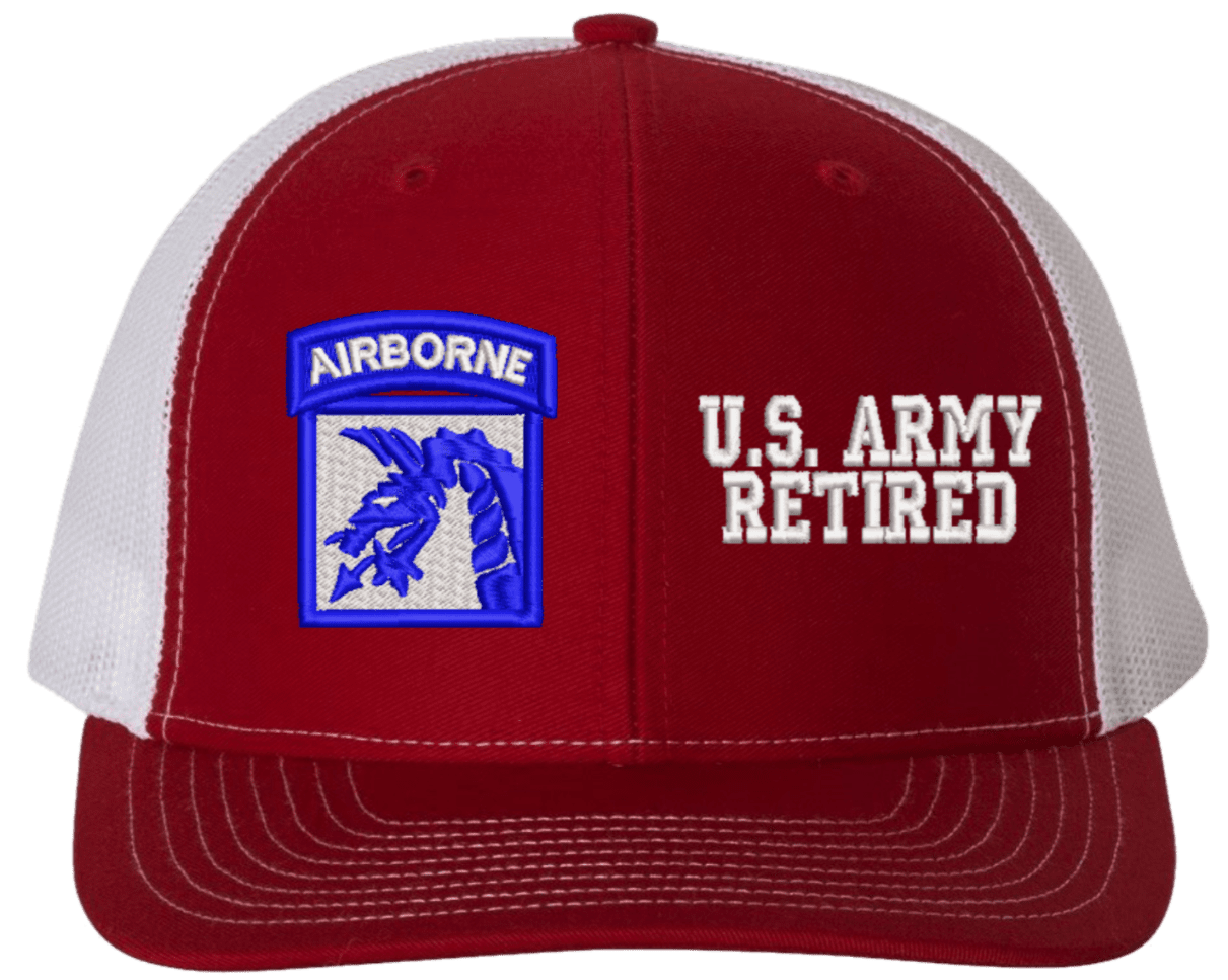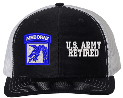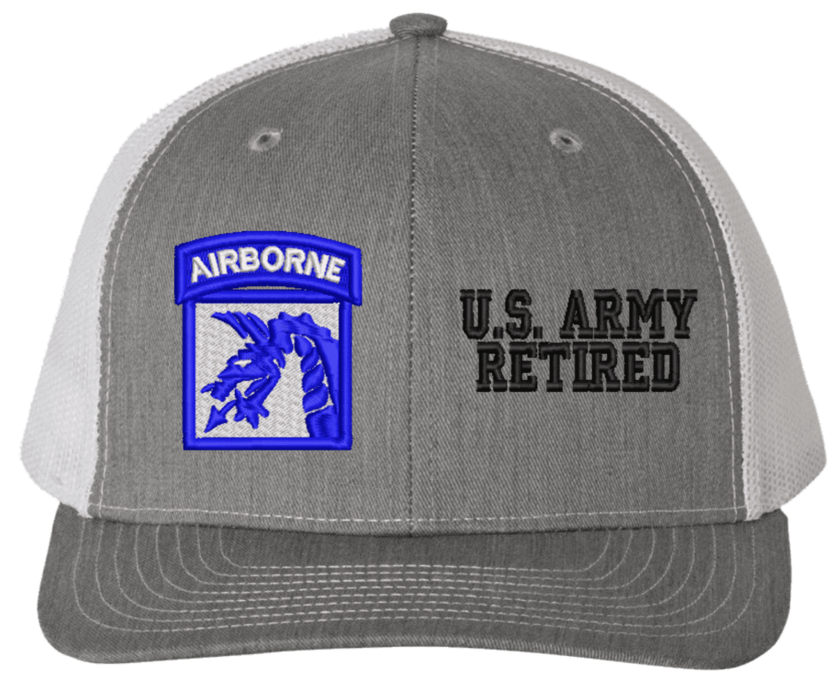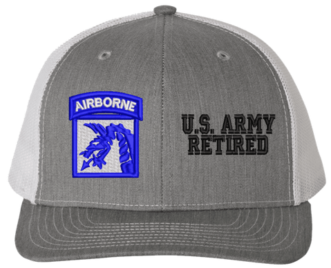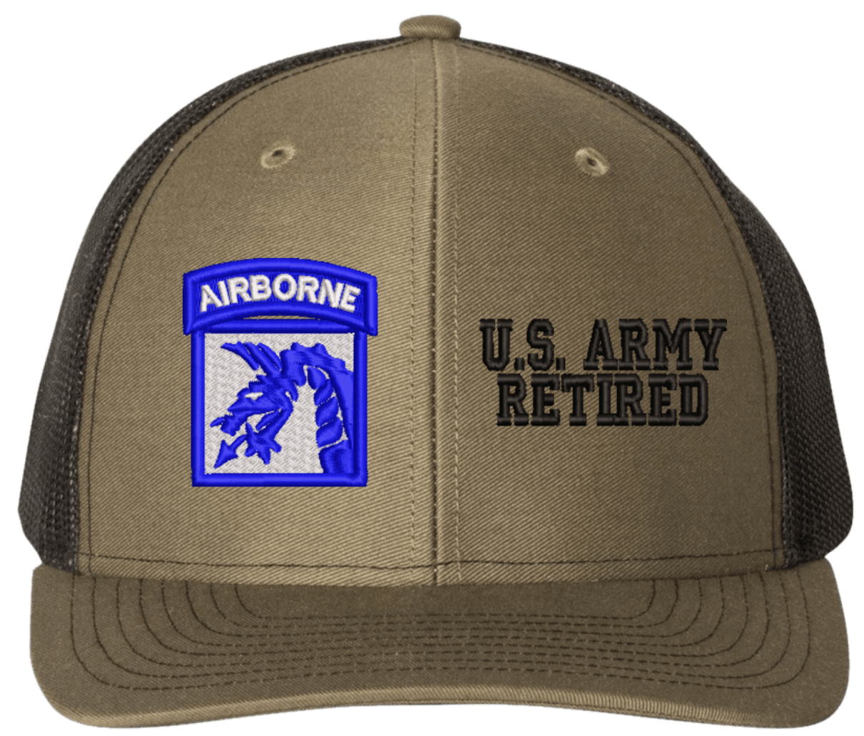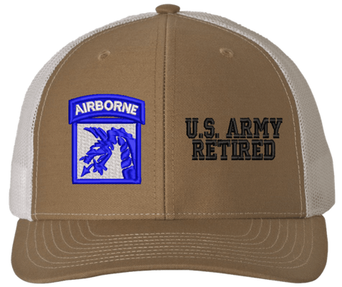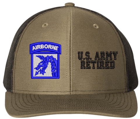 MilitaryBest is proud to offer this Mesh Back 18th Airborne U.S. Army Retired Split Cap. The 18th Airborne Corps Insignia is embroidered onto a 6x panel mid/low profile mesh back cap and is crisp, clean, and sure to be loved by people of all ages! As with all MilitaryBest caps and apparel your satisfaction is guaranteed!Caps ordered with embroidered back text requires an additional 1 to 2 days of production time. All personalized caps will be embroidered in ALL CAPITAL LETTERS. Caps personalized with back text are not returnable unless there is a material defect in the cap.