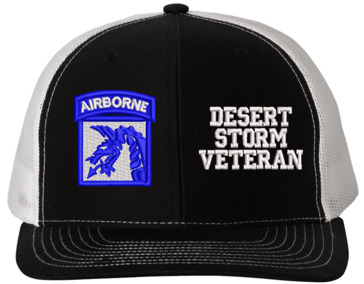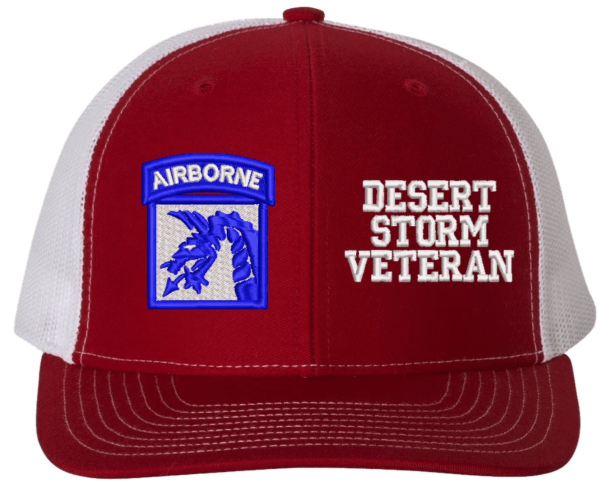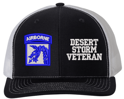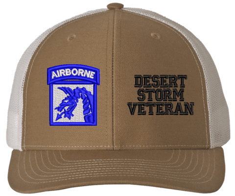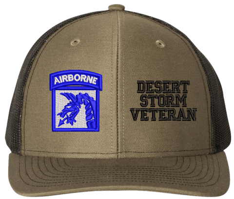 MilitaryBest is proud to offer this Mesh Back 18th Airborne Desert Storm Veteran Split Cap. The 18th Airborne Corps Insignia is embroidered onto a 6x panel mid/low profile mesh back cap and is crisp, clean, and sure to be loved by people of all ages! As with all MilitaryBest caps and apparel your satisfaction is guaranteed!Caps ordered with embroidered back text requires an additional 1 to 2 days of production time. All personalized caps will be embroidered in ALL CAPITAL LETTERS. Caps personalized with back text are not returnable unless there is a material defect in the cap.