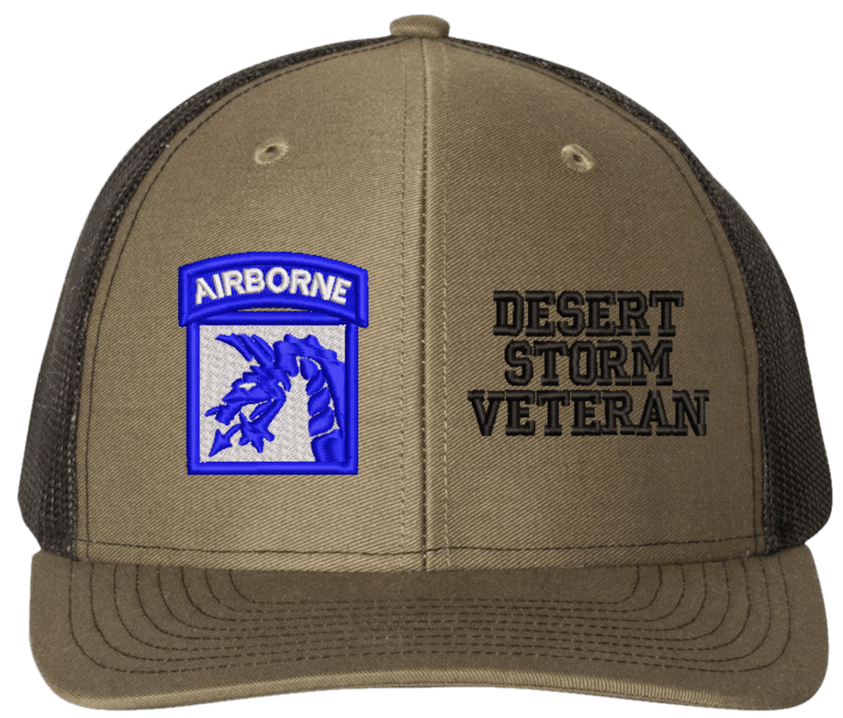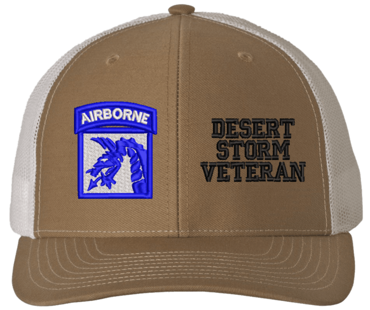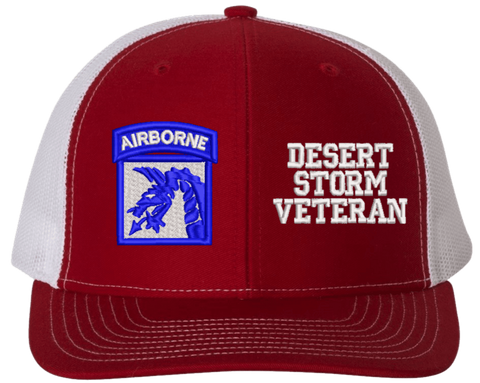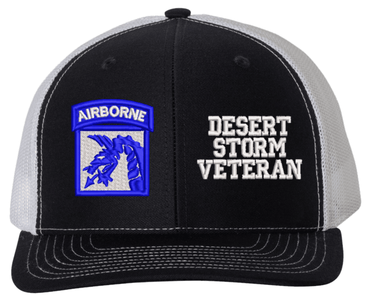 MilitaryBest is proud to offer this Mesh Back 18th Airborne Desert Storm Veteran Split Cap. The 18th Airborne Corps Insignia is embroidered onto a 6x panel mid/low profile mesh back cap and is crisp, clean, and sure to be loved by people of all ages! As with all MilitaryBest caps and apparel your satisfaction is guaranteed!Caps ordered with embroidered back text requires an additional 1 to 2 days of production time. All personalized caps will be embroidered in ALL CAPITAL LETTERS. Caps personalized with back text are not returnable unless there is a material defect in the cap.