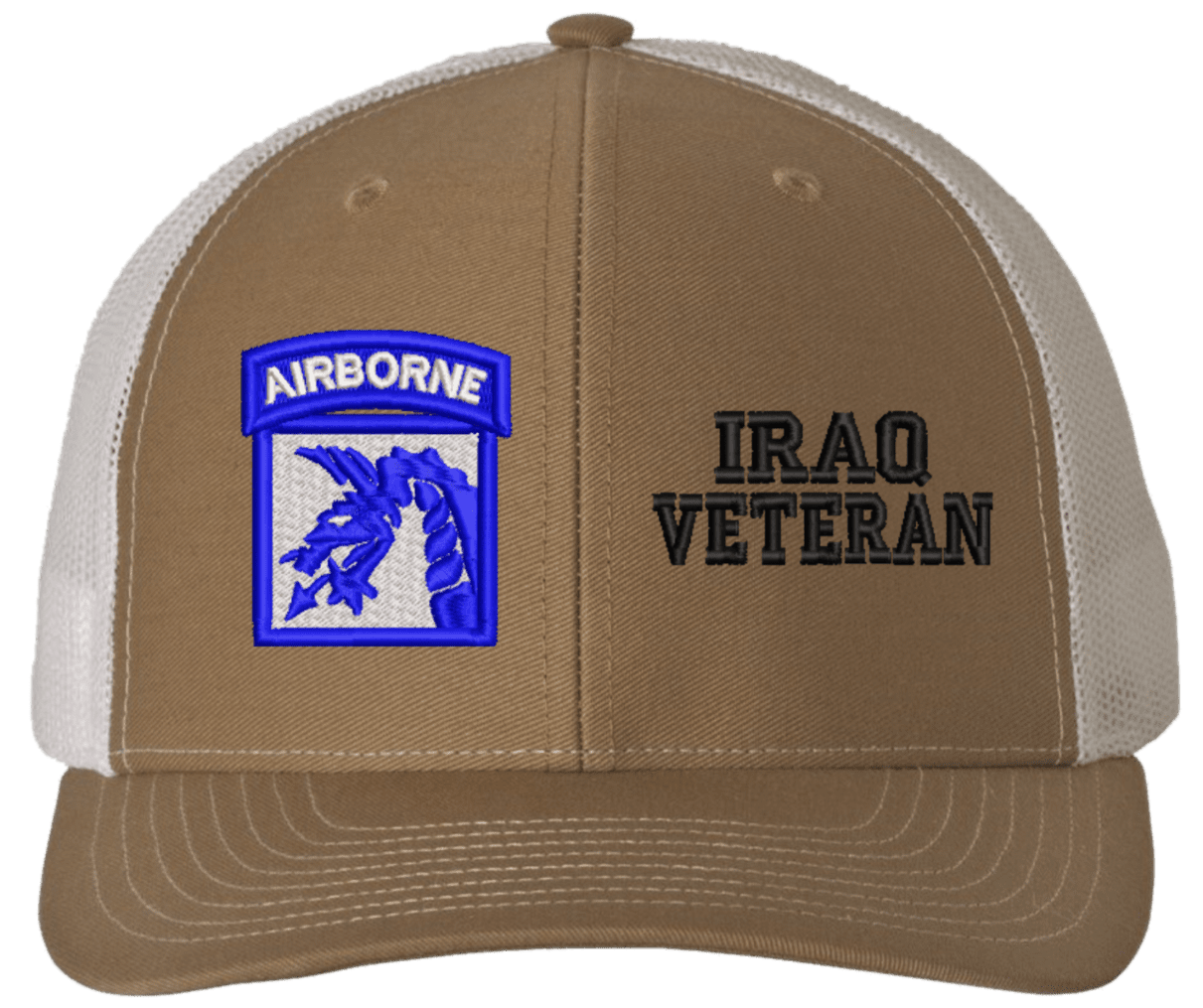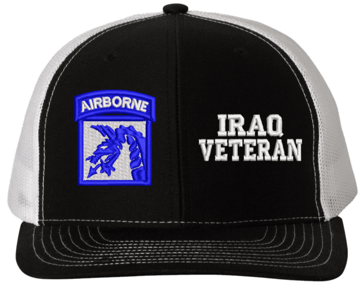 MilitaryBest is proud to offer this Mesh Back 18th Airborne Iraq Veteran Split Cap. The 18th Airborne Corps Insignia is embroidered onto a 6x panel mid/low profile mesh back cap and is crisp, clean, and sure to be loved by people of all ages! As with all MilitaryBest caps and apparel your satisfaction is guaranteed!Caps ordered with embroidered back text requires an additional 1 to 2 days of production time. All personalized caps will be embroidered in ALL CAPITAL LETTERS. Caps personalized with back text are not returnable unless there is a material defect in the cap.