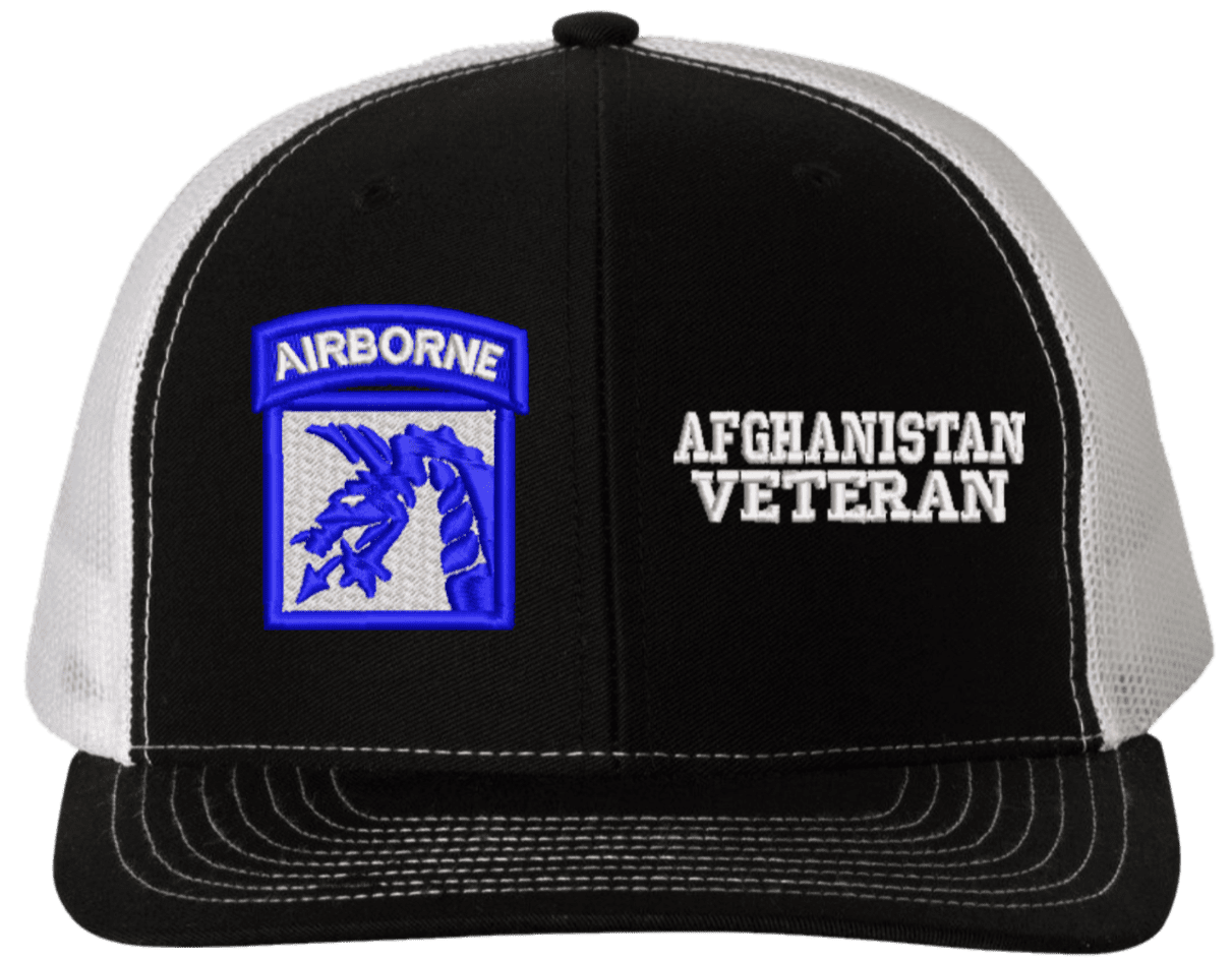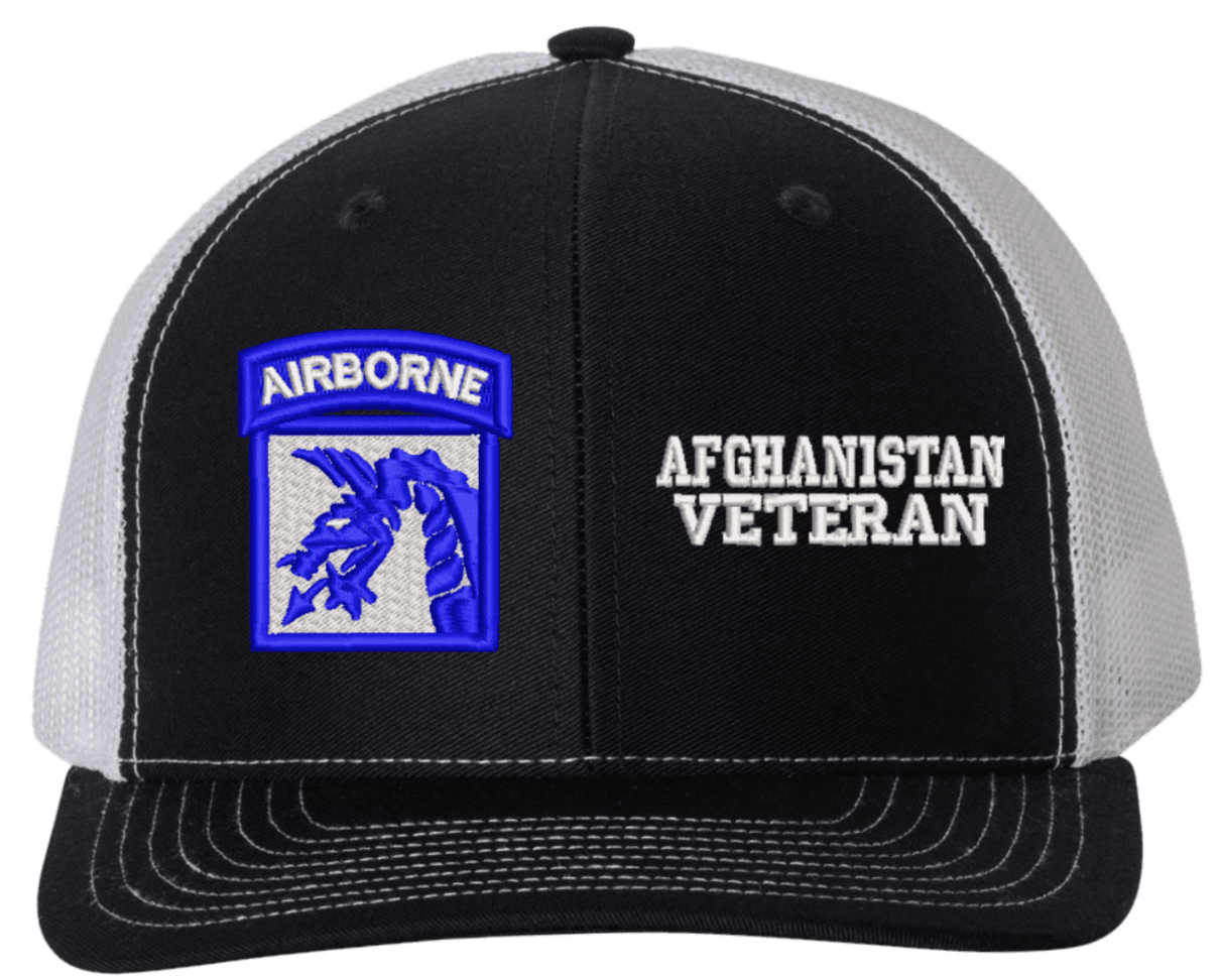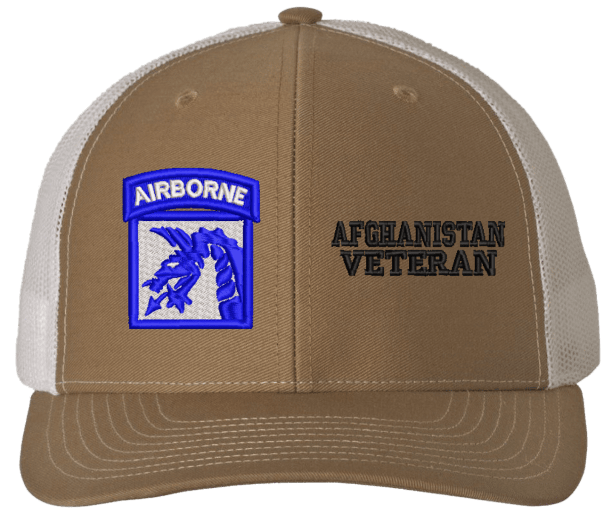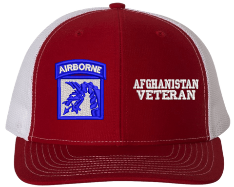 MilitaryBest is proud to offer this Mesh Back 18th Airborne Afghanistan Veteran Split Cap. The 18th Airborne Corps Insignia is embroidered onto a 6x panel mid/low profile mesh back cap and is crisp, clean, and sure to be loved by people of all ages! As with all MilitaryBest caps and apparel your satisfaction is guaranteed!Caps ordered with embroidered back text requires an additional 1 to 2 days of production time. All personalized caps will be embroidered in ALL CAPITAL LETTERS. Caps personalized with back text are not returnable unless there is a material defect in the cap.