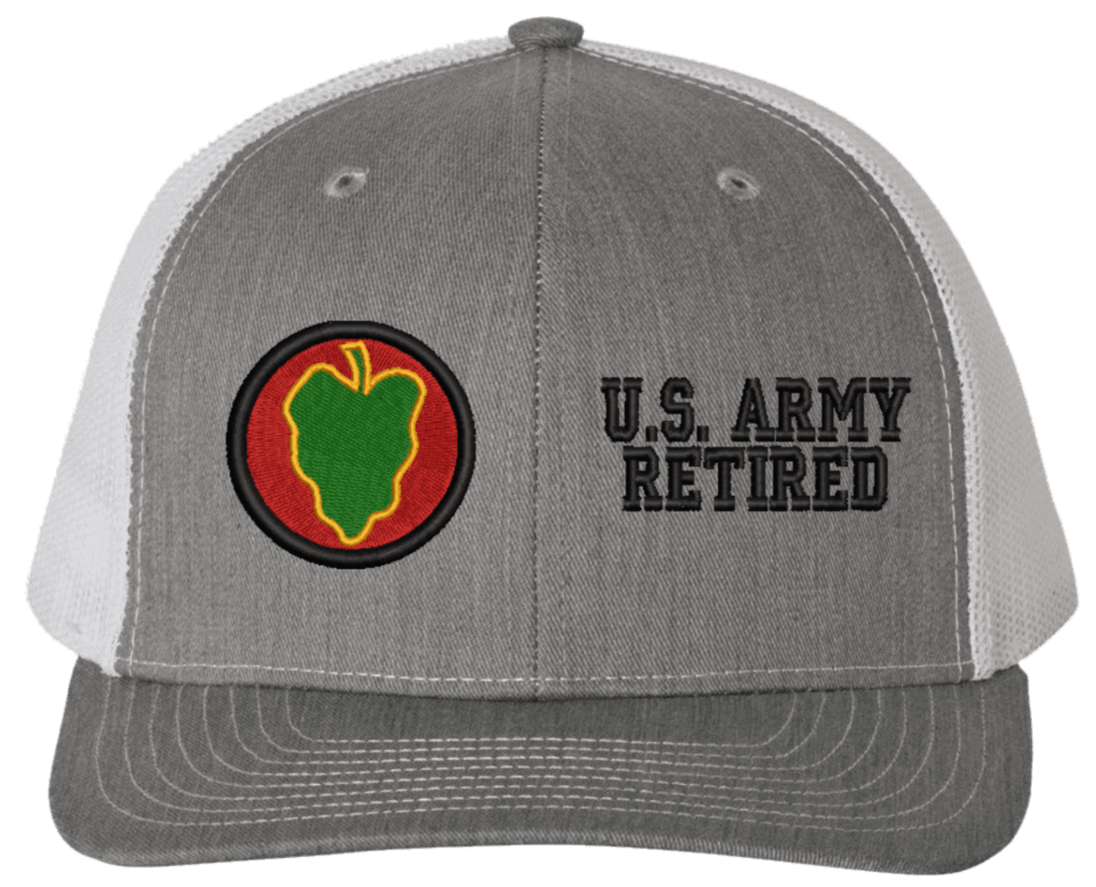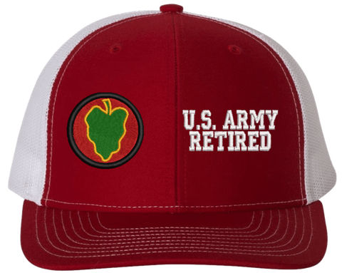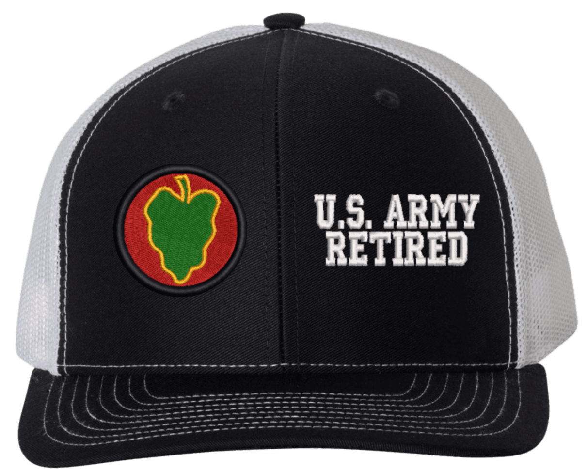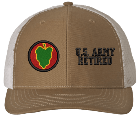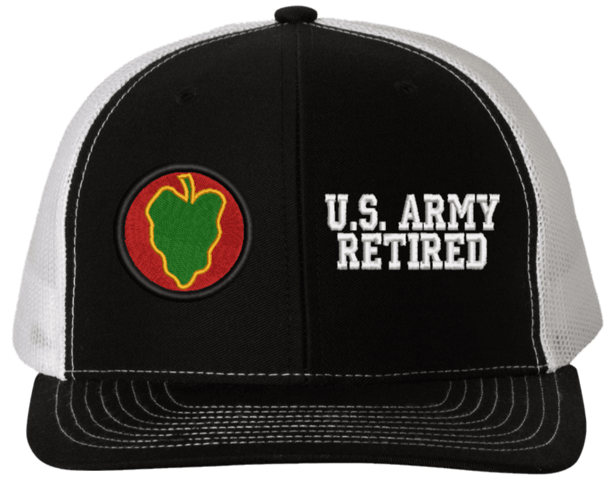 MilitaryBest is proud to offer this Mesh Back 24th Infantry U.S. Army Retired Split Cap. The 24th Infantry Division Insignia is embroidered onto a 6x panel mid/low profile mesh back cap and is crisp, clean, and sure to be loved by people of all ages! As with all MilitaryBest caps and apparel your satisfaction is guaranteed!Caps ordered with embroidered back text requires an additional 1 to 2 days of production time. All personalized caps will be embroidered in ALL CAPITAL LETTERS. Caps personalized with back text are not returnable unless there is a material defect in the cap.