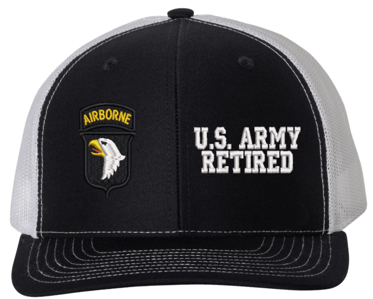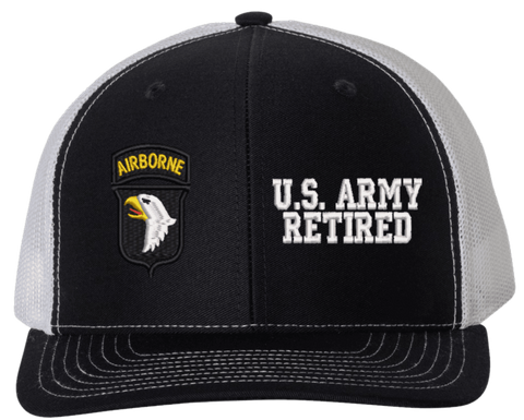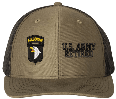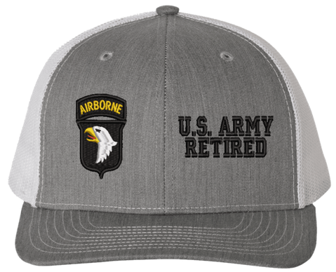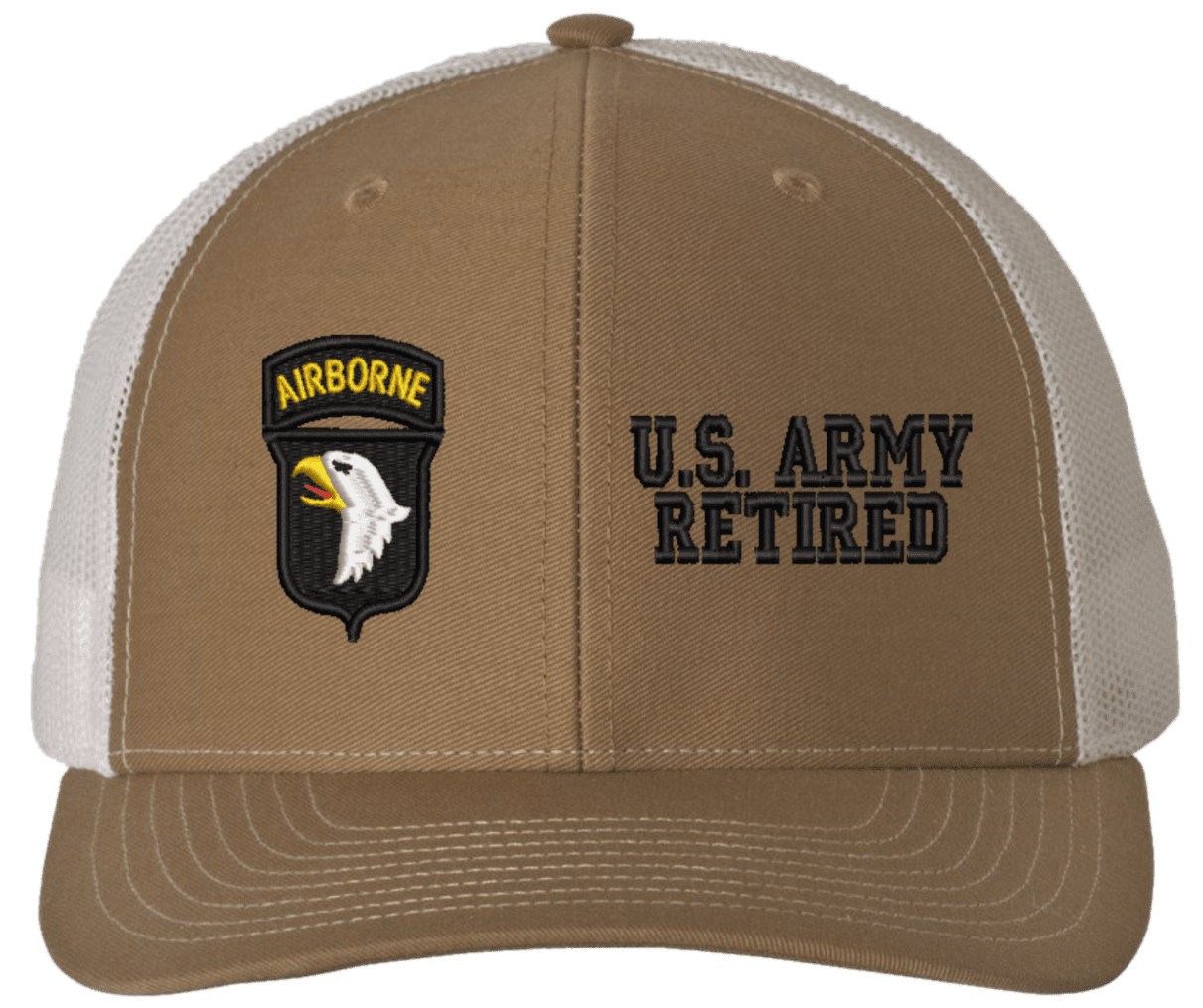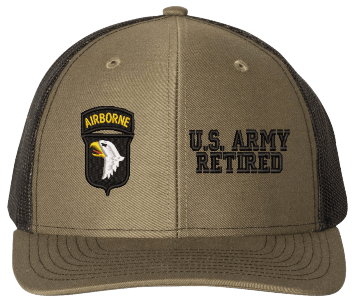 MilitaryBest is proud to offer this Mesh Back 101st Airborne U.S. Army Retired Split Cap. The 101st Airborne Division Insignia is embroidered onto a 6x panel mid/low profile mesh back cap and is crisp, clean, and sure to be loved by people of all ages! As with all MilitaryBest caps and apparel your satisfaction is guaranteed!Caps ordered with embroidered back text requires an additional 1 to 2 days of production time. All personalized caps will be embroidered in ALL CAPITAL LETTERS. Caps personalized with back text are not returnable unless there is a material defect in the cap.