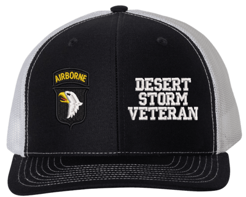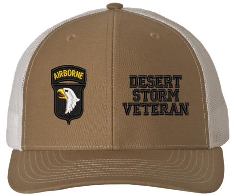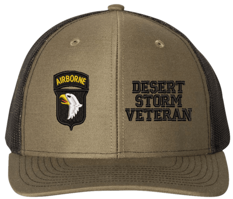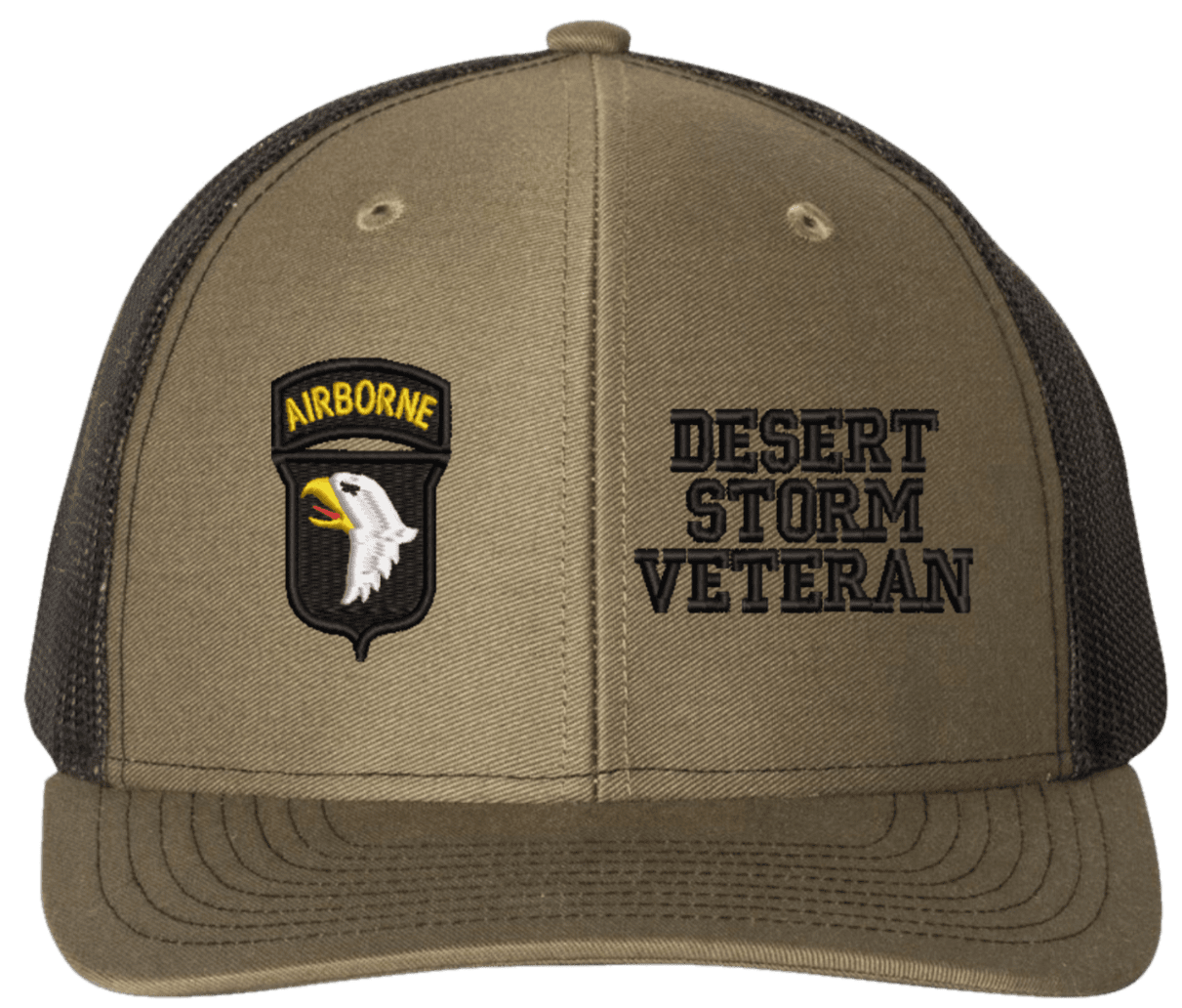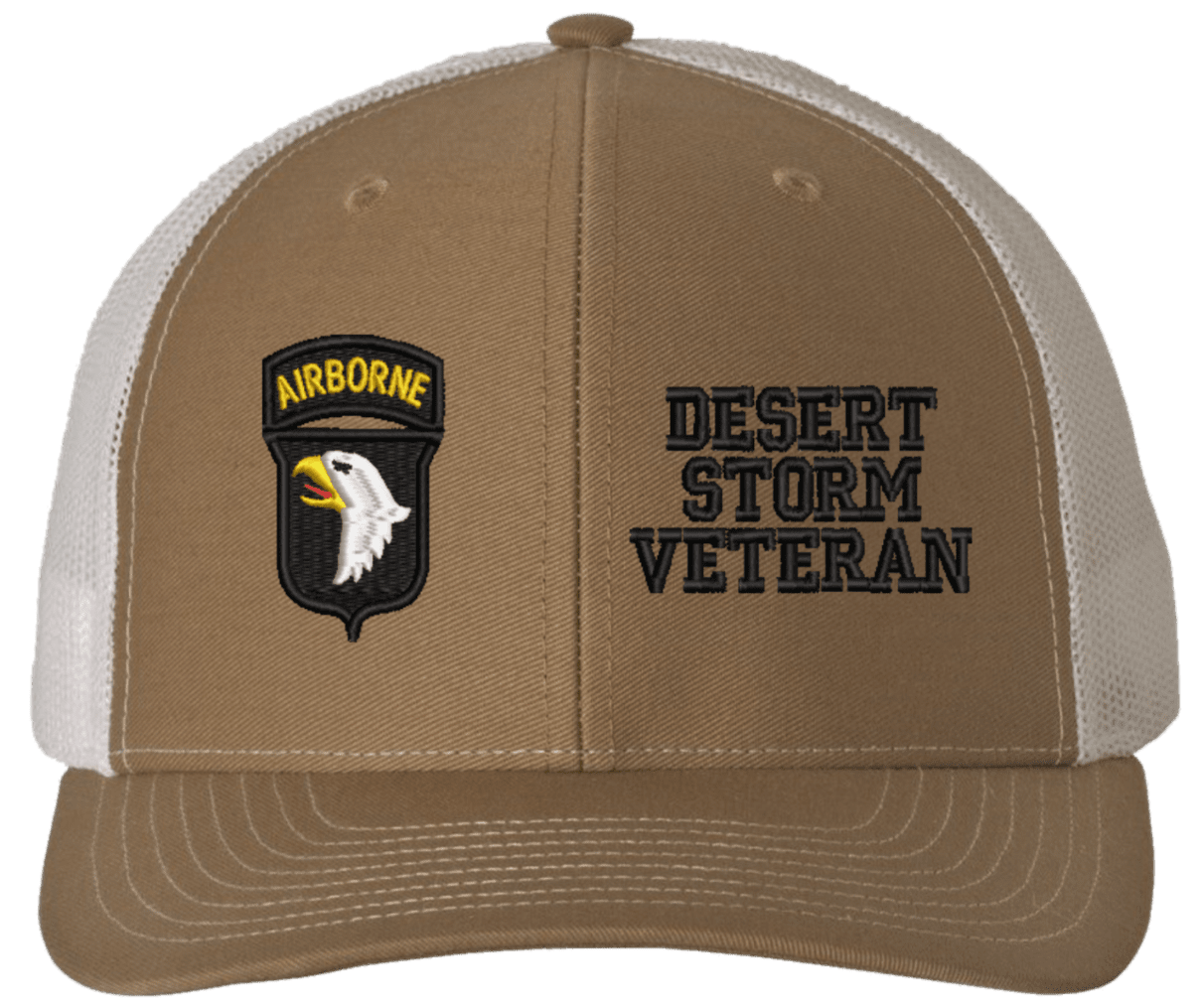 MilitaryBest is proud to offer this Mesh Back 101st Airborne Desert Storm Veteran Split Cap. The 101st Airborne Division Insignia is embroidered onto a 6x panel mid/low profile mesh back cap and is crisp, clean, and sure to be loved by people of all ages! As with all MilitaryBest caps and apparel your satisfaction is guaranteed!Caps ordered with embroidered back text requires an additional 1 to 2 days of production time. All personalized caps will be embroidered in ALL CAPITAL LETTERS. Caps personalized with back text are not returnable unless there is a material defect in the cap.