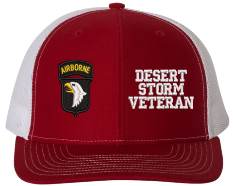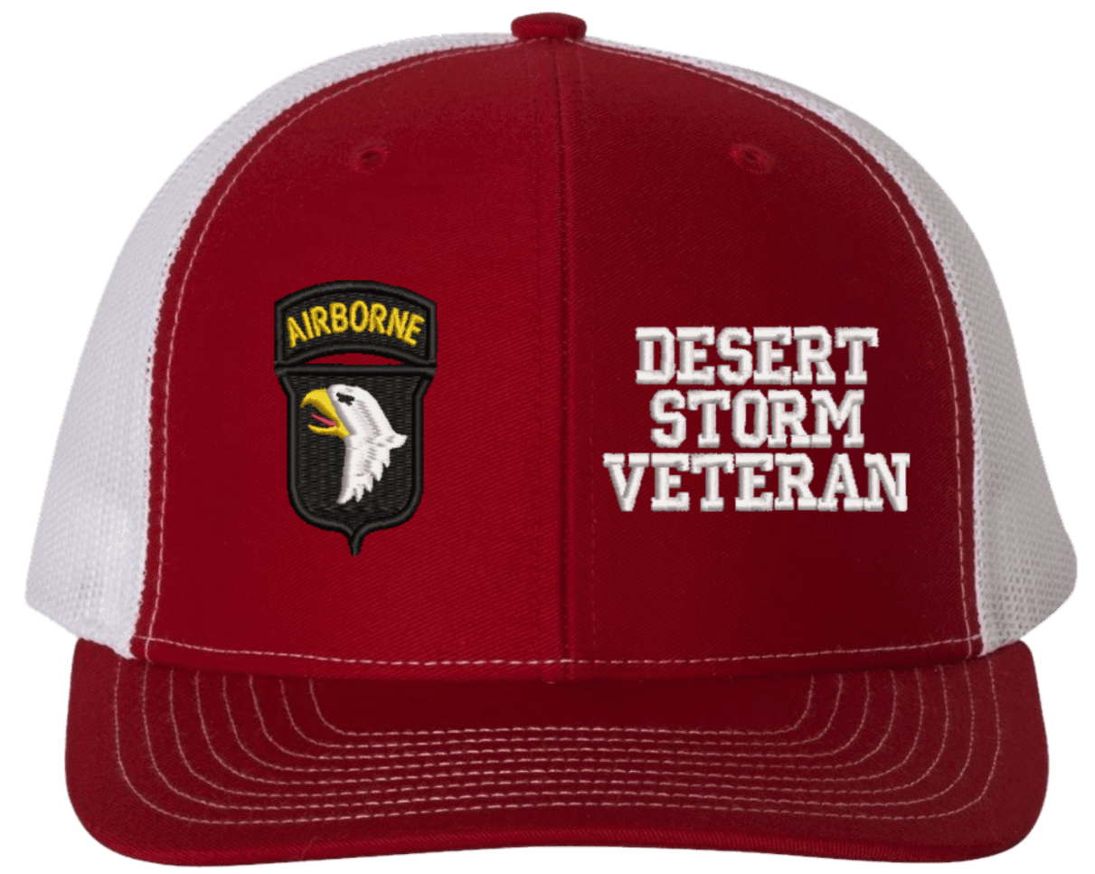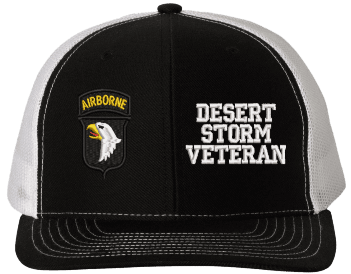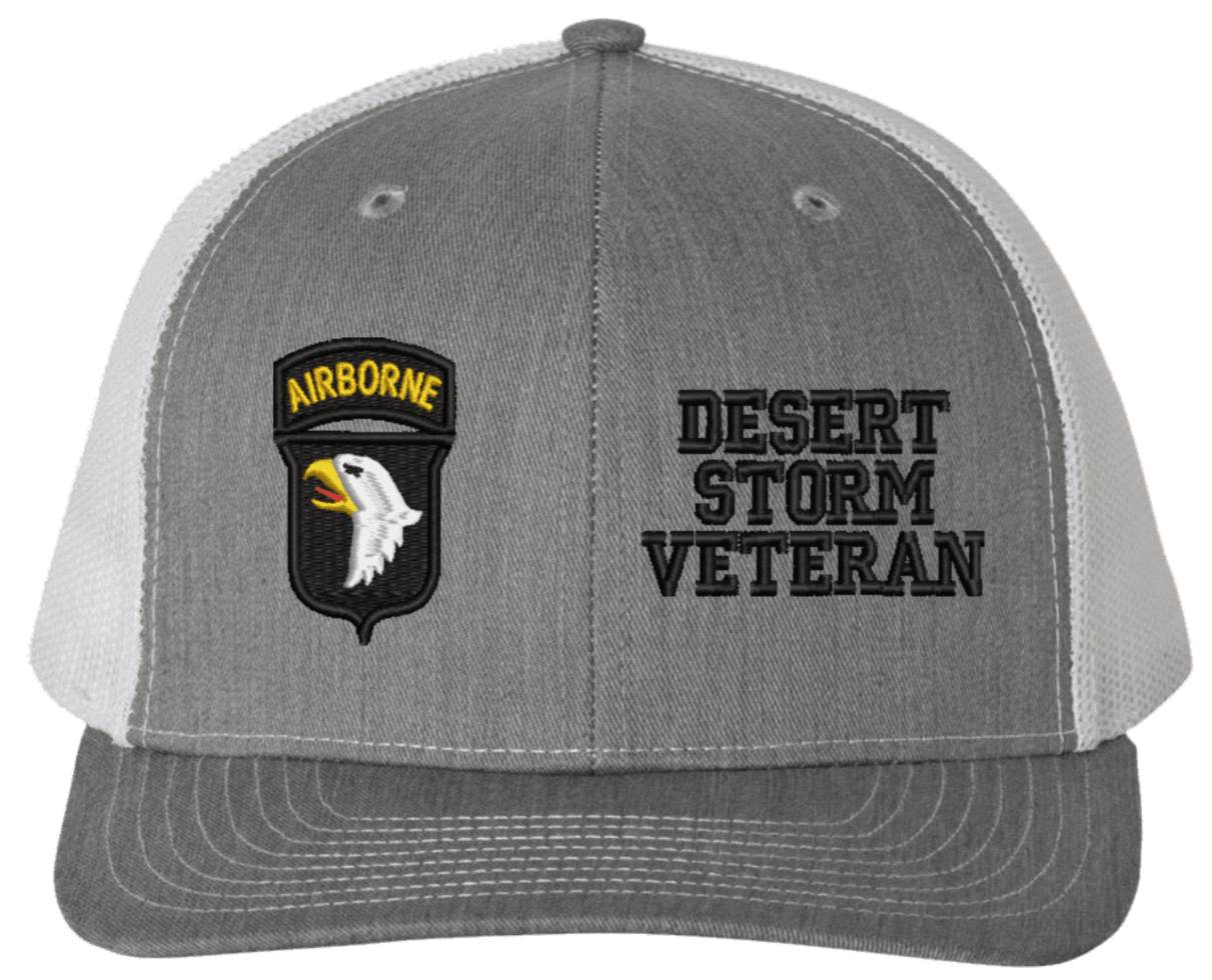 MilitaryBest is proud to offer this Mesh Back 101st Airborne Desert Storm Veteran Split Cap. The 101st Airborne Division Insignia is embroidered onto a 6x panel mid/low profile mesh back cap and is crisp, clean, and sure to be loved by people of all ages! As with all MilitaryBest caps and apparel your satisfaction is guaranteed!Caps ordered with embroidered back text requires an additional 1 to 2 days of production time. All personalized caps will be embroidered in ALL CAPITAL LETTERS. Caps personalized with back text are not returnable unless there is a material defect in the cap.