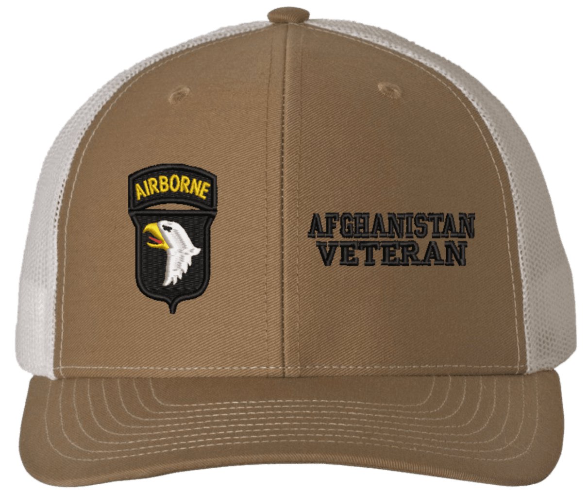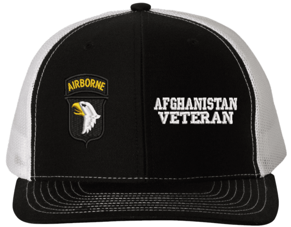 MilitaryBest is proud to offer this Mesh Back 101st Airborne Afghanistan Veteran Split Cap. The 101st Airborne Division Insignia is embroidered onto a 6x panel mid/low profile mesh back cap and is crisp, clean, and sure to be loved by people of all ages! As with all MilitaryBest caps and apparel your satisfaction is guaranteed!Caps ordered with embroidered back text requires an additional 1 to 2 days of production time. All personalized caps will be embroidered in ALL CAPITAL LETTERS. Caps personalized with back text are not returnable unless there is a material defect in the cap.