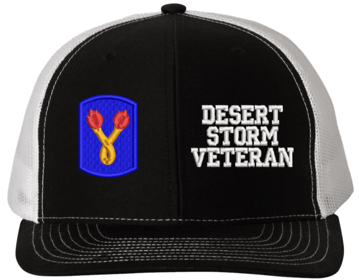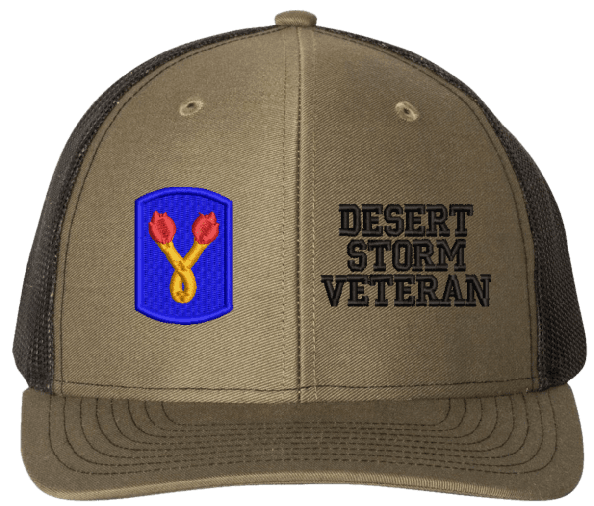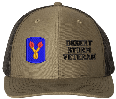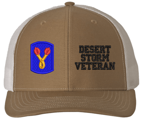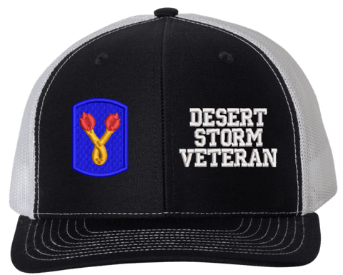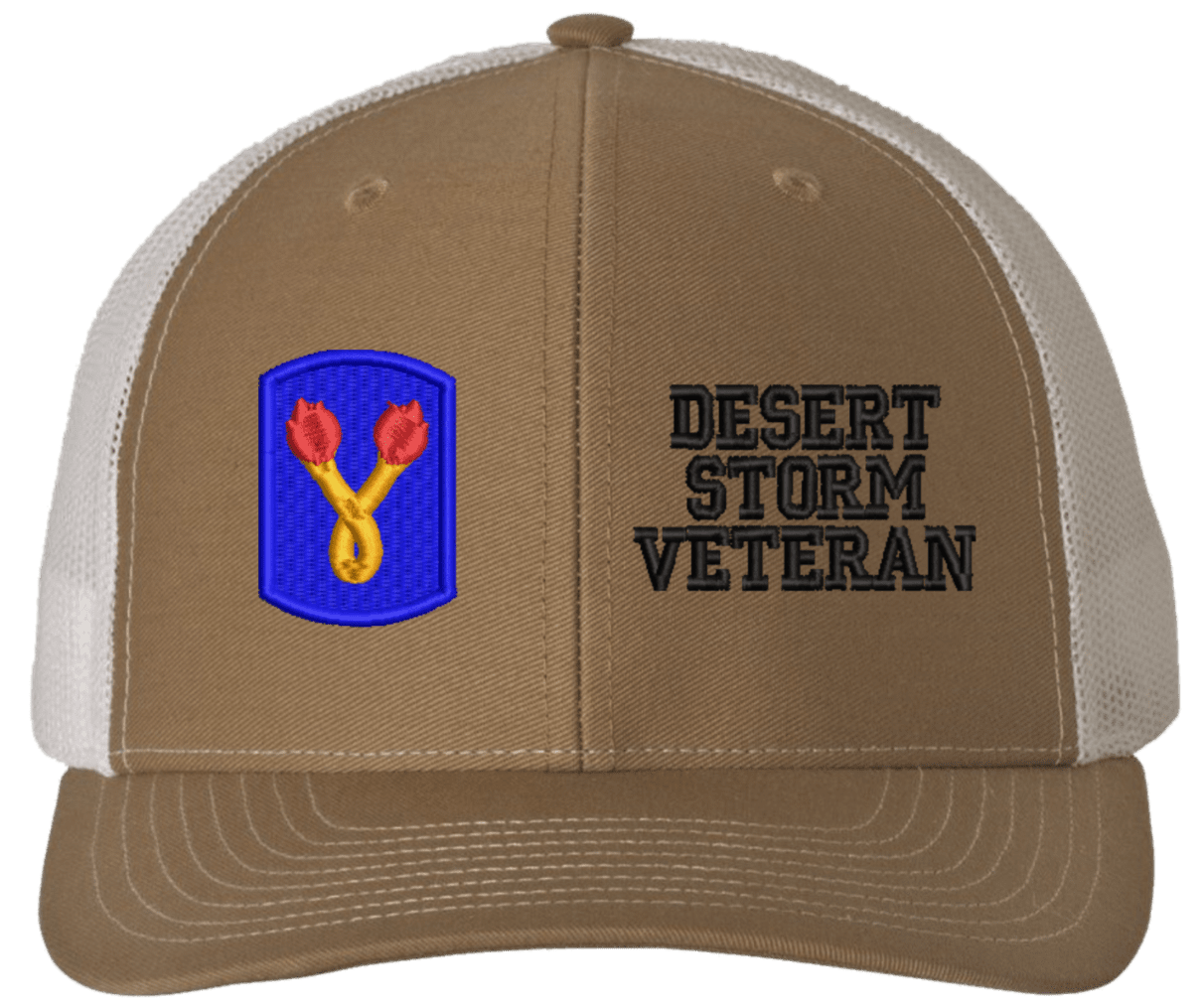 MilitaryBest is proud to offer this Mesh Back 196th Infantry Desert Storm Veteran Split Cap. The 196th Infantry Brigade Insignia is embroidered onto a 6x panel mid/low profile mesh back cap and is crisp, clean, and sure to be loved by people of all ages! As with all MilitaryBest caps and apparel your satisfaction is guaranteed!Caps ordered with embroidered back text requires an additional 1 to 2 days of production time. All personalized caps will be embroidered in ALL CAPITAL LETTERS. Caps personalized with back text are not returnable unless there is a material defect in the cap.