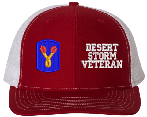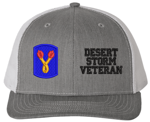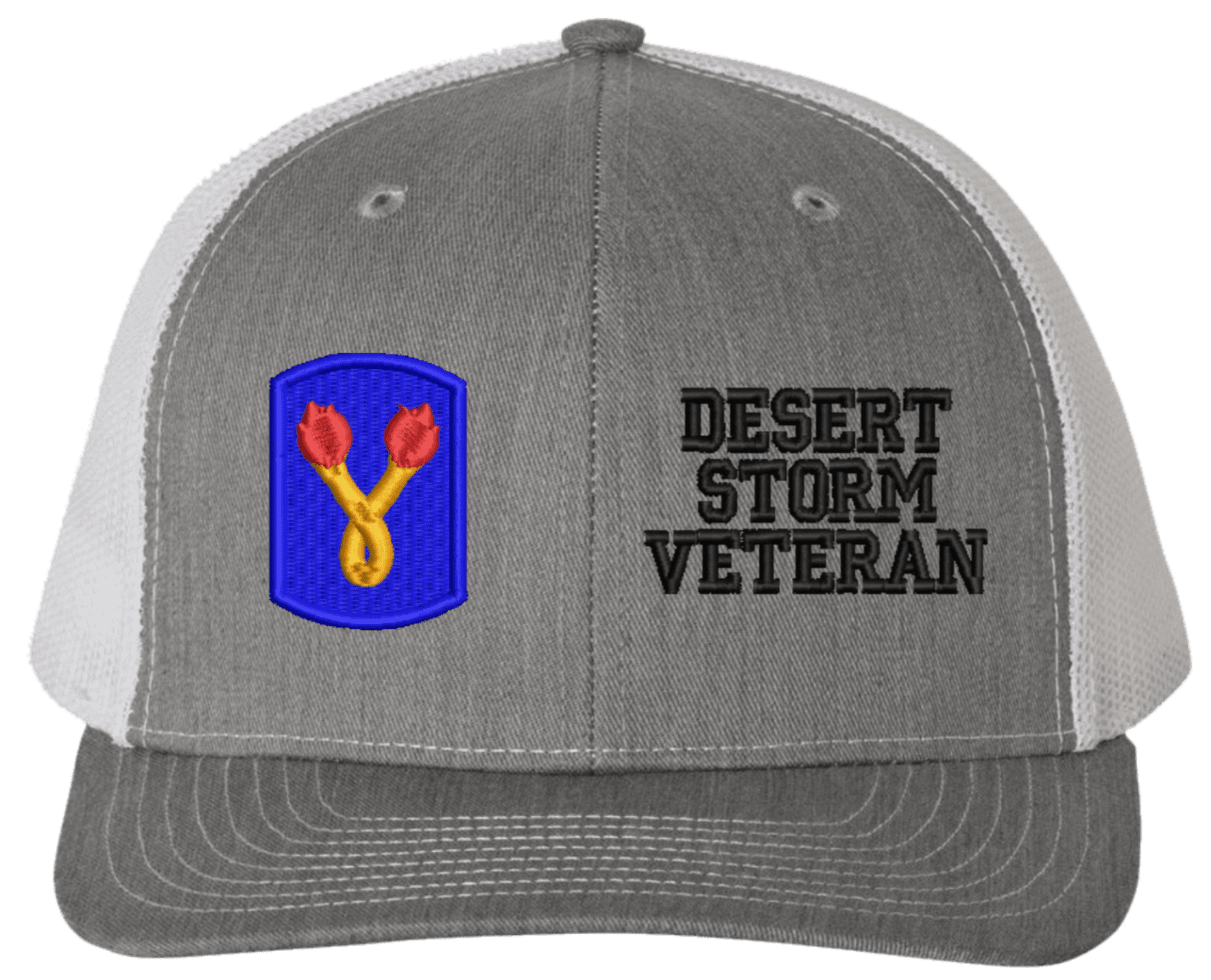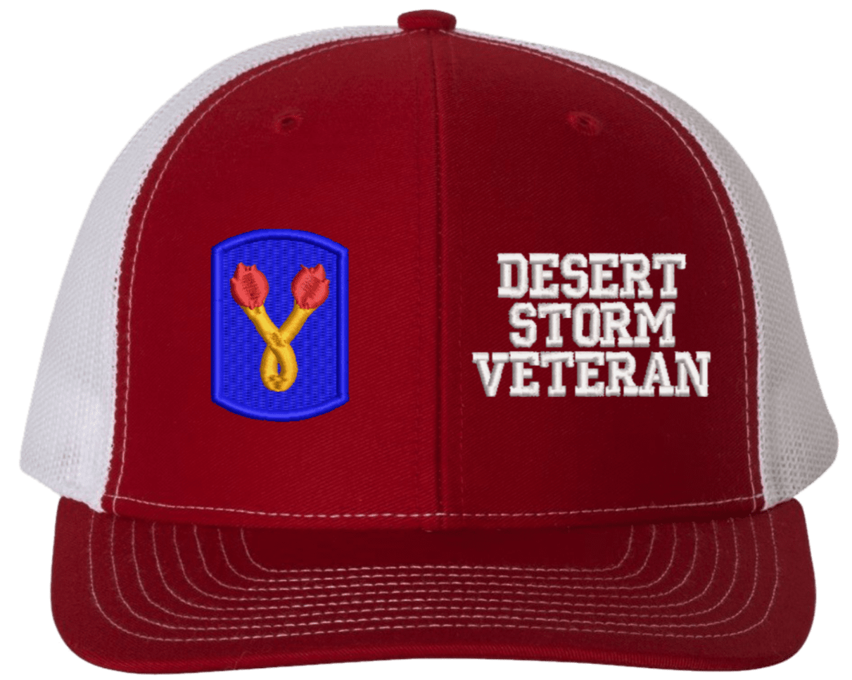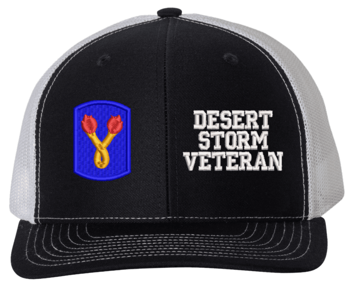 MilitaryBest is proud to offer this Mesh Back 196th Infantry Desert Storm Veteran Split Cap. The 196th Infantry Brigade Insignia is embroidered onto a 6x panel mid/low profile mesh back cap and is crisp, clean, and sure to be loved by people of all ages! As with all MilitaryBest caps and apparel your satisfaction is guaranteed!Caps ordered with embroidered back text requires an additional 1 to 2 days of production time. All personalized caps will be embroidered in ALL CAPITAL LETTERS. Caps personalized with back text are not returnable unless there is a material defect in the cap.