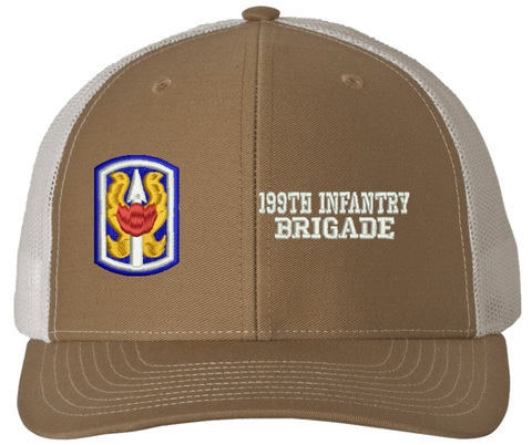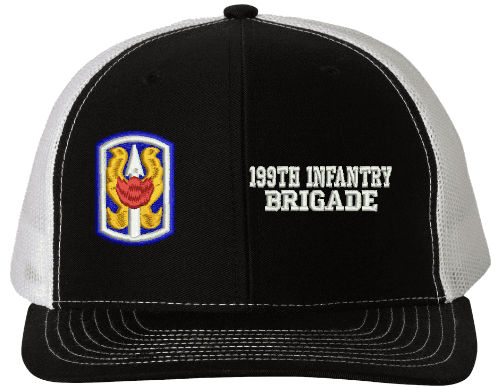 MilitaryBest is proud to offer this Mesh Back 199th Infantry Brigade Split Cap. The 199th Infantry Brigade Insignia is embroidered onto a 6x panel mid/low profile mesh back cap and is crisp, clean, and sure to be loved by people of all ages! As with all MilitaryBest caps and apparel your satisfaction is guaranteed!Caps ordered with embroidered back text requires an additional 1 to 2 days of production time. All personalized caps will be embroidered in ALL CAPITAL LETTERS. Caps personalized with back text are not returnable unless there is a material defect in the cap.