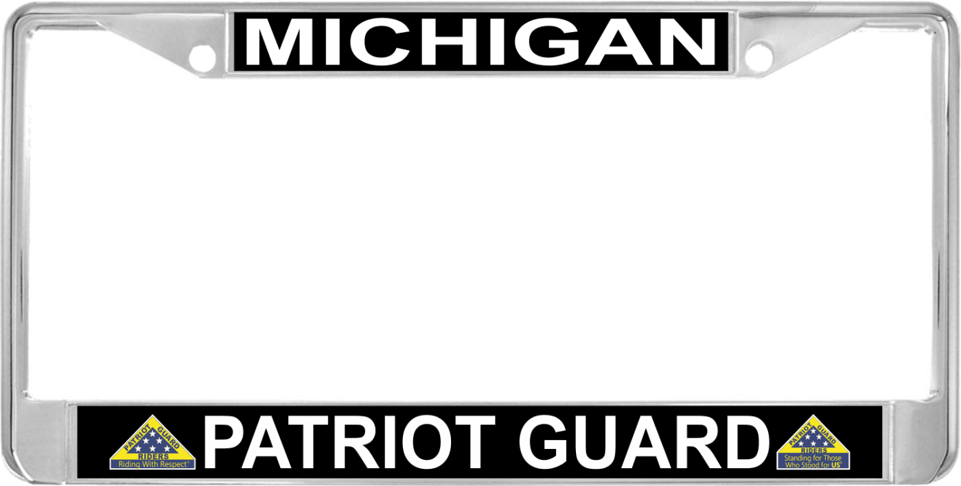 This Michigan Patriot Guard Automobile License Plate Frame is proudly produced at our facility in Scottsboro, Alabama. Each Chrome Dipped Alloy Frame has Poly Coated Aluminum Inserts which allow our production team to provide you with High Quality Designs. Unfortunately, this frame is not offered as a Motorcycle Frame.Please check with your state and local regulations regarding suitability for displaying this Automobile License Plate Frame on your vehicle since these regulations may have changed in your state. Various weather and road conditions may impact the life span of your frame e.g. salted roads, long exposure to direct sunlight etc.